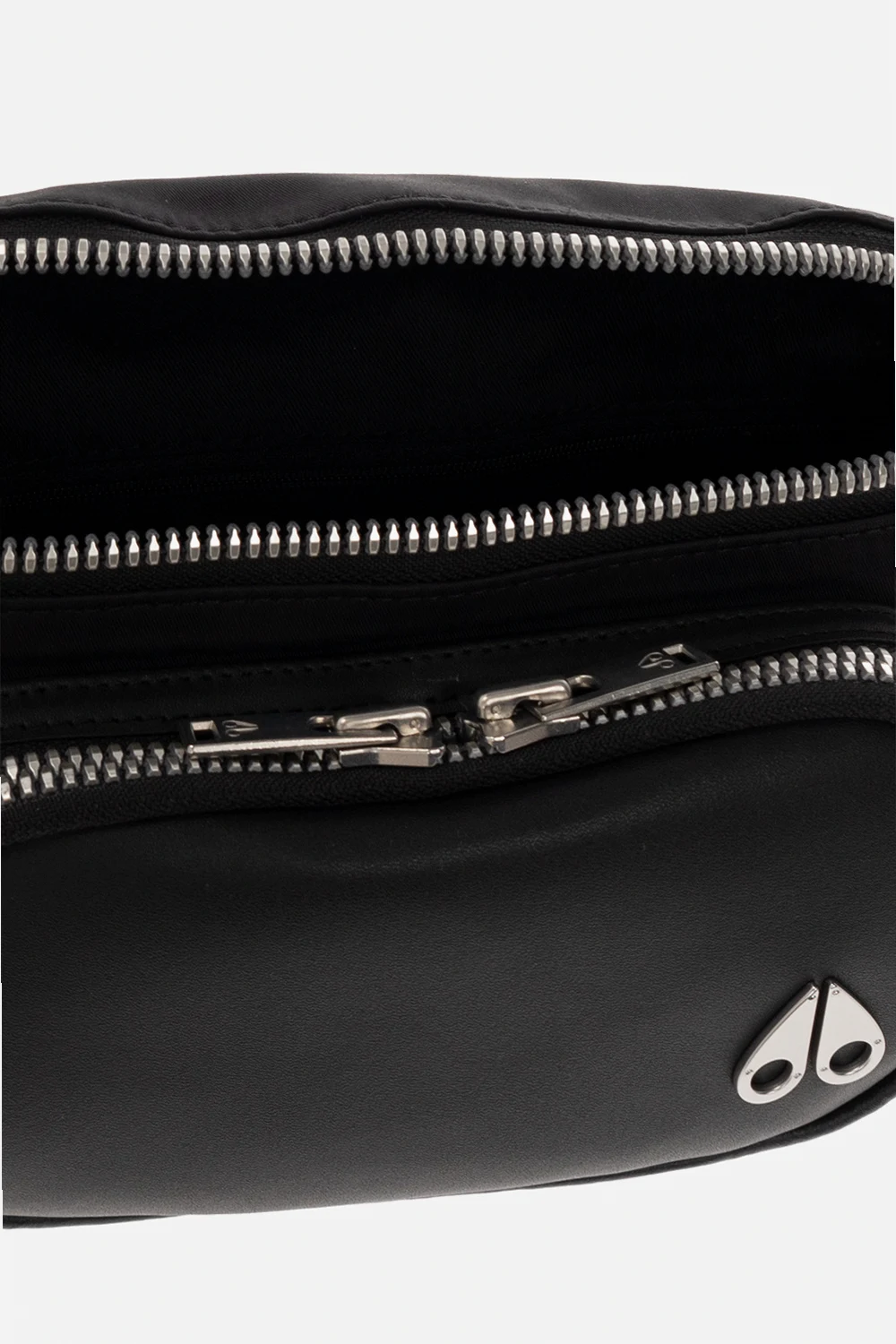 Black belt bag from Moose Knuckles. Crafted from fabric and leather, this design fastens with a two-way zipper and features a frontal pocket with a two-way zipper and monogram hardware, an adjustable strap with a jacquard logo motif, silver-tone metal elements and one internal compartment with a zip pocket.
