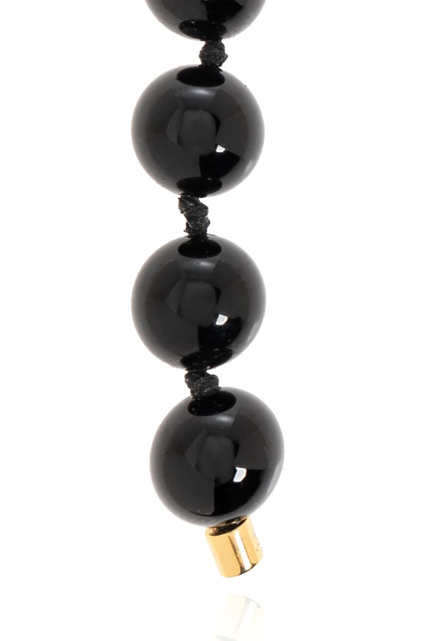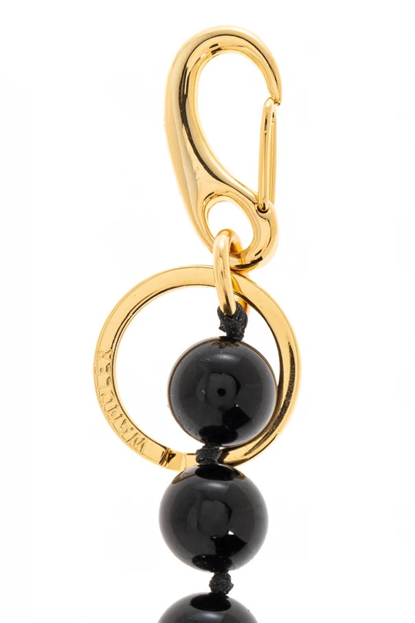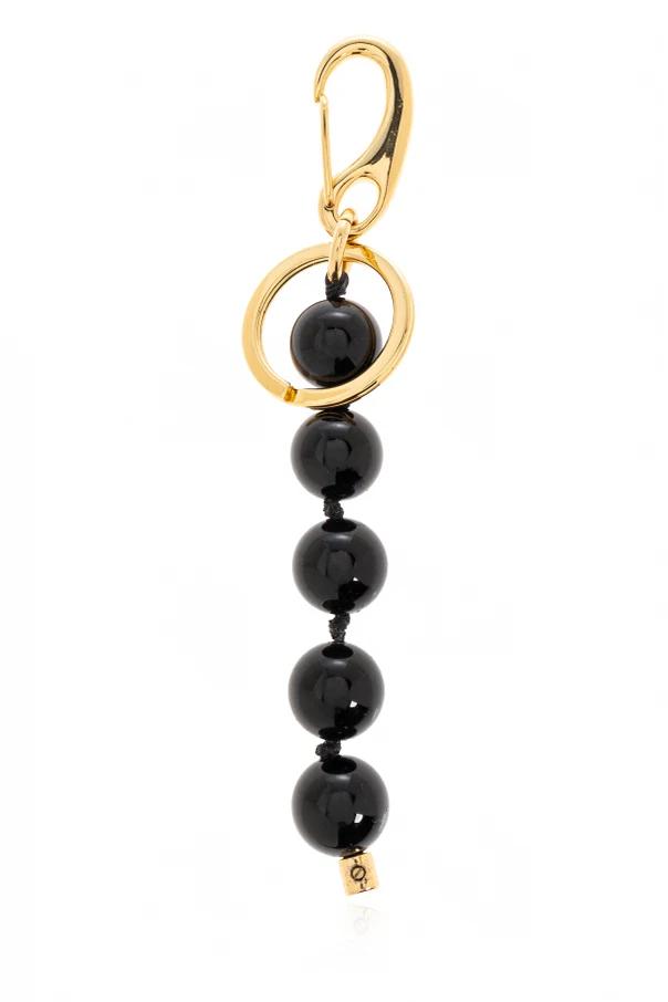 Introducing the exquisite Bag Charm from the exclusive Wandler collection. This elegant accessory showcases a linear design composed of several vertically aligned, glossy black spheres. Each sphere is meticulously strung together on a sleek black cord, culminating in a captivating golden decorative element. The charm's simplistic yet sophisticated aesthetic is enhanced by its high-quality materials, featuring black, lustrous spheres and metallic gold accents. A prominent golden carabiner and ring ensure seamless attachment to any bag, with the ring boasting an engraved inscription that hints at the brand's prestige. Incorporating the refined vision of designer Elza Wandler, a luminary who has enchanted the fashion world since 2017, this charm embodies her commitment to a harmonious blend of femininity and androgyny. Why choose this product? Exclusively crafted design from the renowned Wandler collection. High-quality materials with a timeless gold and black color scheme. Elegant linear shape with distinctive engraved detailing. Versatile accessory for enhancing the sophistication of any bag.