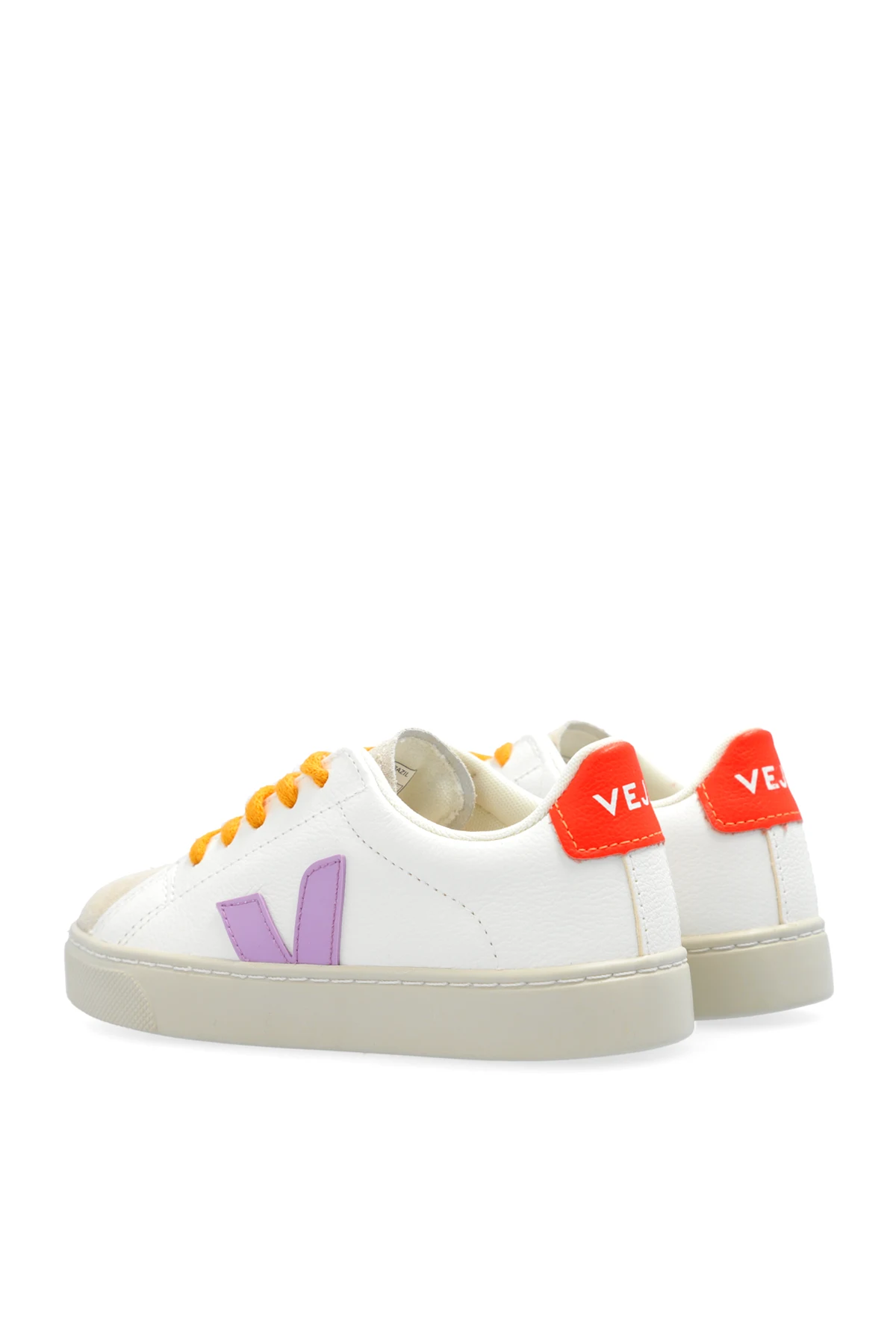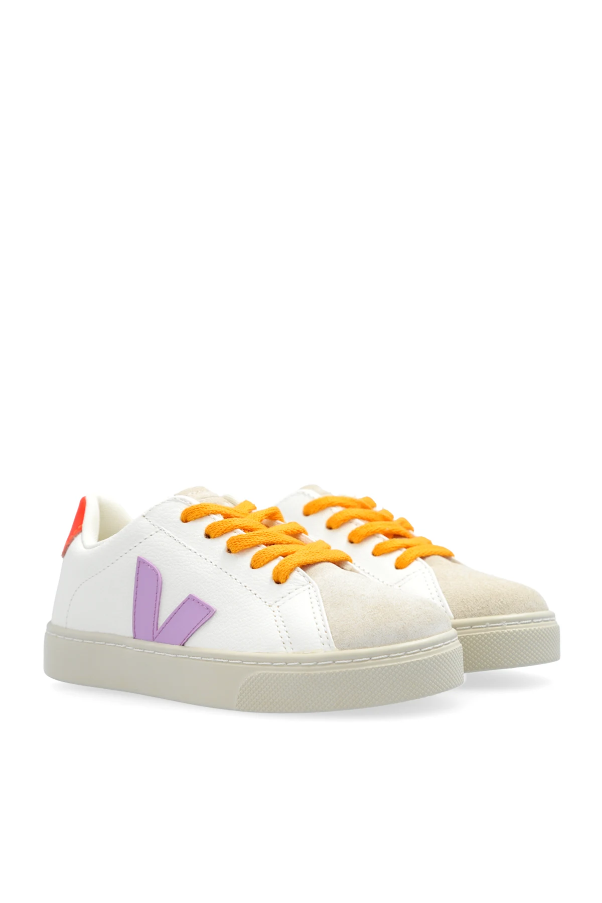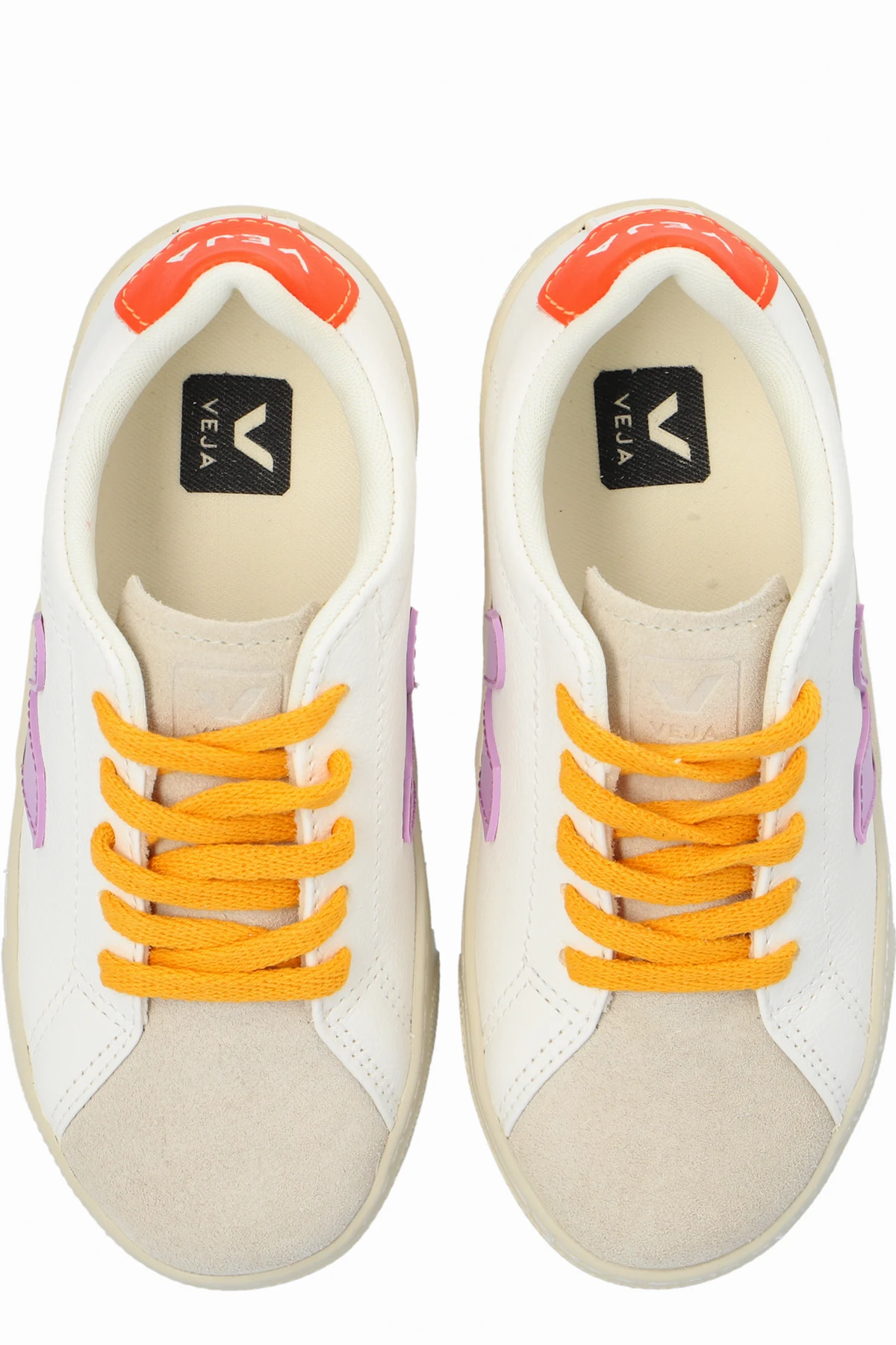 Introducing the exceptional V-10 kids' sports shoes by Veja, which captivate with their modern design and functionality. These shoes, predominantly in white, feature a classic low-top sneaker style with a smooth, monochromatic surface and contrasting details. Made from the highest quality leather and synthetic material, with a suede-like front, they ensure comfort and durability. A large purple "V" logo adorns the side of the shoe, while the heel tab features the "VEJA" lettering on a red background. Orange laces and a beige/cream sole add elegance and style to the shoes. The interior of the shoes, kept in a light color, is equipped with an insole bearing the "VEJA" logo, emphasizing the brand's attention to detail and comfort. The Veja brand, founded by Sébastien Kopp and François-Ghislain Morillion, is renowned for producing footwear from ecological materials, such as vegetable-tanned leather, organic cotton, and natural rubber. Why should you buy this product? Elegant and modern design, perfect for any occasion. Made from eco-friendly materials, supporting environmental protection. Exceptional durability and comfort. Subtle yet distinctive details of the Veja brand. Perfect for kids, teaching responsibility for the planet.