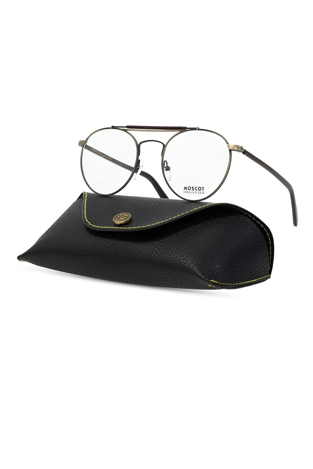 Black and grey ‘Lazer’ eyeglasses from Moscot. This handcrafted model comes with a case and a canvas bag with a logo print in grey and yellow.