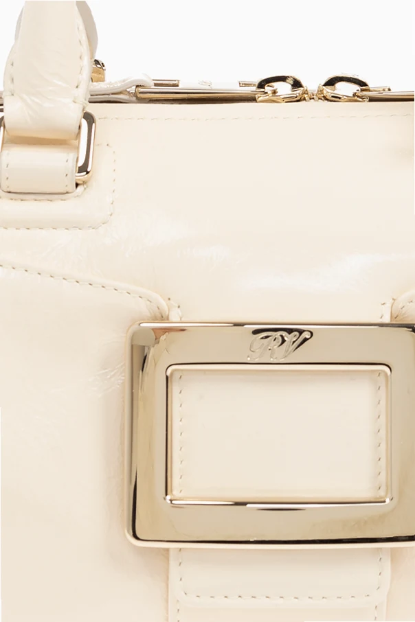 Introducing the sublime Torba do ręki by the illustrious designer Roger Vivier . This exquisite handbag is a masterpiece of craftsmanship, artfully woven from a material reminiscent of rattan, and adorned in a delicate beige hue. Its rectangular silhouette is accentuated by a prominent decorative square with metallic accents on the front, exuding sophistication.