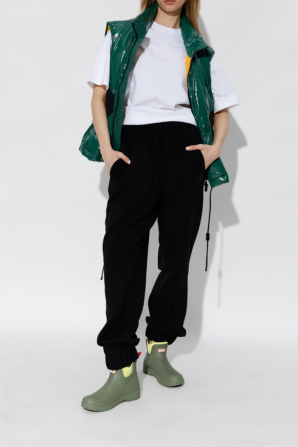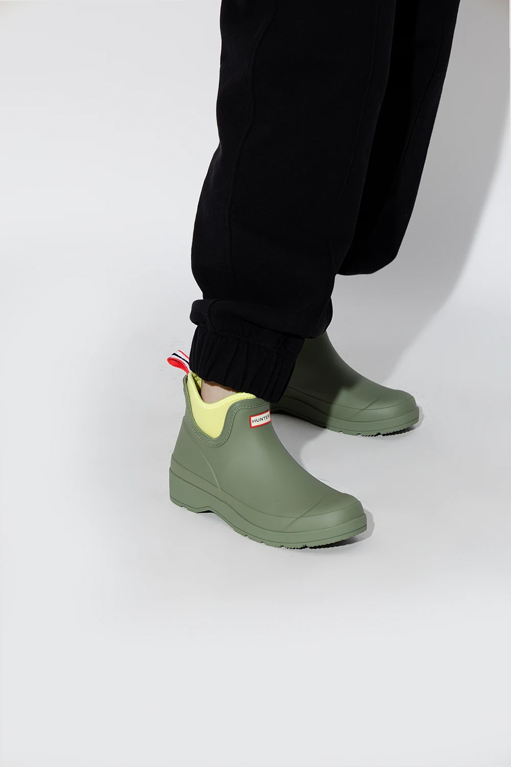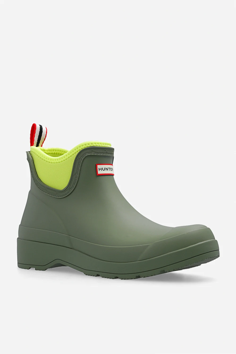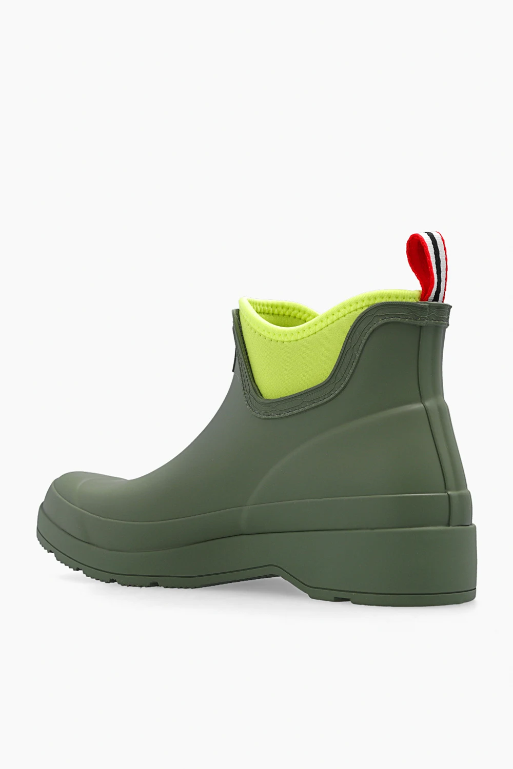 Green ‘Play Chelsea’ rain boots from Hunter. Handcrafted from vulcanized natural rubber with a matte finish, this pair features a logo detail on the front, fabric handle in white, red and navy at the back, light green lining and rubber sole with the signature Hunter Original tread.