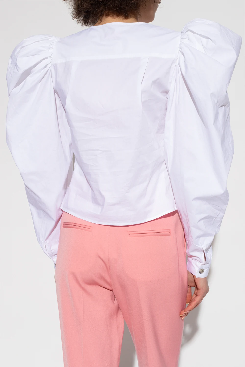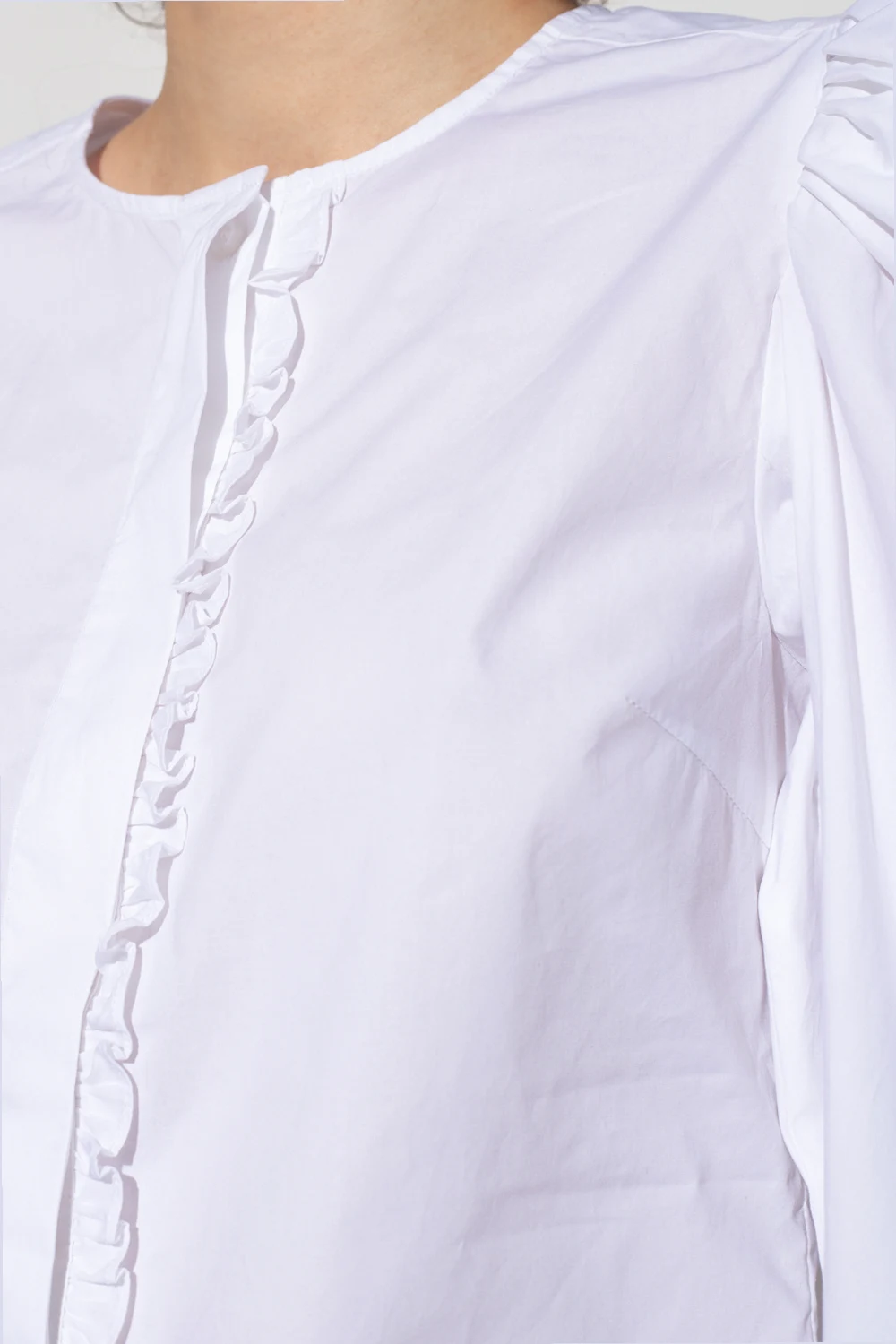 White ‘Beri’ shirt from Custommade. Crafted from organic cotton, this style features button fastenings with a concealed placket, distinctive ruffle detailing and blouson sleeves with cuffs.