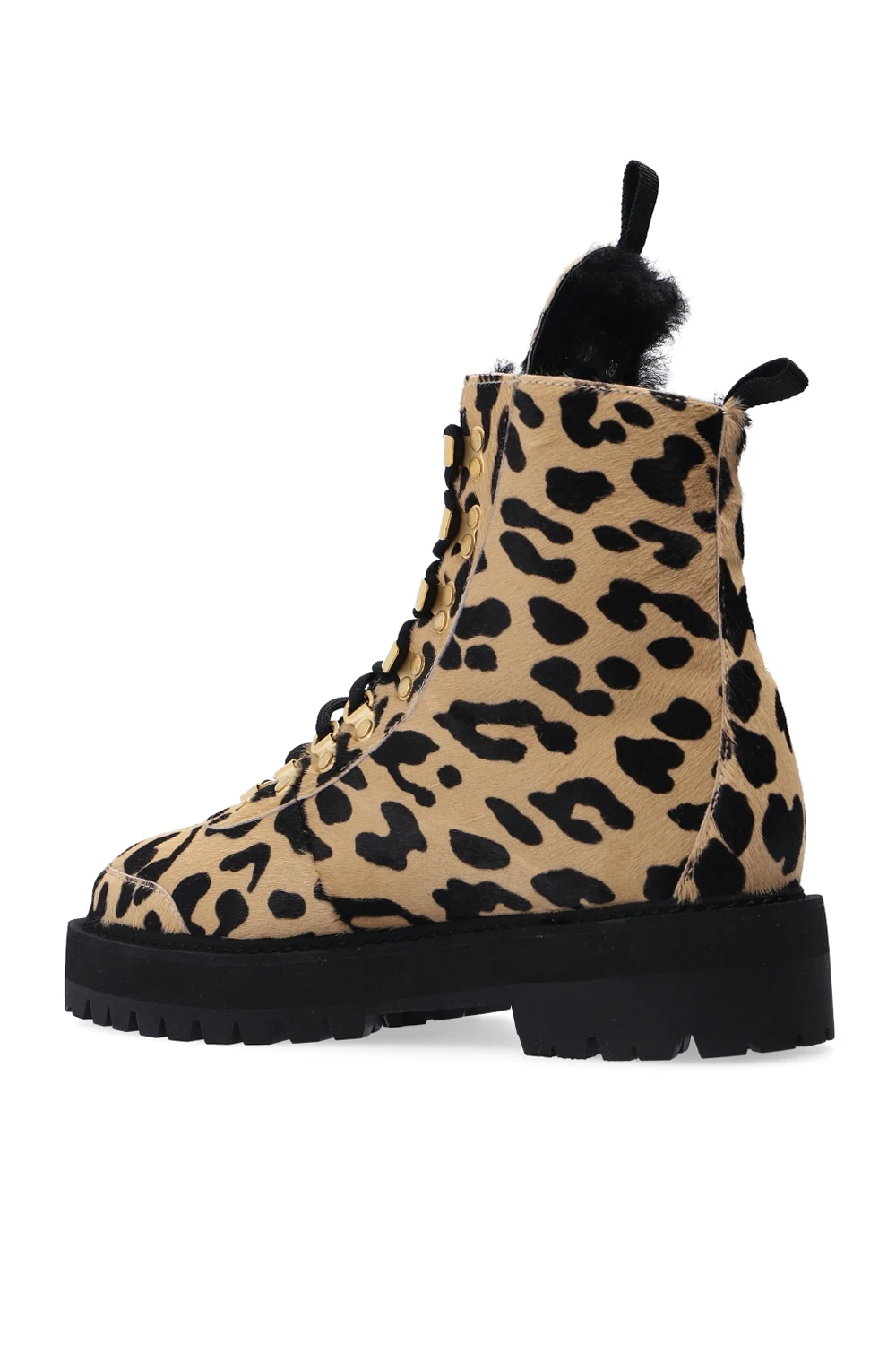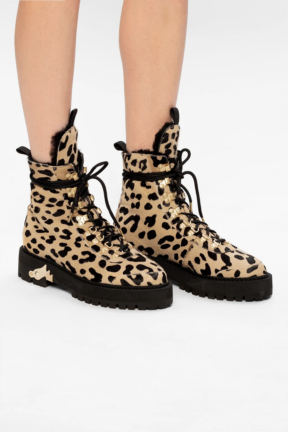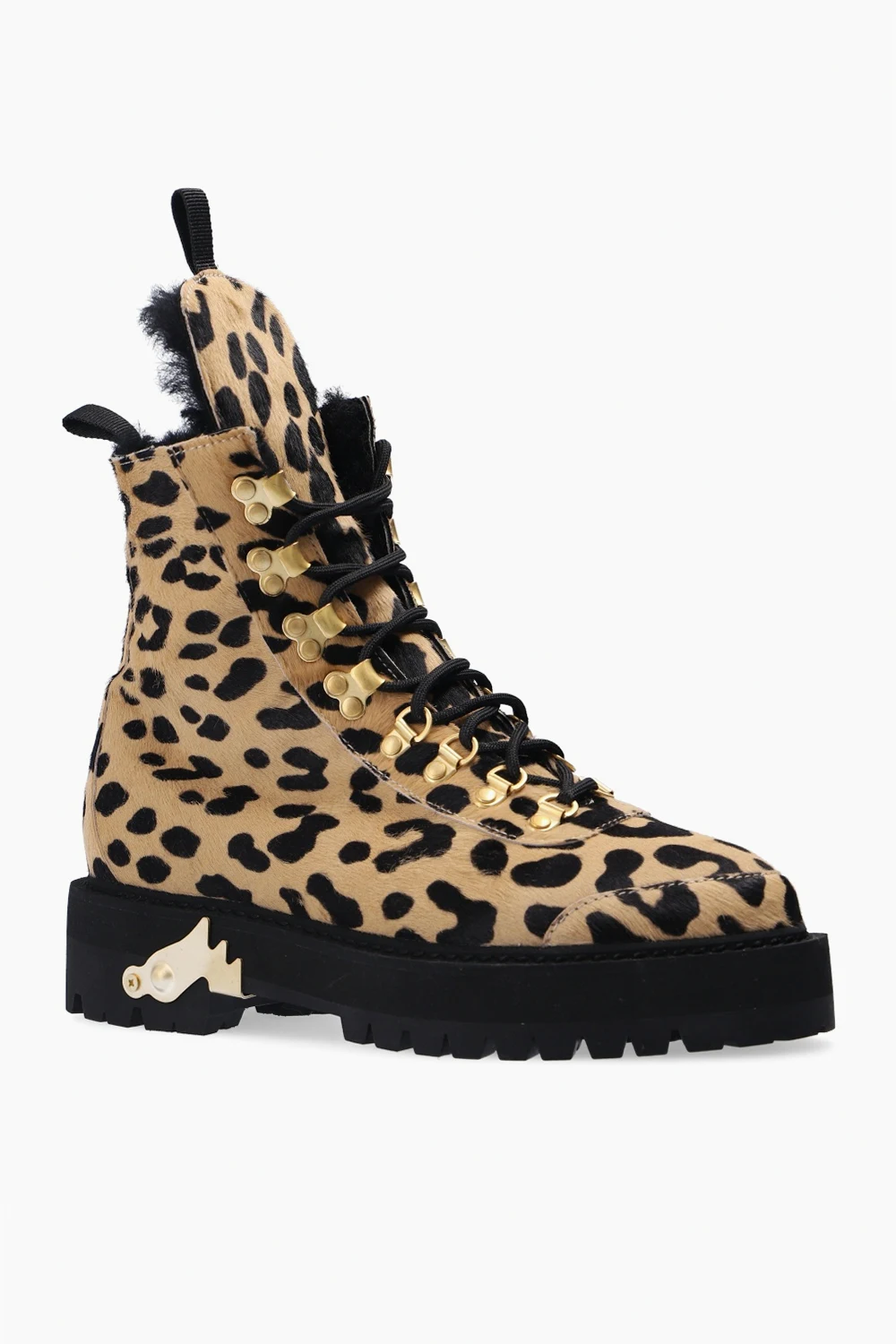 Black and beige boots from Off-White. Crafted from leather and pony hair with leopard print, this robust design features lace-up fastening, distinctive hardware and black rubber sole at the base.