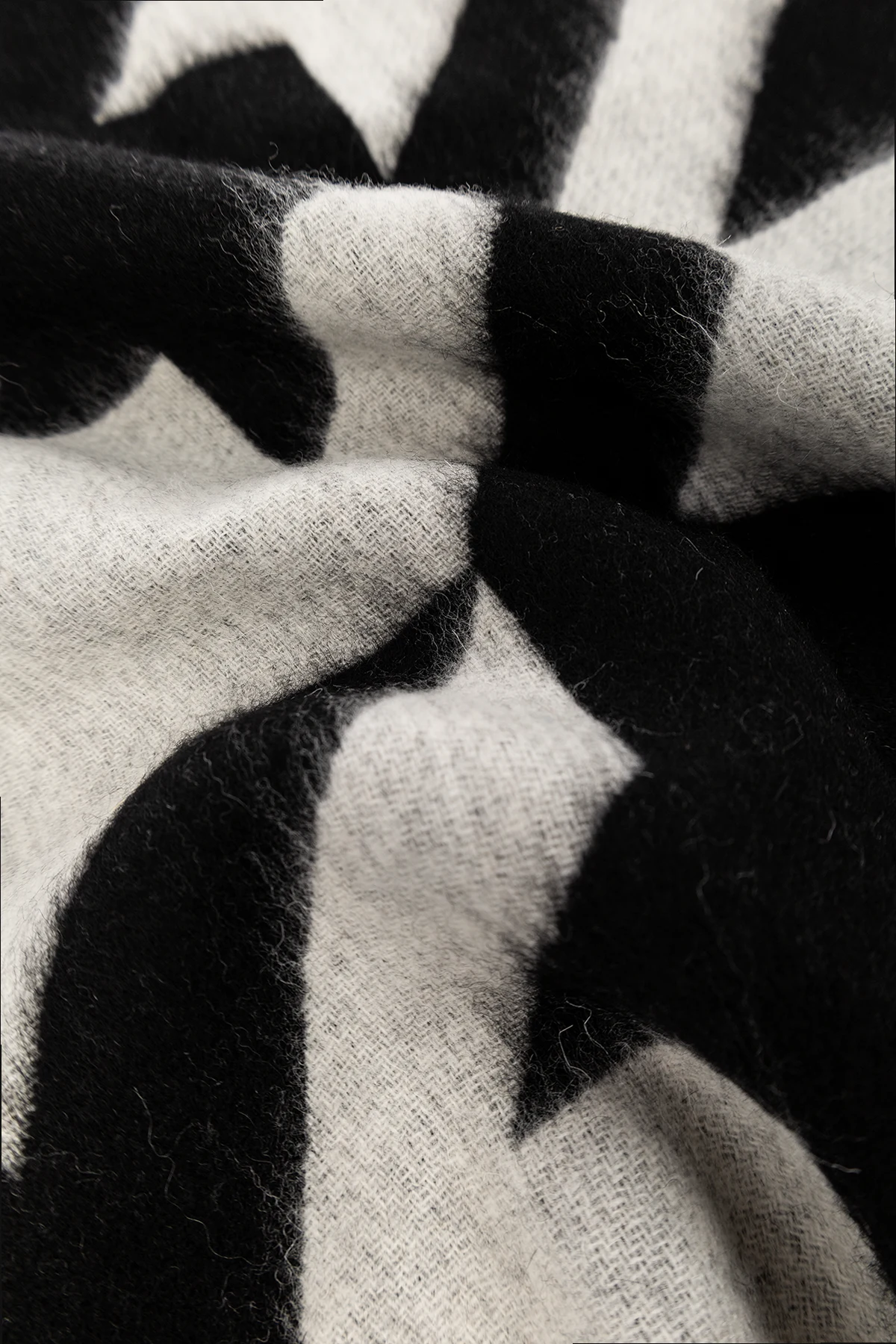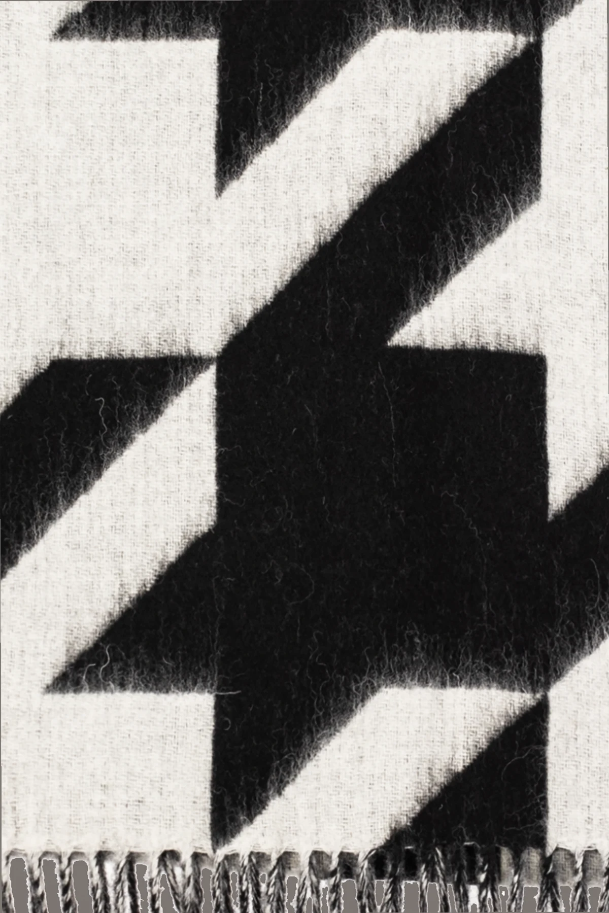 White and black scarf from AllSaints. Made from wool, this item showcases a geometrical pattern and fringed edges.