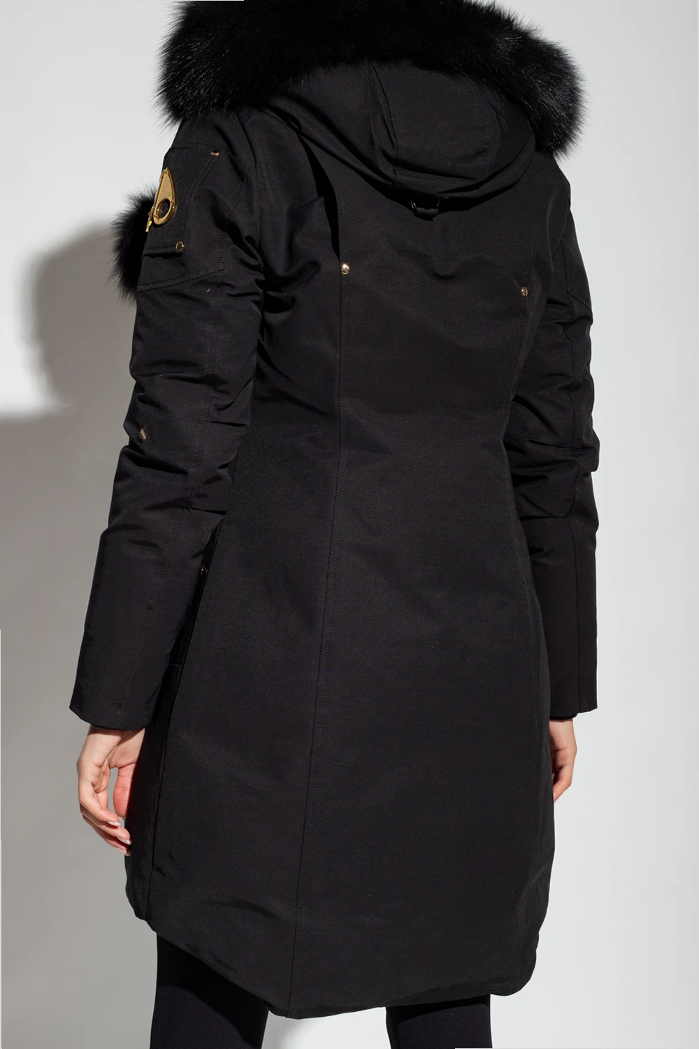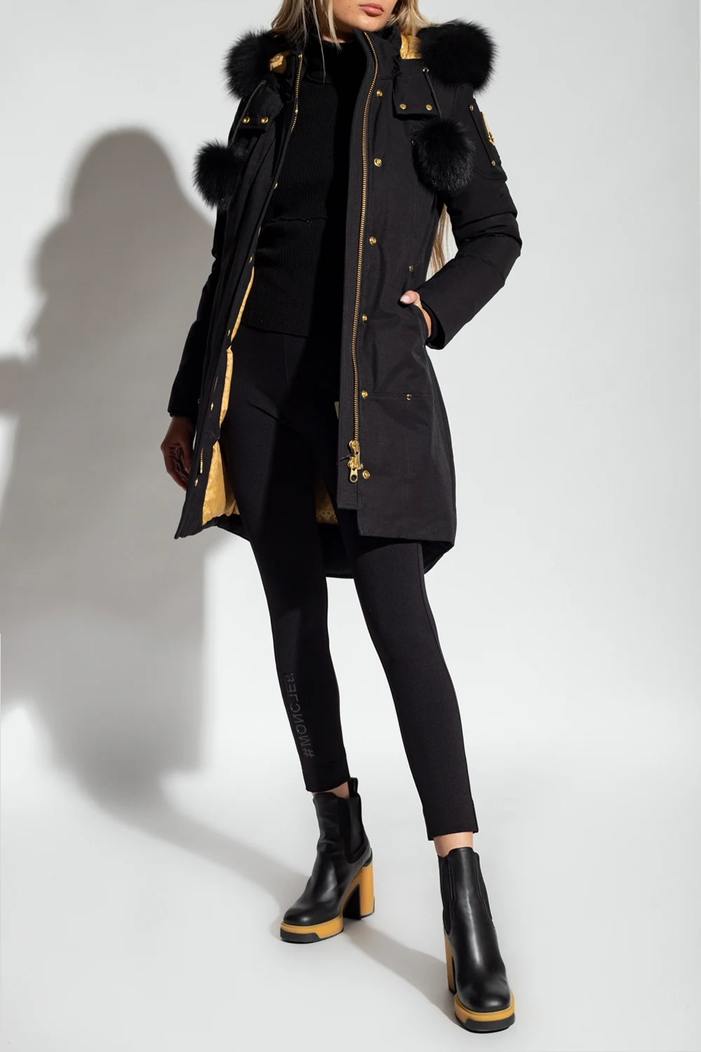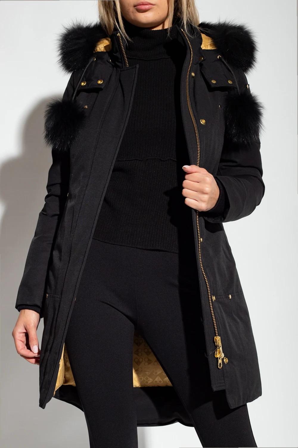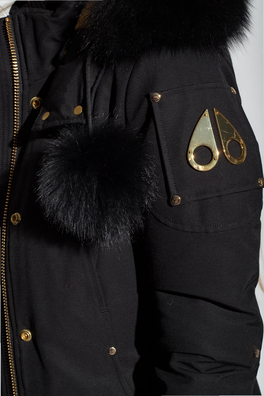 Black jacket from Moose Knuckles. Fastened with a two-way zipper and a snap, this style features a detachable drawstring hood with a fur trim, four frontal pockets, elasticated cuffs, gold-tone metal details and a logo-shaped appliqué on the sleeve.