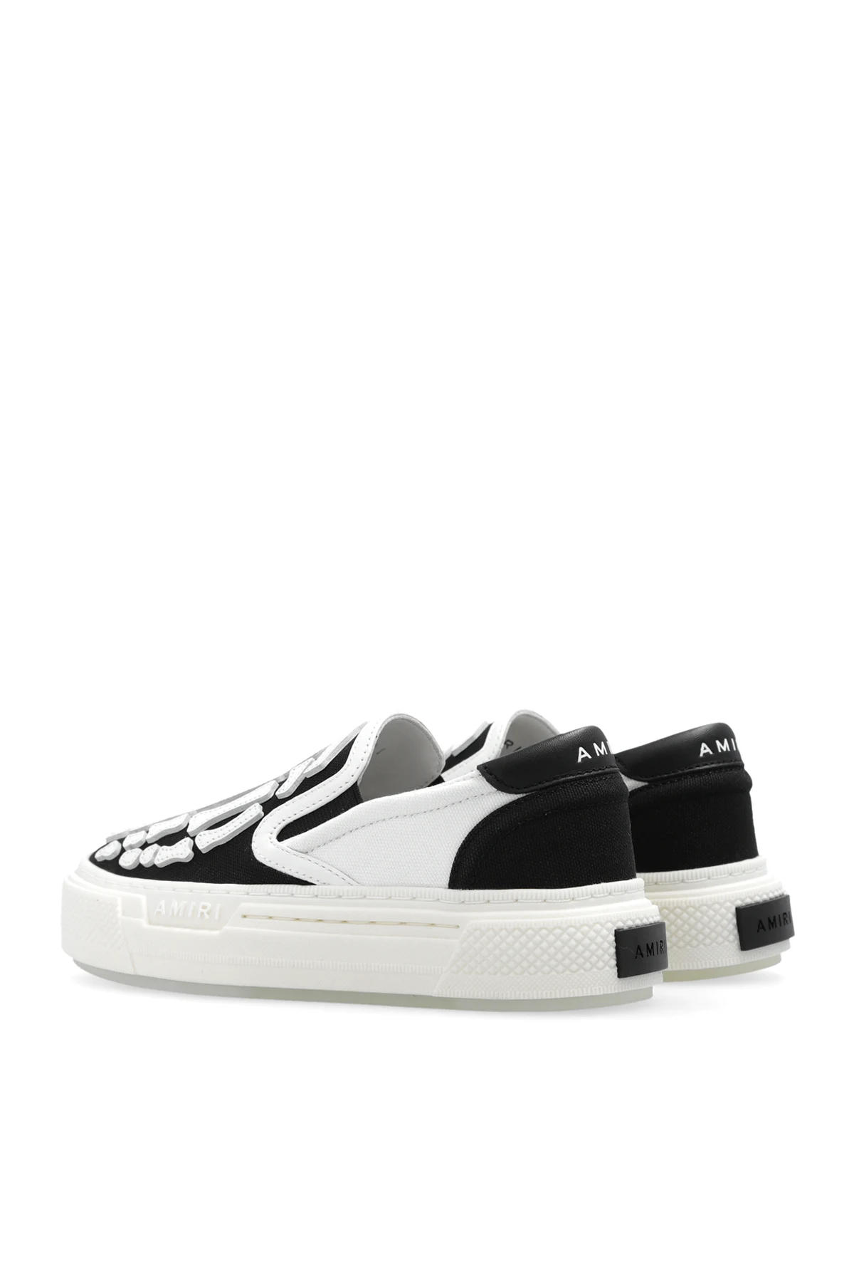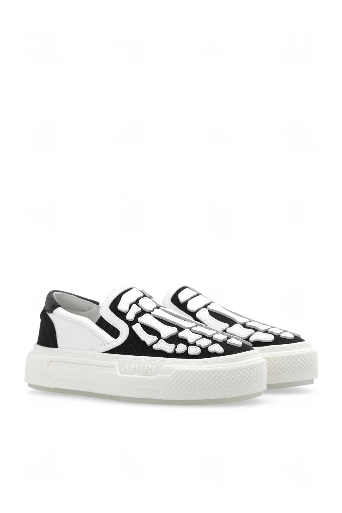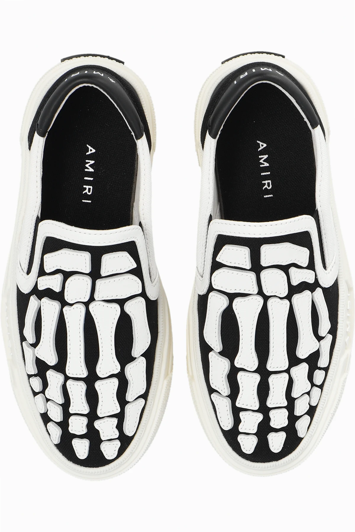 Black and white ‘Bones’ sneakers from Amiri Kids. Made of leather and fabric, this slip-on pair features the brand’s signature patches and a white rubber sole.