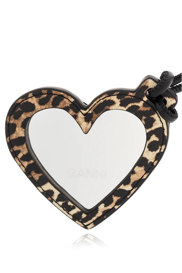 Introducing the GANNI Mirror Heart Pendant — an exquisite fusion of elegance and utility. This distinguished accessory is crafted to enhance your handbag with its chic and distinctive design. Adorned with a panther-inspired leopard print on a rich brown backdrop, this pendant captivates with its luster. The inner surface features a mirror finish , emblazoned with the iconic "GANNI" logo, offering a touch of sophisticated flair. Complete with a sleek , adjustable black strap, this pendant can be effortlessly attached to any handbag, while a smaller rectangular charm proudly displays the brand's name, enhancing the luxe appeal. Why Choose This Product? Unique Design: Elegant heart shape with leopard-print detailing. High-Quality Materials: Mirror glass with recycled leather strap. Designer Touch: Features GANNI's engraved logo. Versatile: Adjustable strap fits all bag styles.