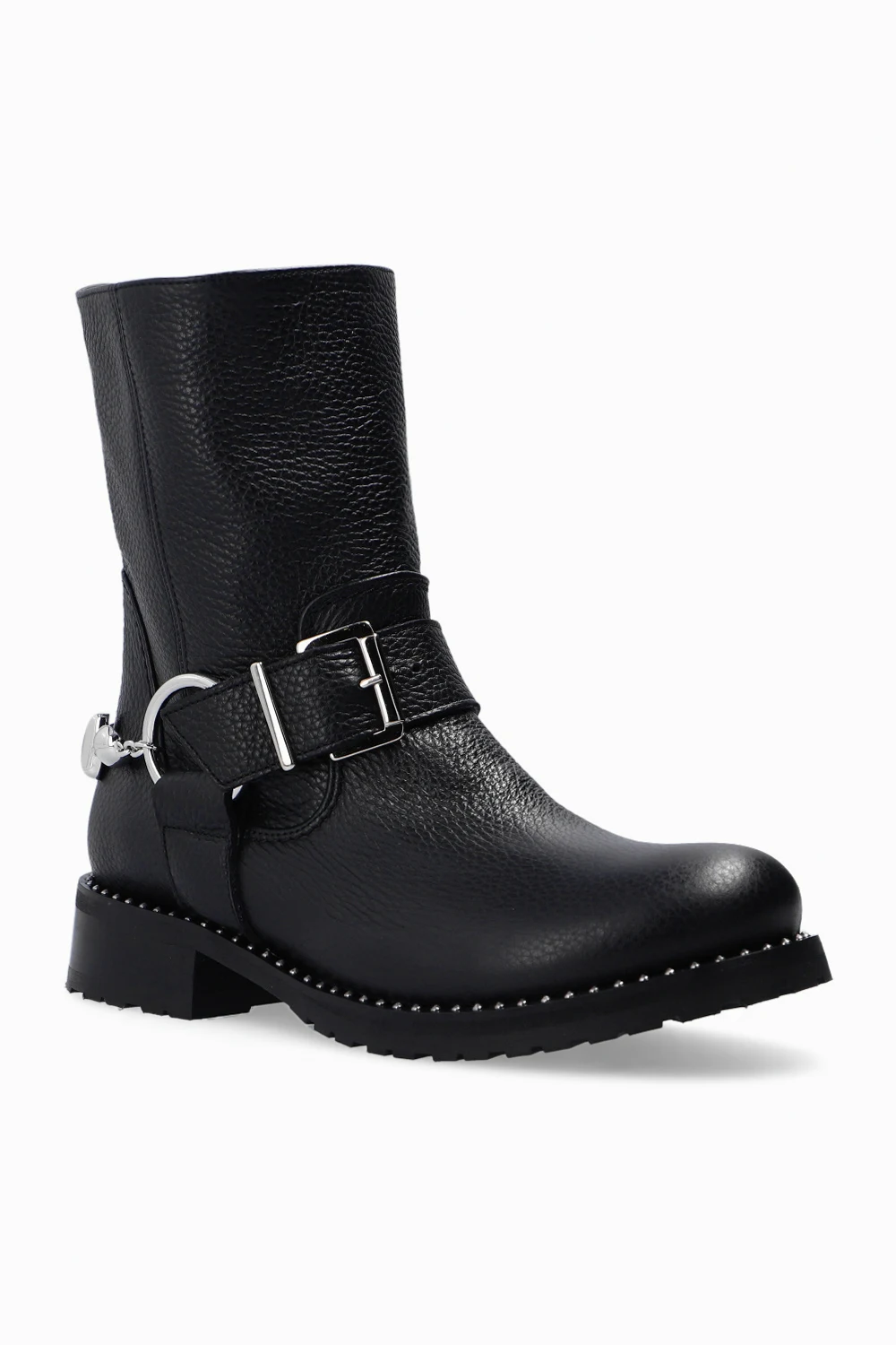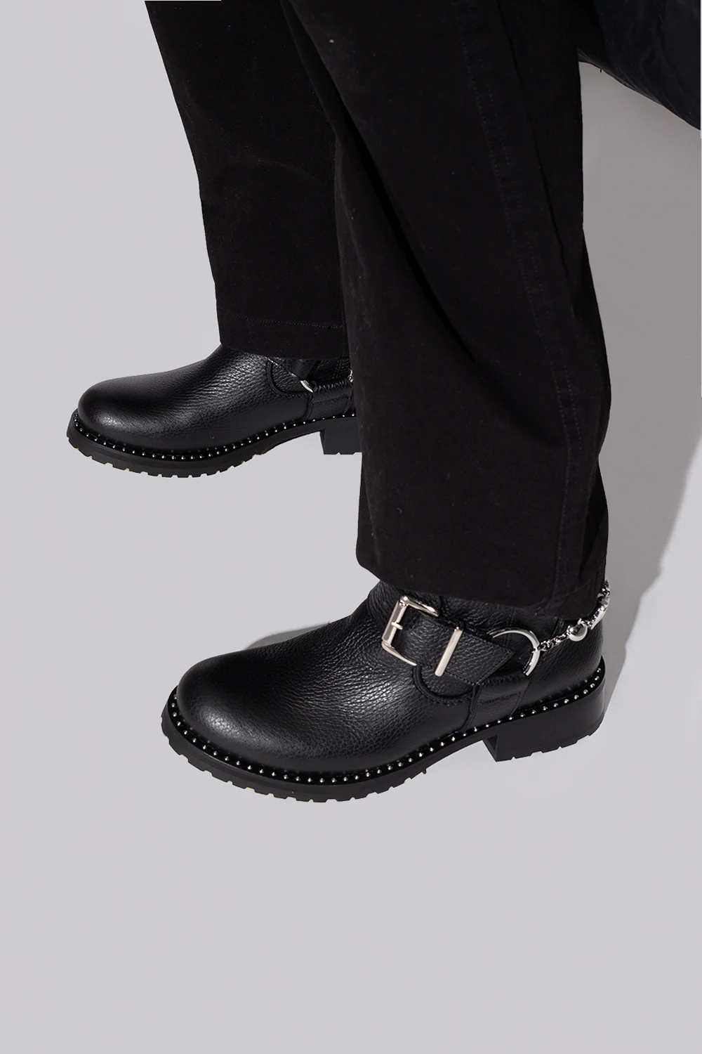 Black ‘Blake’ ankle boots from Sophia Webster. Crafted from leather, this pair is complete with a crystal appliqué, buckle strap, silver-tone metal hardware and black rubber sole with studs.