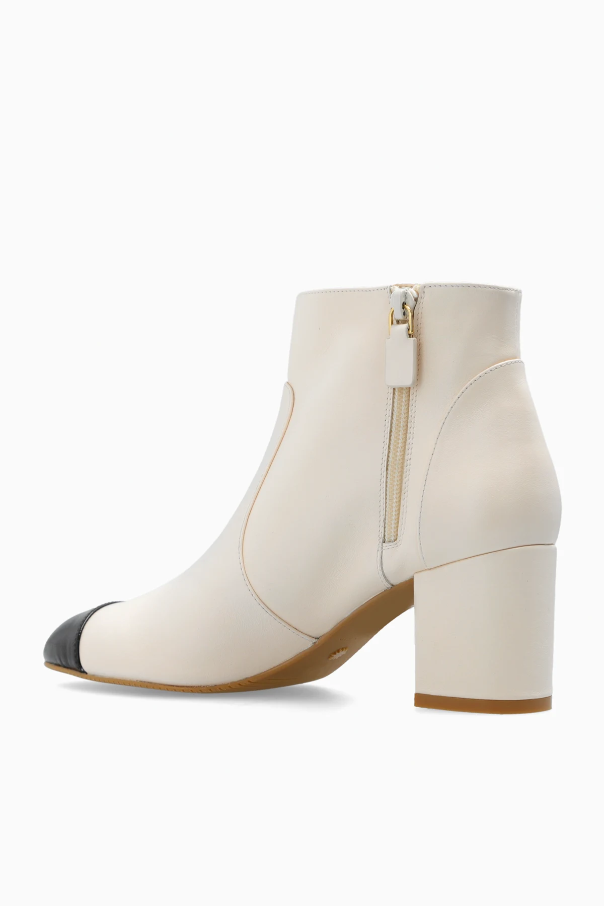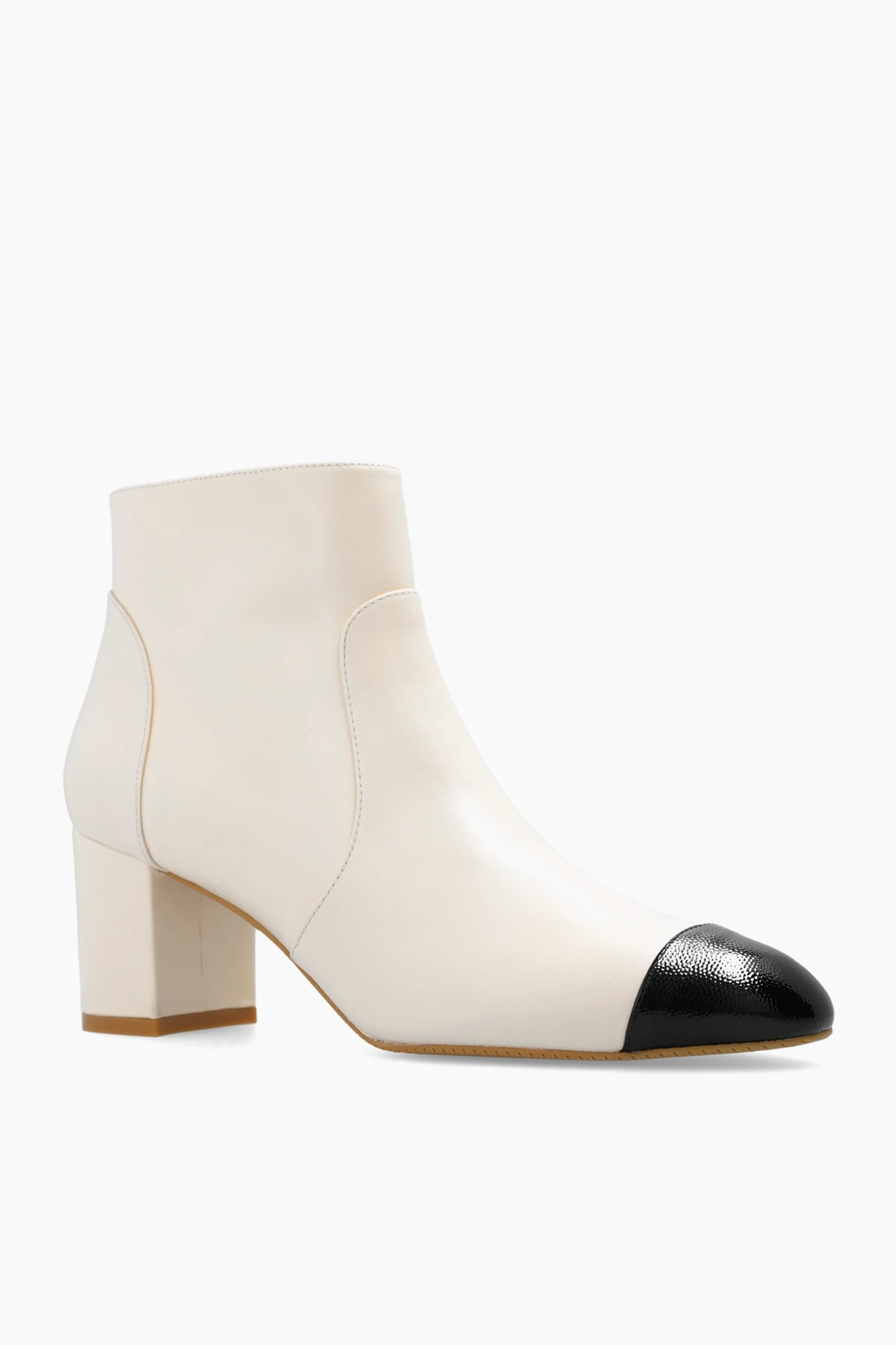 Cream ‘Yuliana’ heeled ankle boots from Stuart Weitzman. Made of leather, this model sits on a beige rubber sole and features a zip fastening and a black round toe.