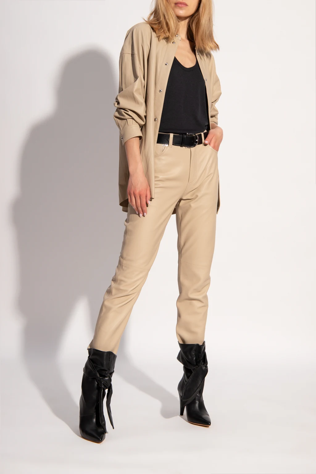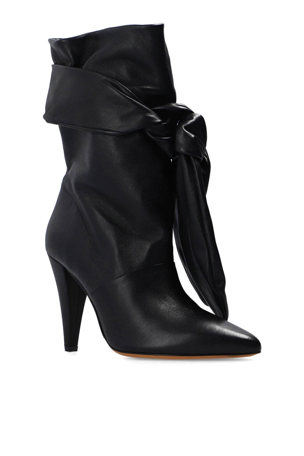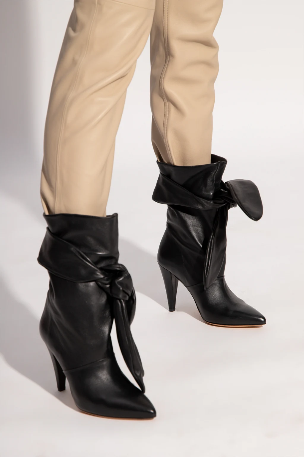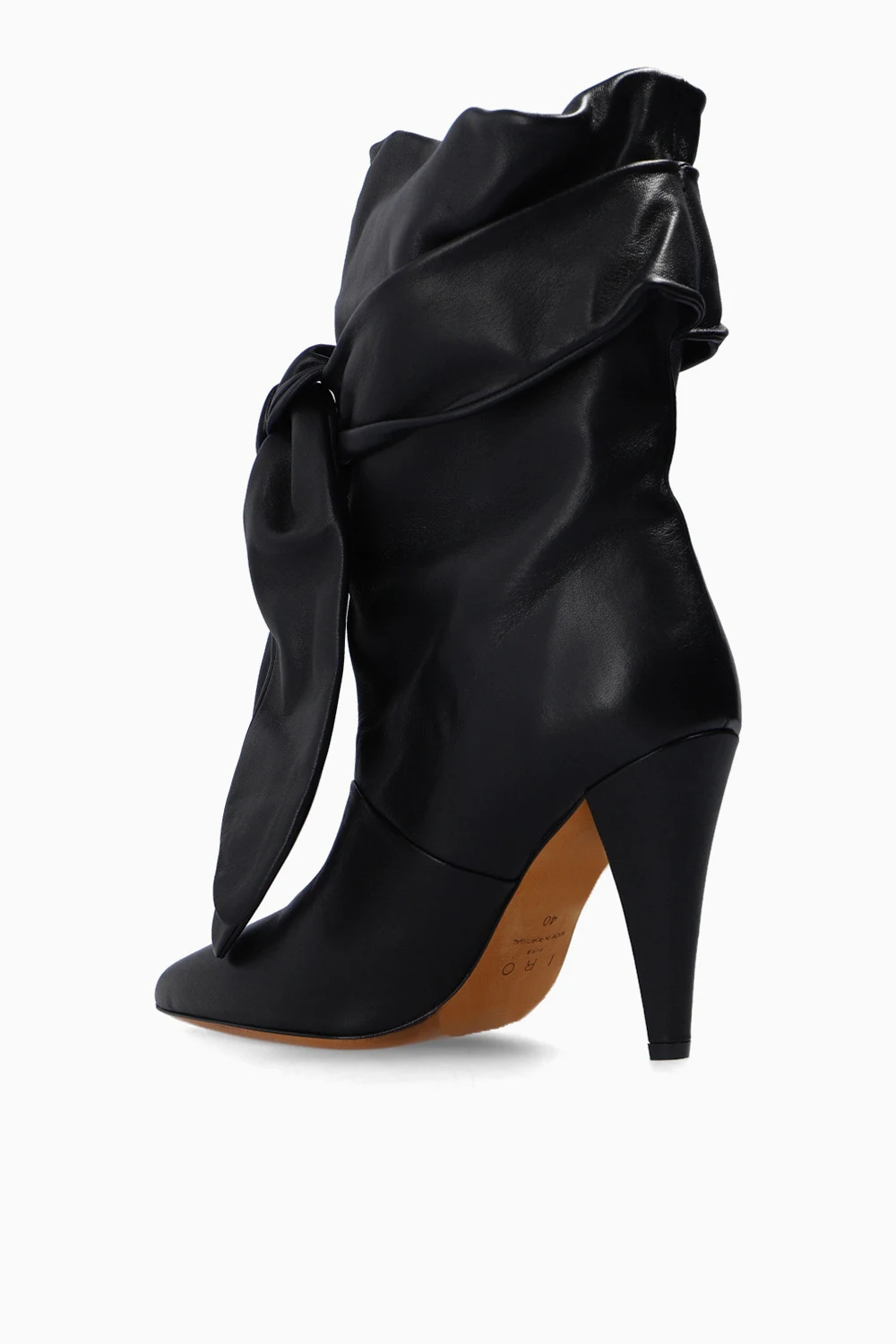 Black heeled ankle boots from Iro. Crafted from leather with a pointed toe silhouette, this pair sits on a beige leather sole and showcases a gathered upper with a decorative tie closure.