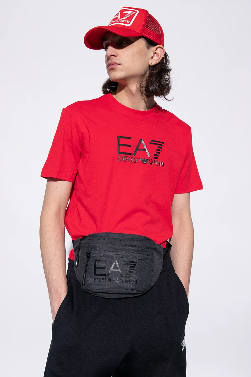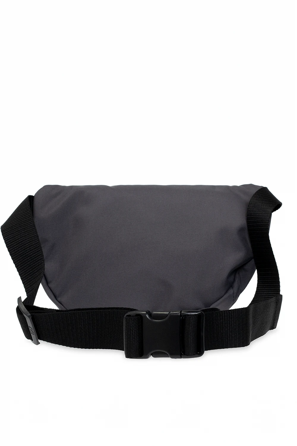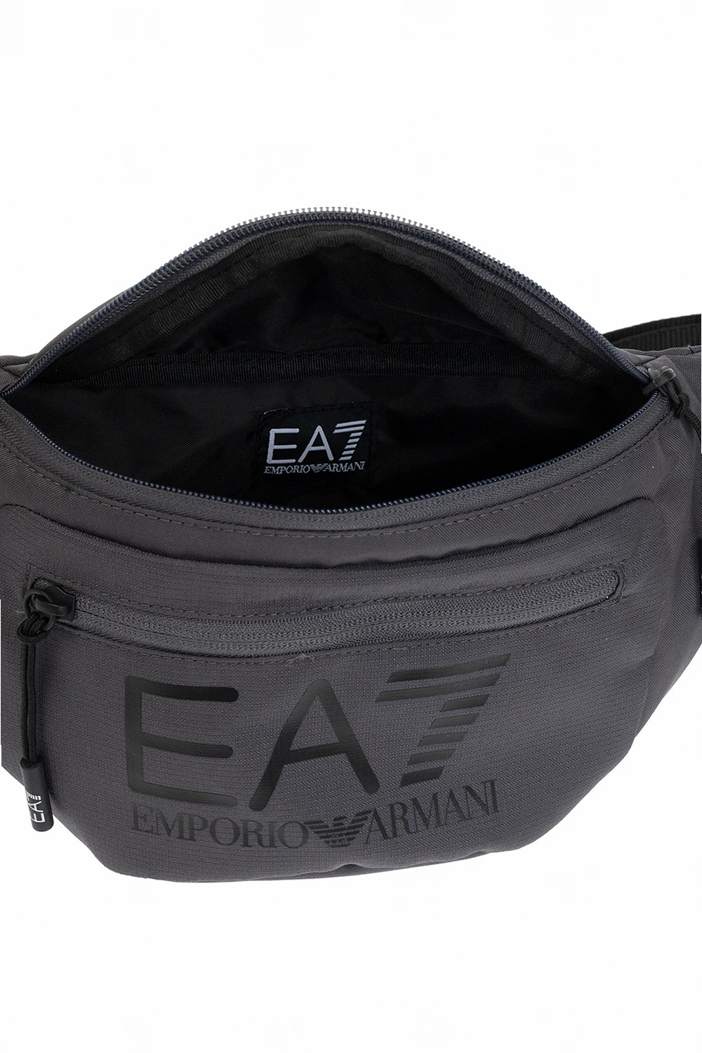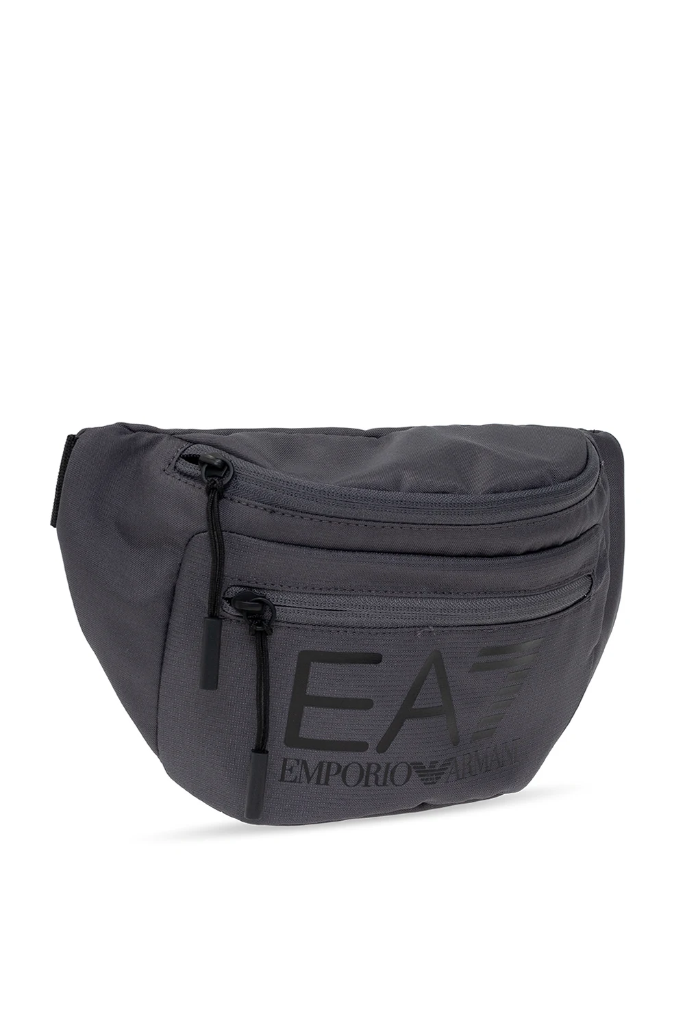 Grey belt bag from EA7 Emporio Armani. This model features a front zip pocket, black logo print, black adjustable strap, one internal compartment with black metal hardware.
