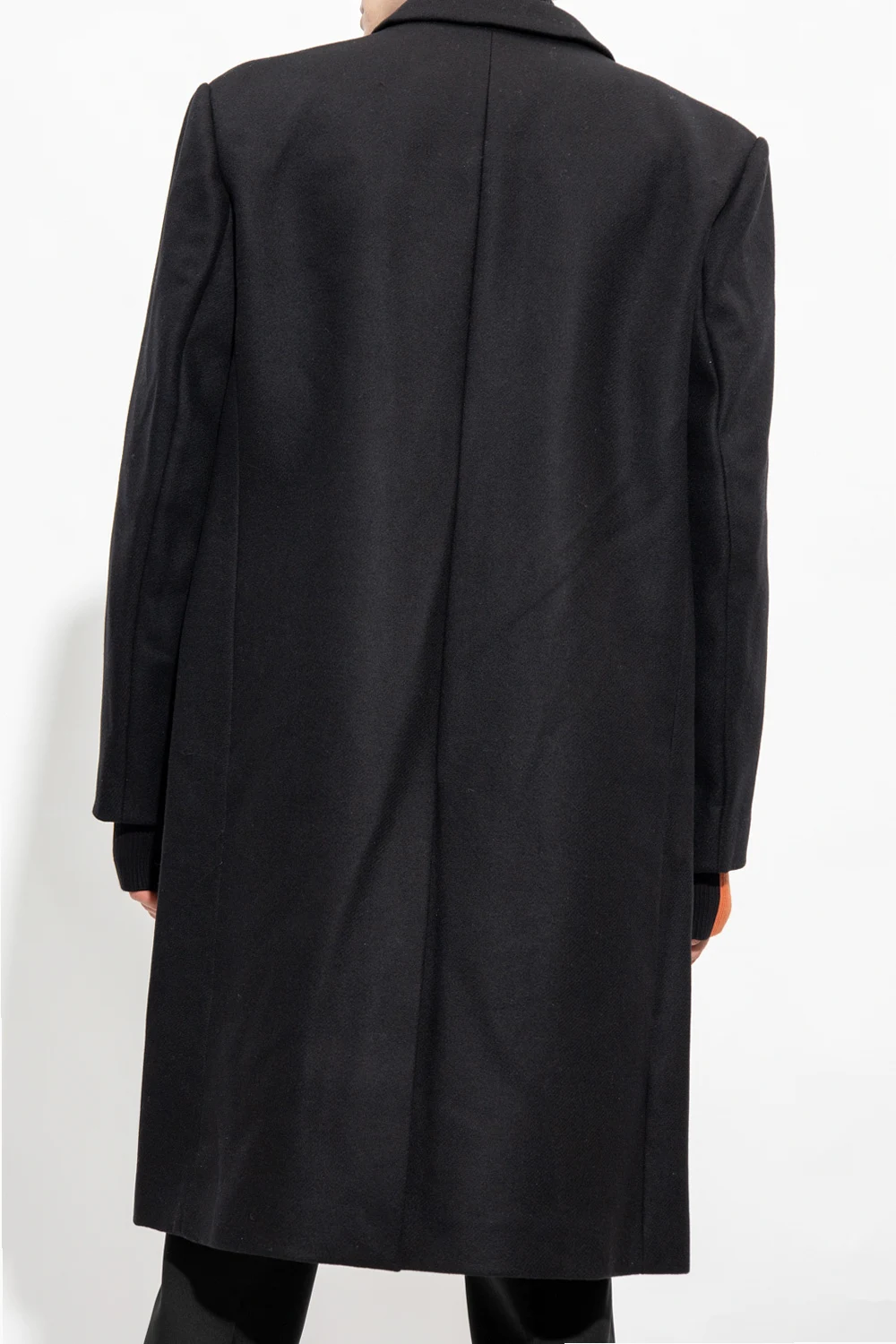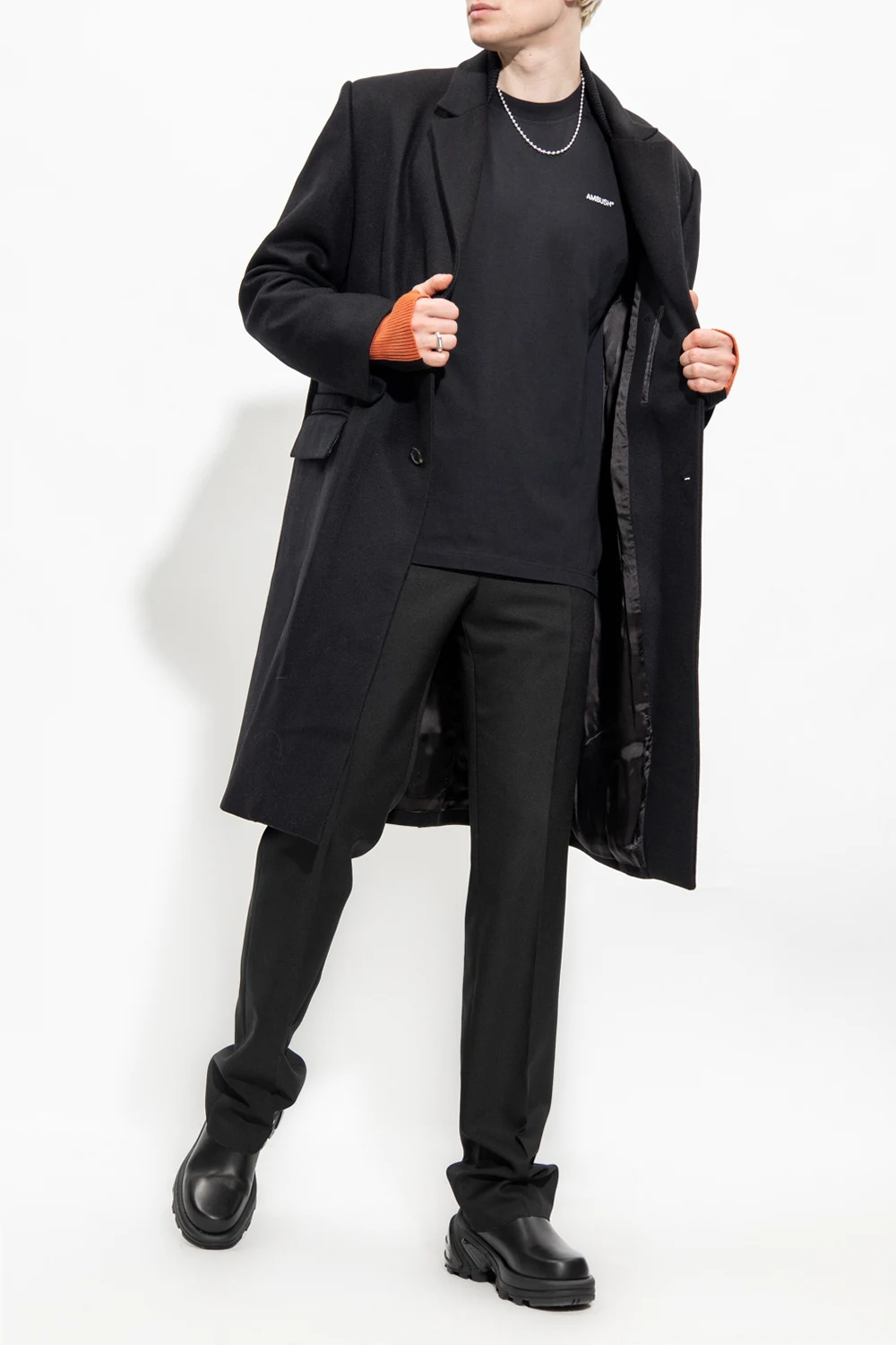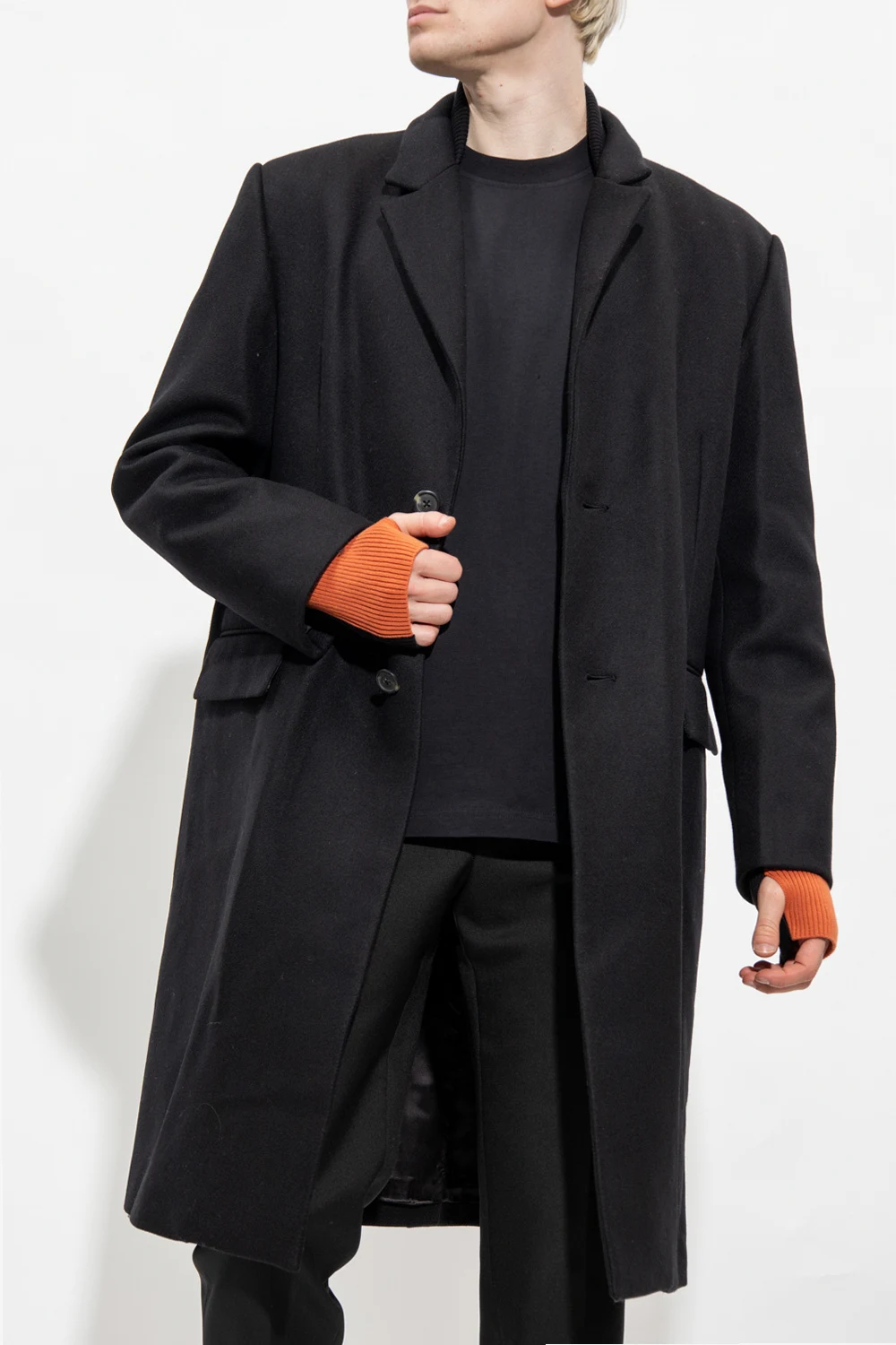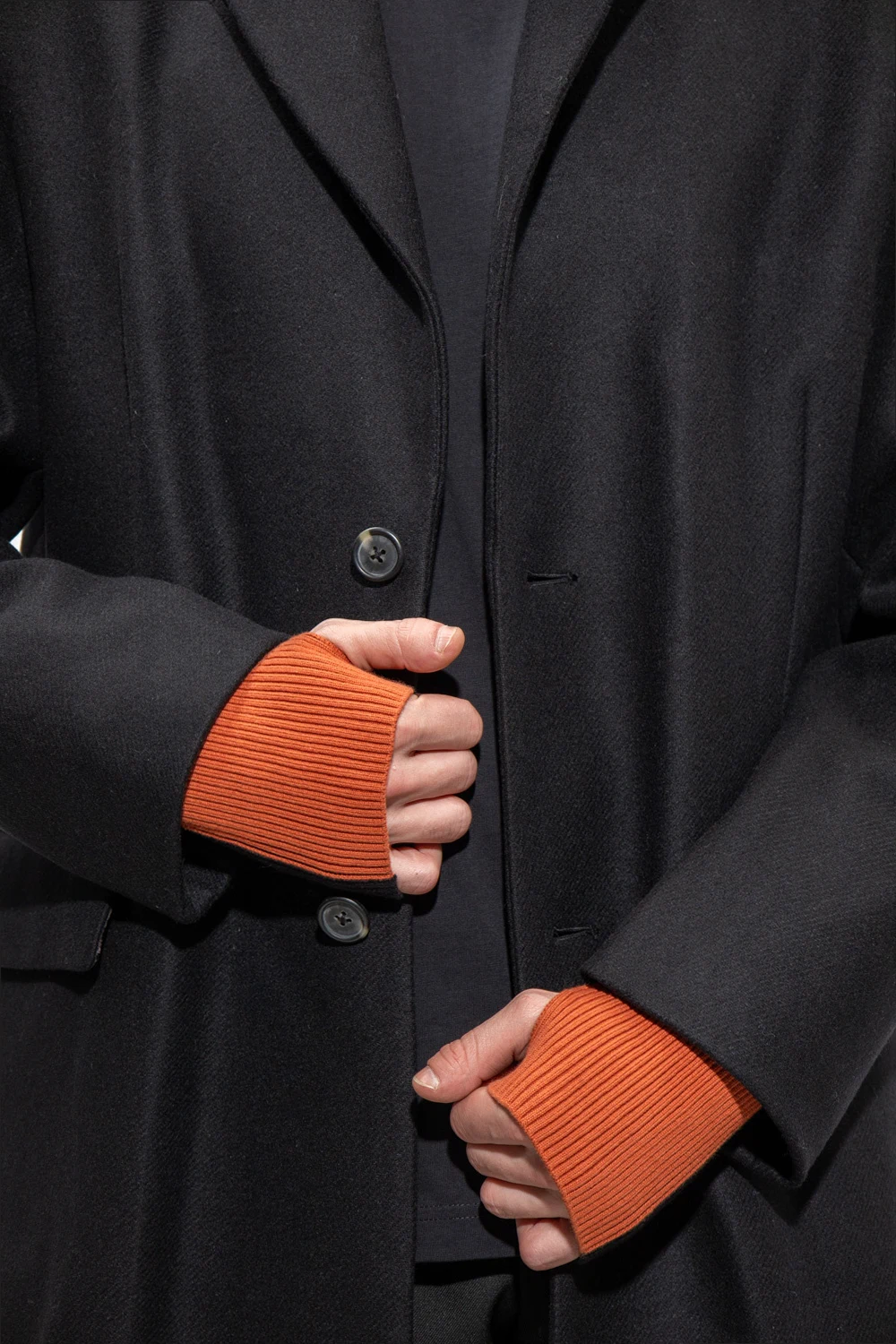 Black coat from Helmut Lang. Crafted from wool, this style features button fastenings, notch lapels, three pockets on the front (two with flaps), a single back vent and long sleeves with orange and black elastic trims with thumbholes.