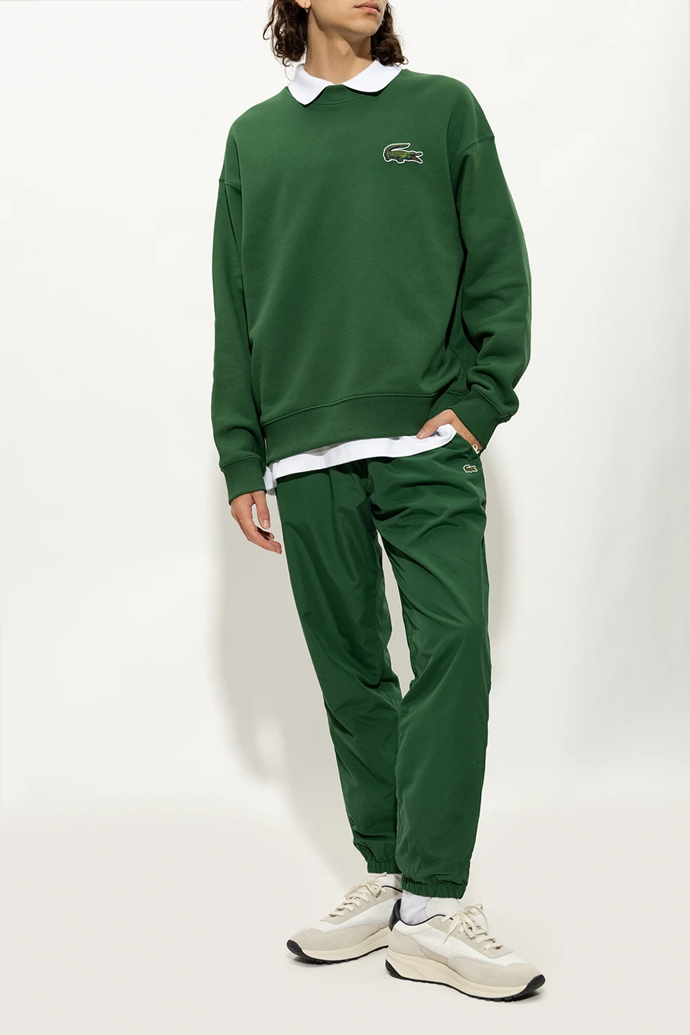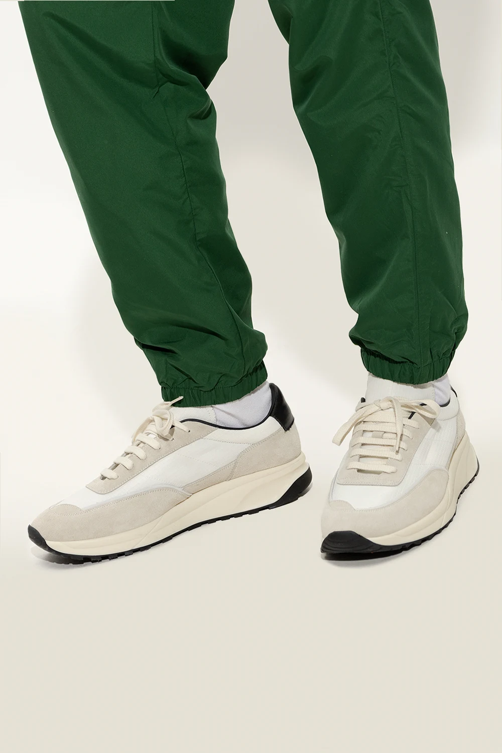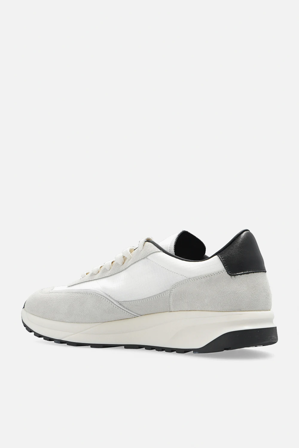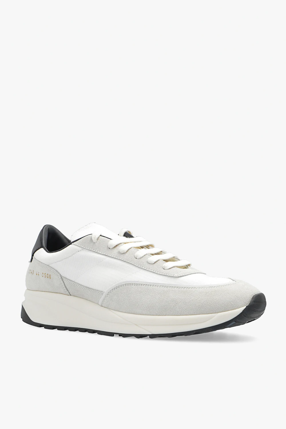 White and grey ‘Track 80’ sneakers from Common Projects. Made of ripstop and suede, this lace-up pair is complete with a gold-tone print, black leather heel counter and Gommus® rubber sole in cream and black. Comes with swappable shoelaces.
