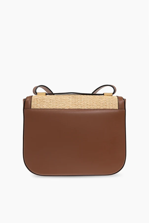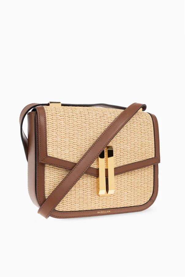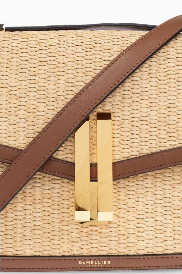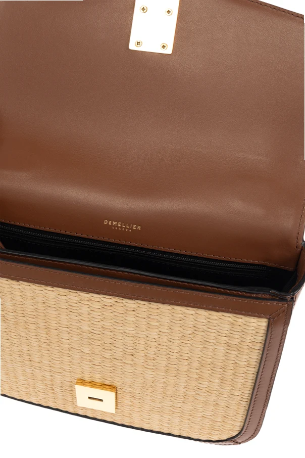 The Vancouver Shoulder Bag by DeMellier embodies a harmonious blend of contemporary sophistication and relaxed summer elegance. Its rectangular, structured silhouette with rounded corners evokes a minimalist allure, while the light beige, basket-weave front—crafted from exquisite raffia—imparts an air of breezy refinement. Smooth brown leather, meticulously applied to the sides, back, trim, and adjustable strap, enhances the bag’s luxurious tactility and enduring appeal. Distinctive diagonal stitching and a subtle, woven motif underscore its artisanal craftsmanship. The centerpiece: a geometric, light gold metal clasp, comprised of two reflective vertical rectangles, conveys modern artistry and unmistakable style. The interior, fully lined with soft cotton, promises both comfort and practicality. Why choose this product? Exceptional fusion of natural raffia and premium leather Modern, minimalist design with elegant detailing Secure and stylish gold-tone clasp Exclusively crafted by renowned designer DeMellier Luxuriously lined interior for elevated comfort