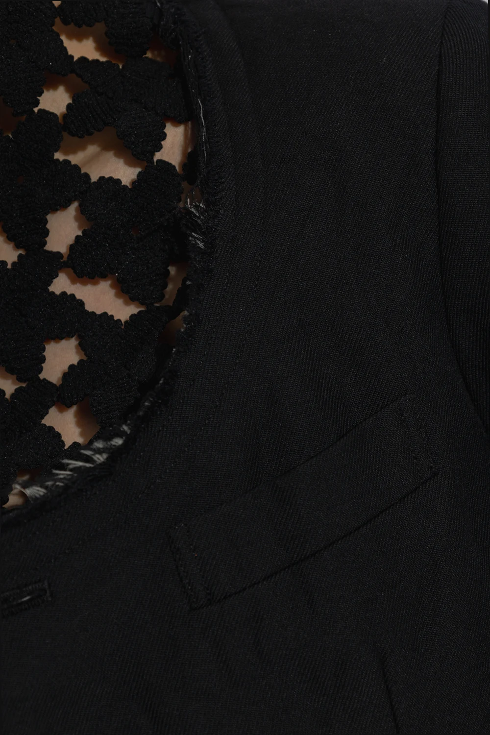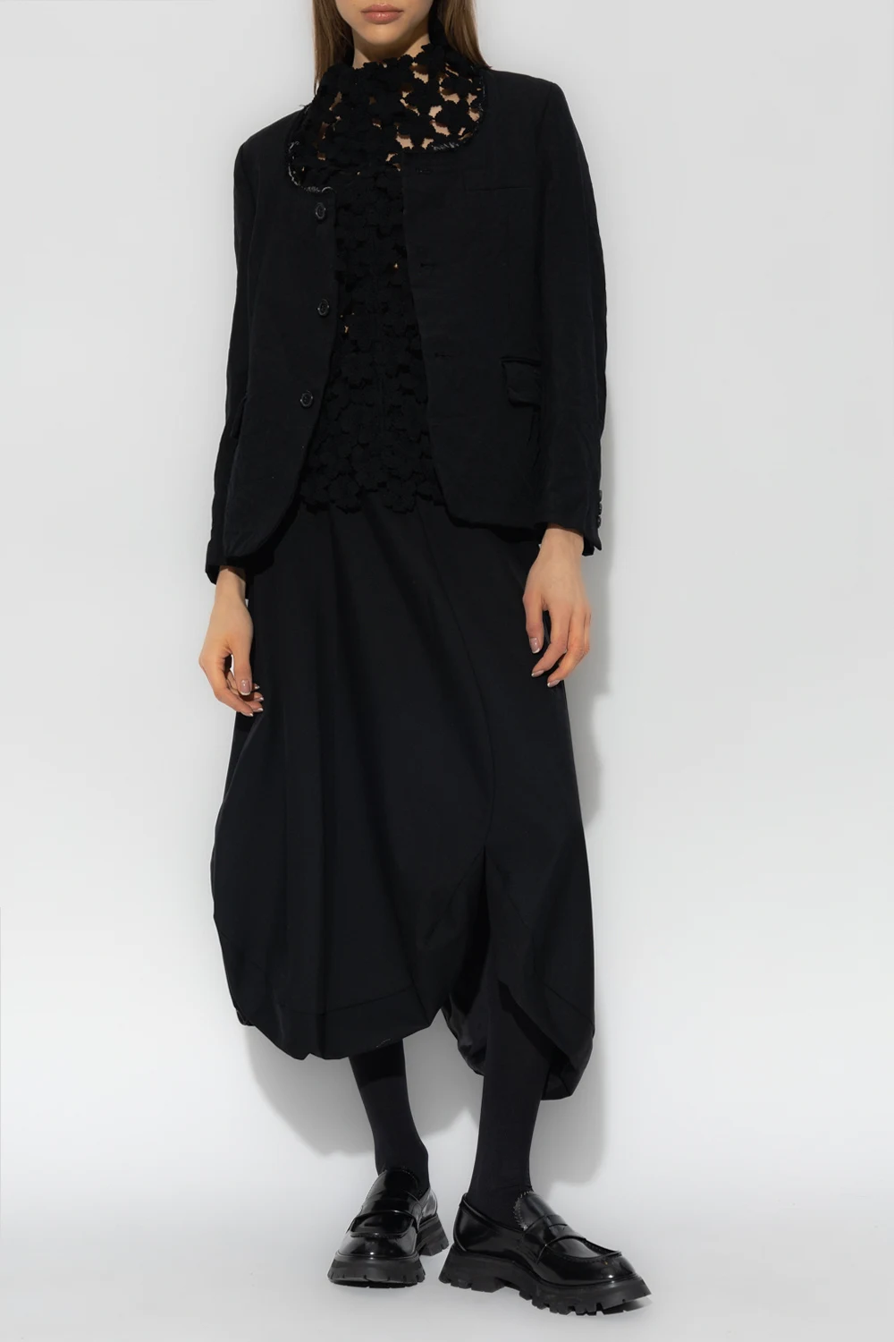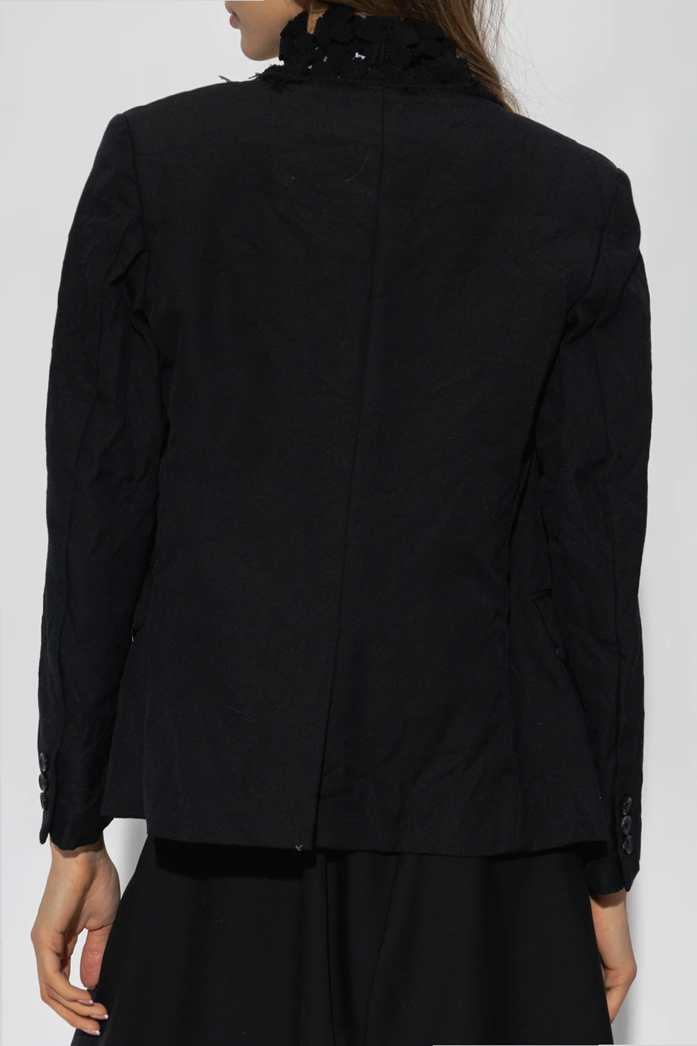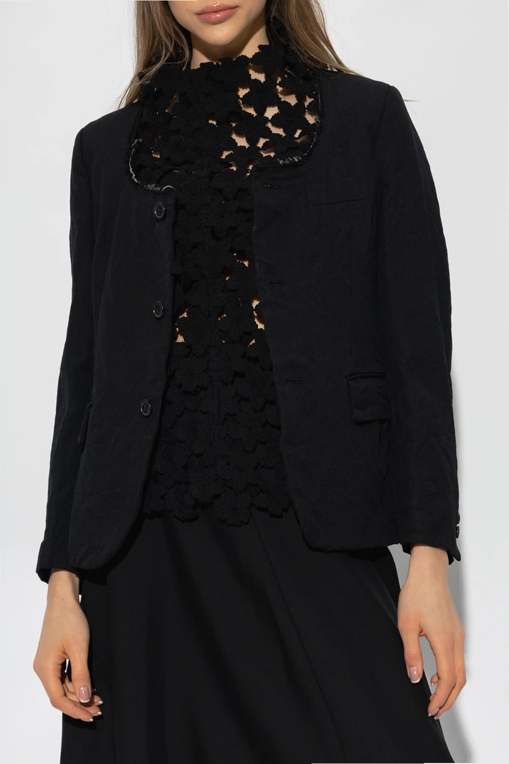 Black blazer from CDG by Comme des Garcons. Made of wool, this long sleeve design features button fastenings, two flap pockets, one slip pocket and raw cut edges.