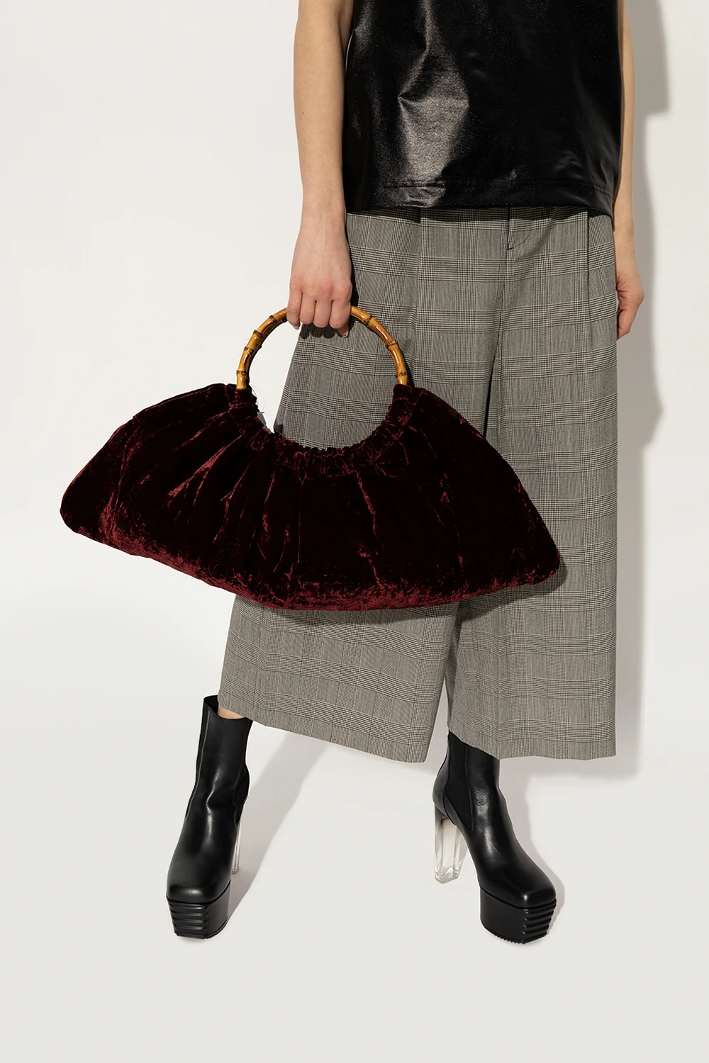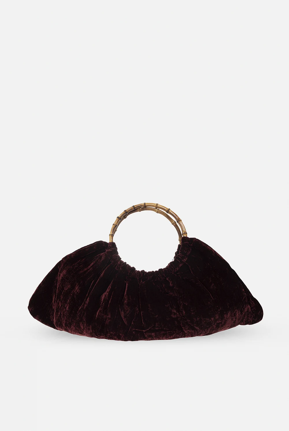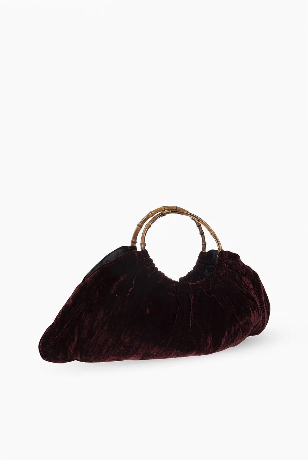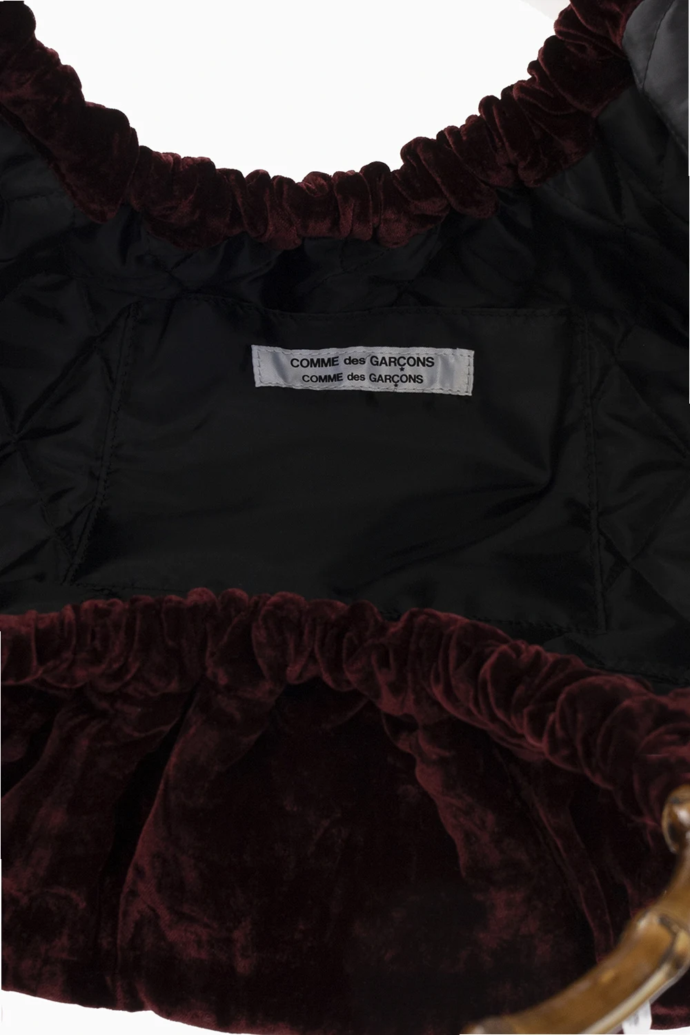 Maroon handbag from CDG by Comme des Garcons. Made of velvet, this model features two half-round bamboo handles and one internal compartment with one slip pocket.