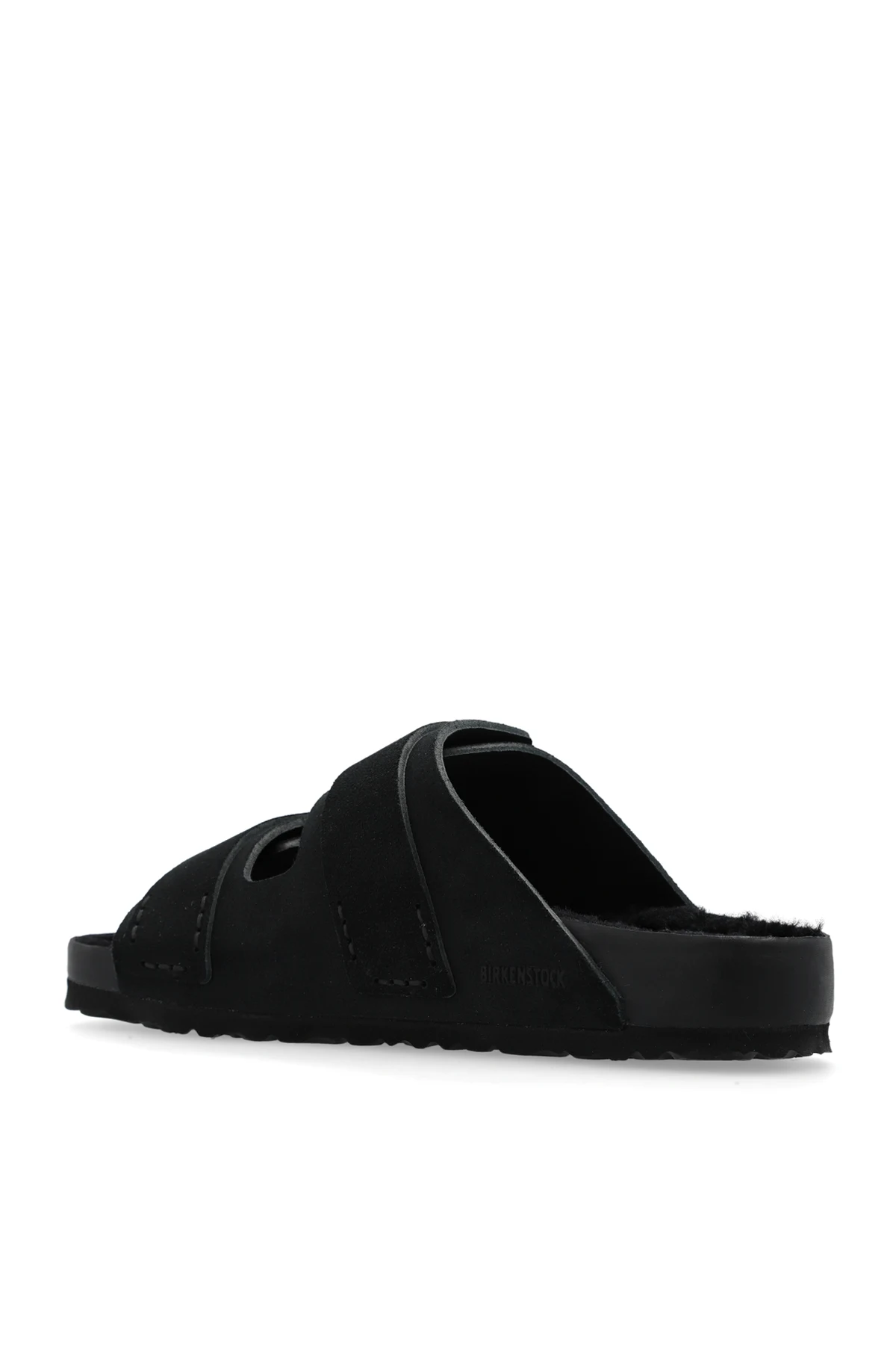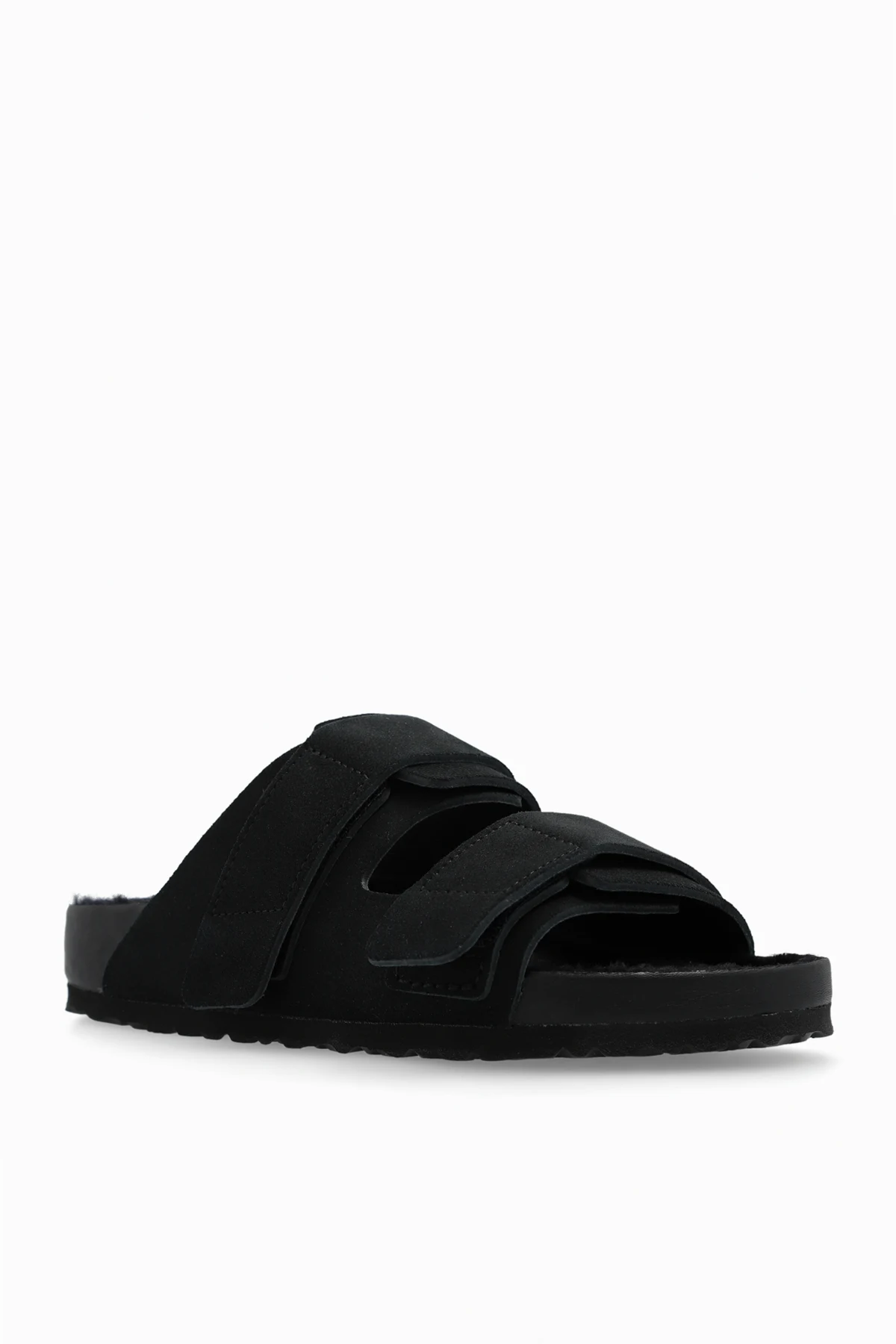 Black ‘Uji Handstitch’ slides from Birkenstock x Tekla. Made of suede and lined with sheep fur, this model sits on a black EVA foam outsole and features an embossed logo, velcro closures and an anatomically shaped cork-latex footbed with standard width.