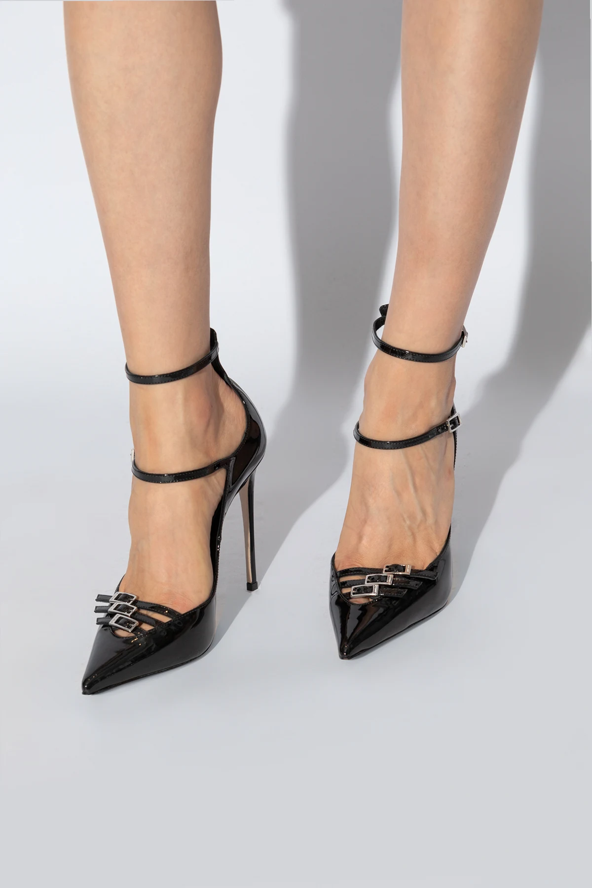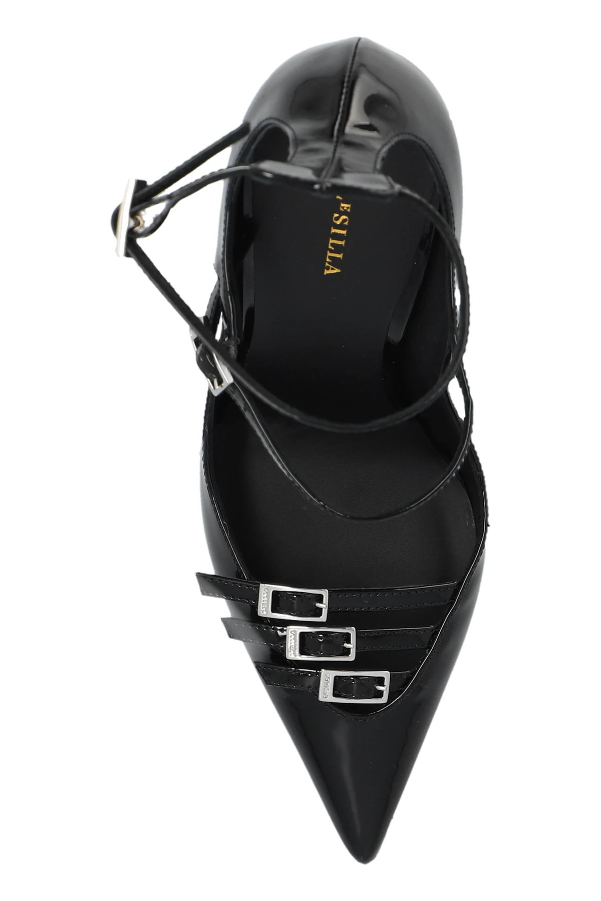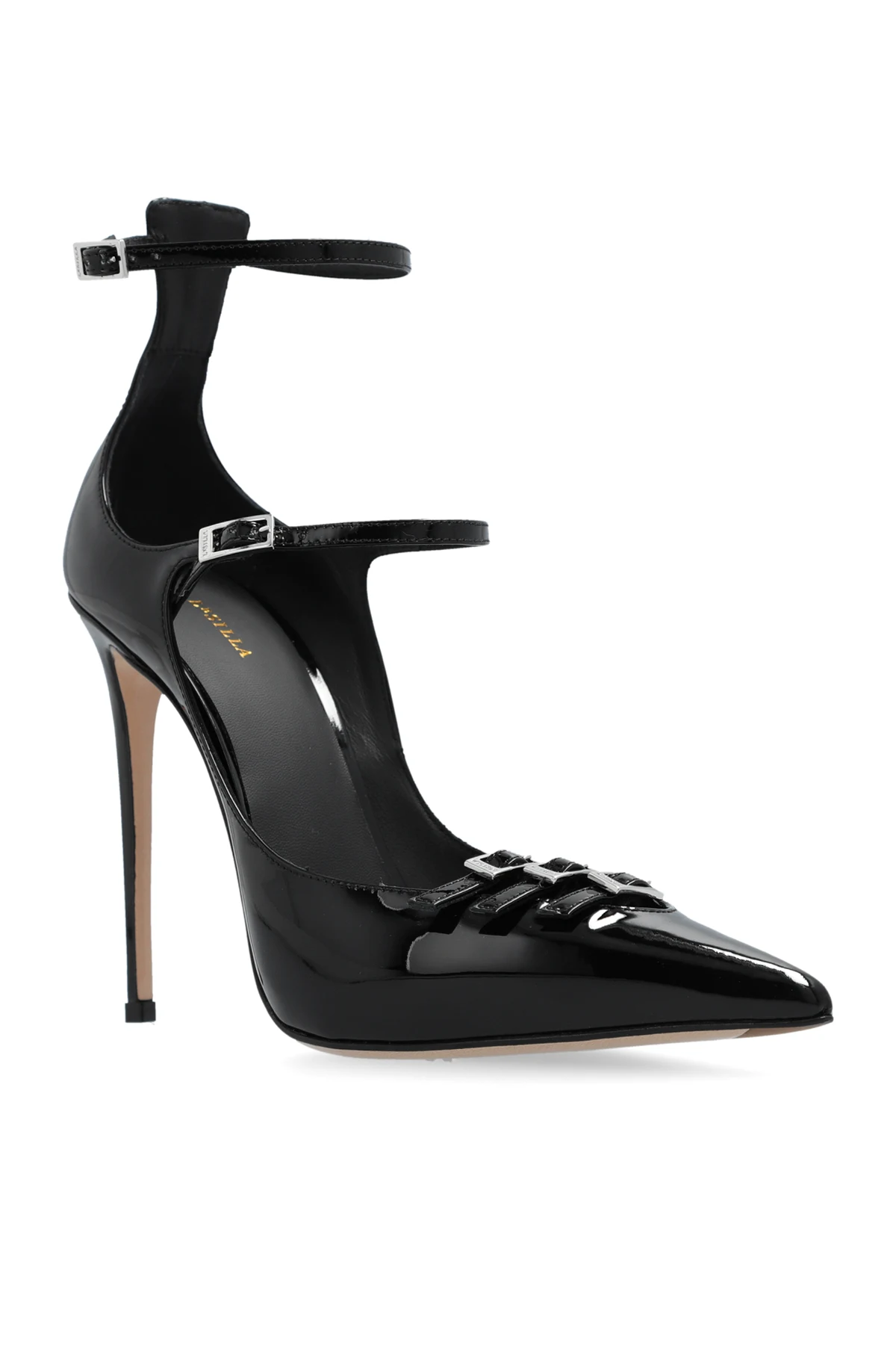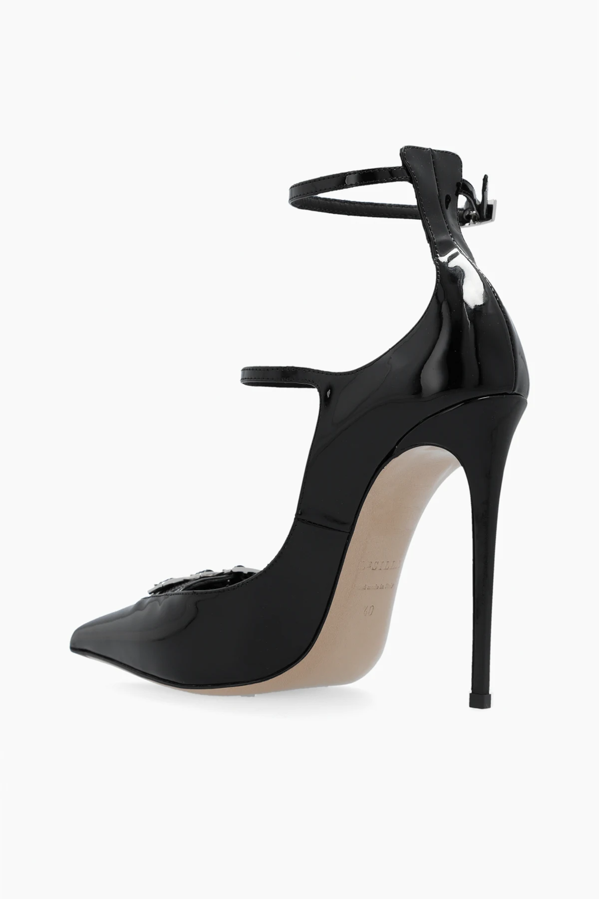 Introducing the "Morgana" Heels by Le Silla, a masterpiece of elegance and craftsmanship. These medium-heeled stilettos are the epitome of sophistication, rendered in a luscious black hue that dominates their design. The shoes are meticulously crafted from 100% high-quality leather, both in the outer and inner layers, ensuring not only a polished finish but also supreme comfort. The "Morgana" stands out with its pointed toe silhouette, enhanced by the presence of two ankle straps adorned with buckles. This detail not only adds a touch of elegance but also provides a customizable fit. Further elevating their allure are the decorative sparkling embellishments on the front, possibly crystals or stones, that catch the light with every step. The slim, high heel accentuates the leg, offering the distinguished stiletto appearance, while the sole boasts the designer's logo, a testament to authenticity and exclusive origin. These heels are not merely footwear; they are a statement of refined taste, perfect for formal and evening attire. Their sleek, shiny appearance, courtesy of the polished leather or leather-like material, alongside the functional yet aesthetically pleasing buckle closure, makes them a must-have for the discerning fashion enthusiast. Why Purchase the "Morgana" Heels? Elegance and Sophistication: Perfect for elevating formal and evening outfits. High-Quality Materials: Crafted from 100% leather, ensuring durability and a luxurious feel. Exquisite Details: Decorative embellishments and a slim, high heel for a distinctive stiletto look. Customizable Fit: Adjustable ankle straps with buckle closures for comfort and elegance. Designer Authenticity: Features the Le Silla logo as a symbol of quality and exclusivity. Versatility: The timeless black color seamlessly matches a variety of styles and colors.