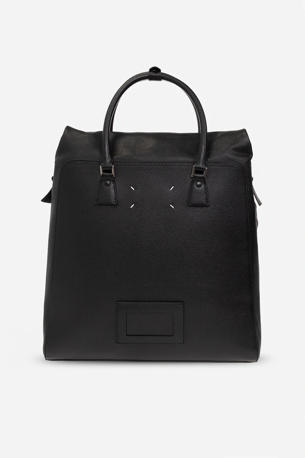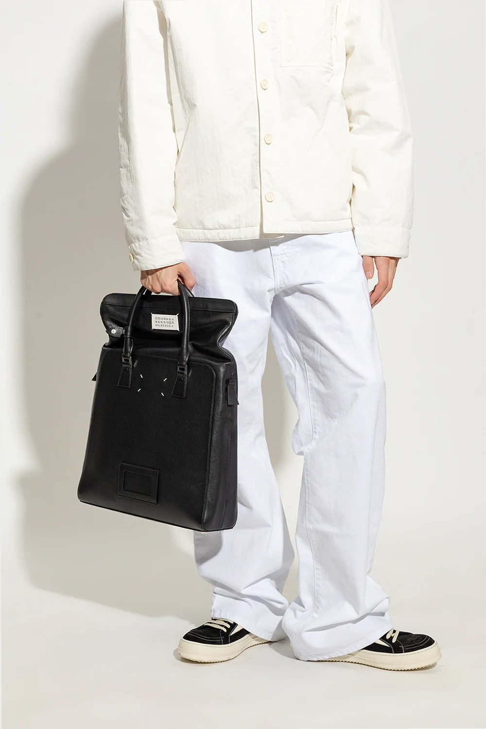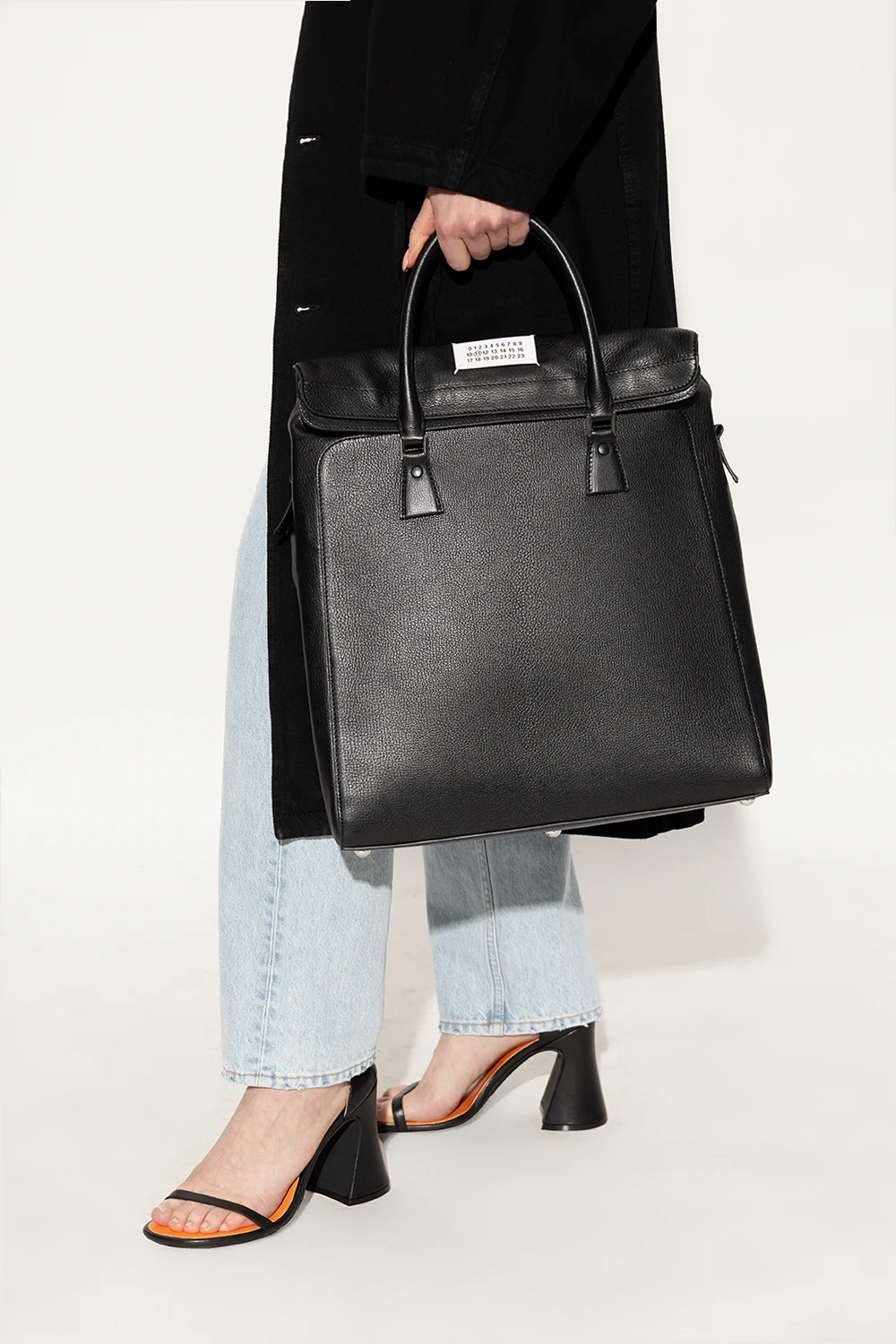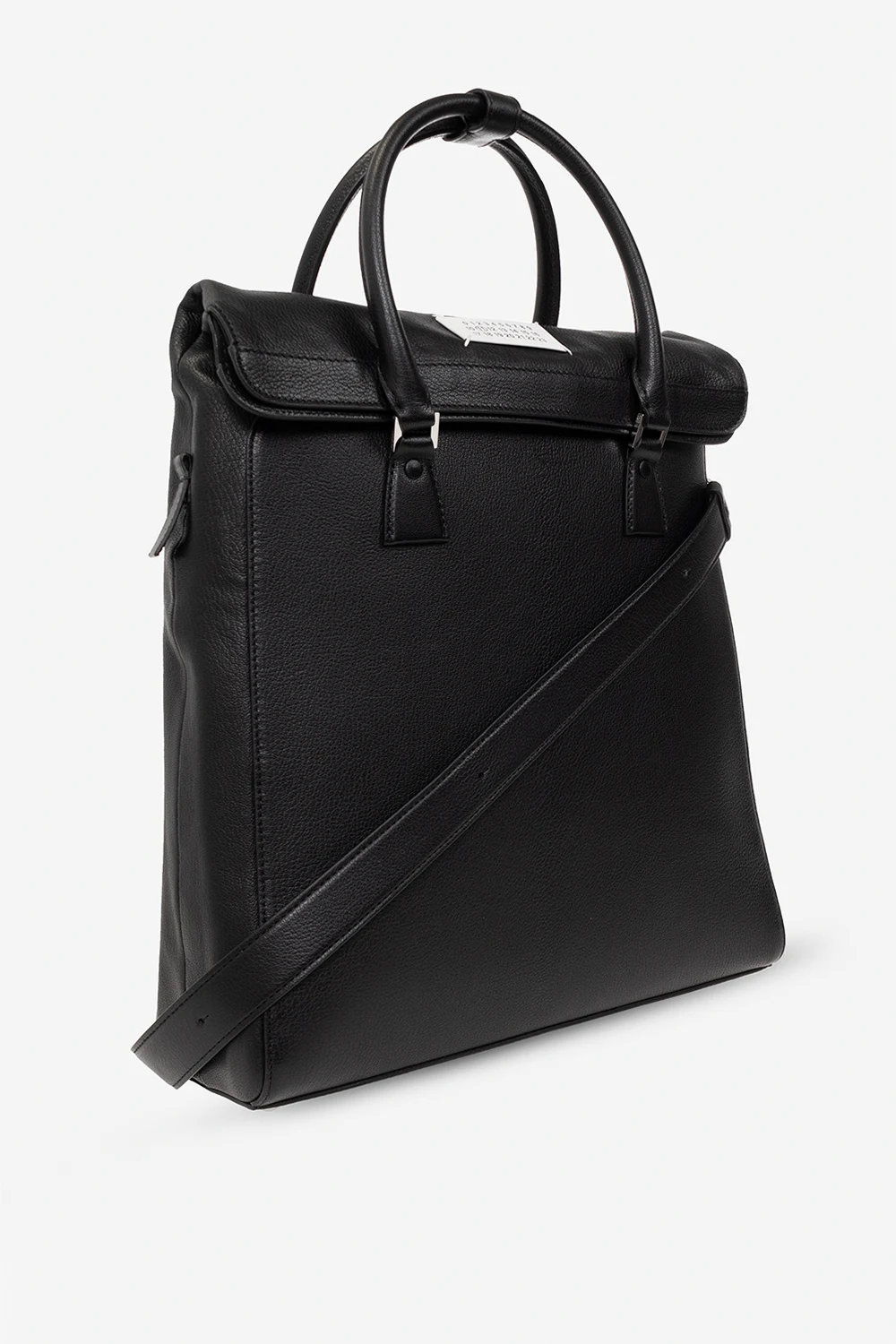 Black '5AC' shoulder bag from Maison Margiela. Crafted from textured calf leather, this design features a white logo patch on the front, two half-round handles, a detachable shoulder strap, gold-tone metal hardware and one internal compartment.