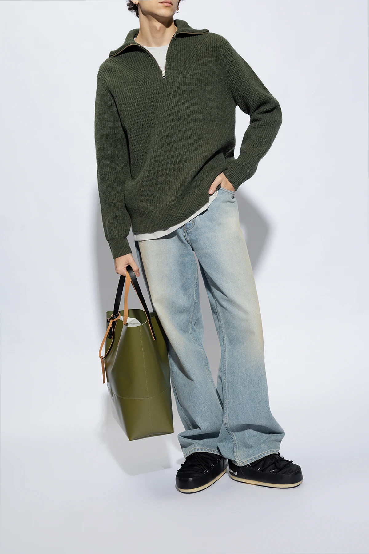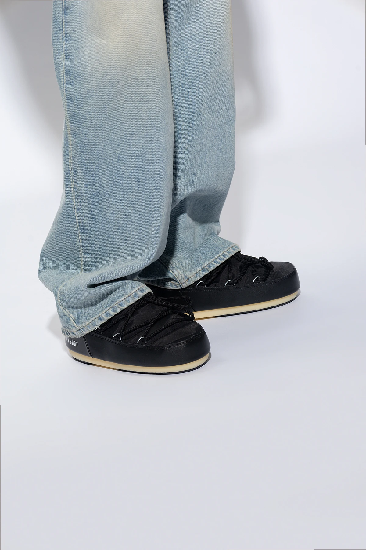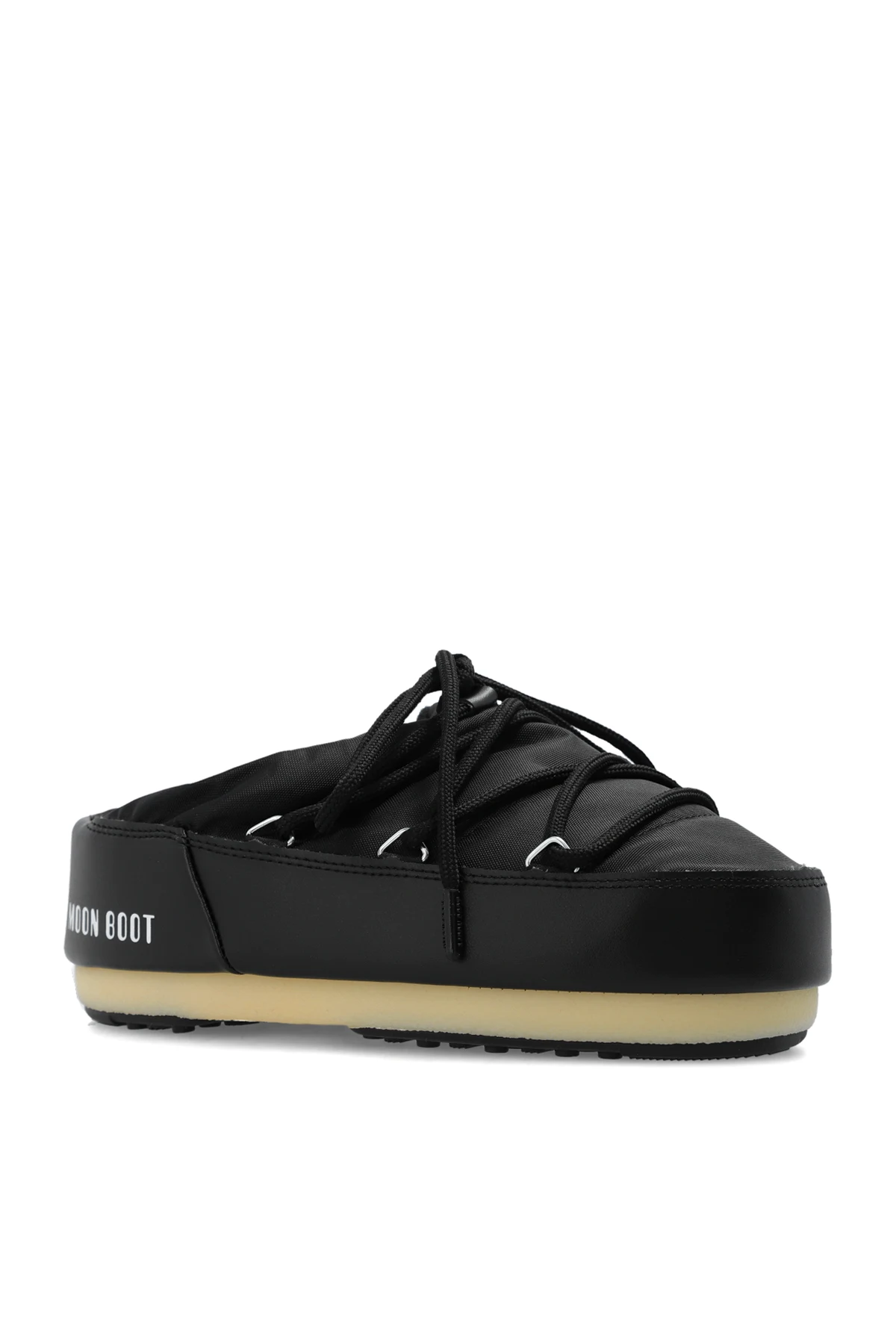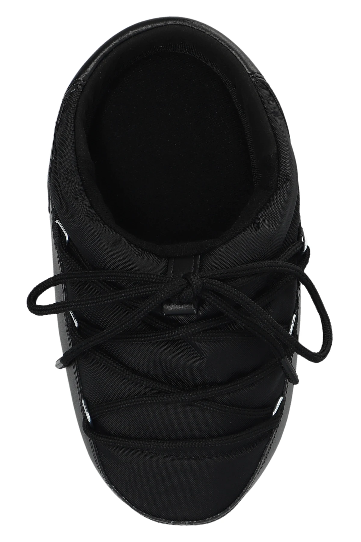 Black shoes from Moon Boot. Made of waterproof material with a slip-on silhouette, this model sits on a black tread rubber sole with suction cups to ensure superb grip on any surface and showcases a white logo printed on the sides, silver-tone metal hardware and decorative lace-up detailing on the front.
