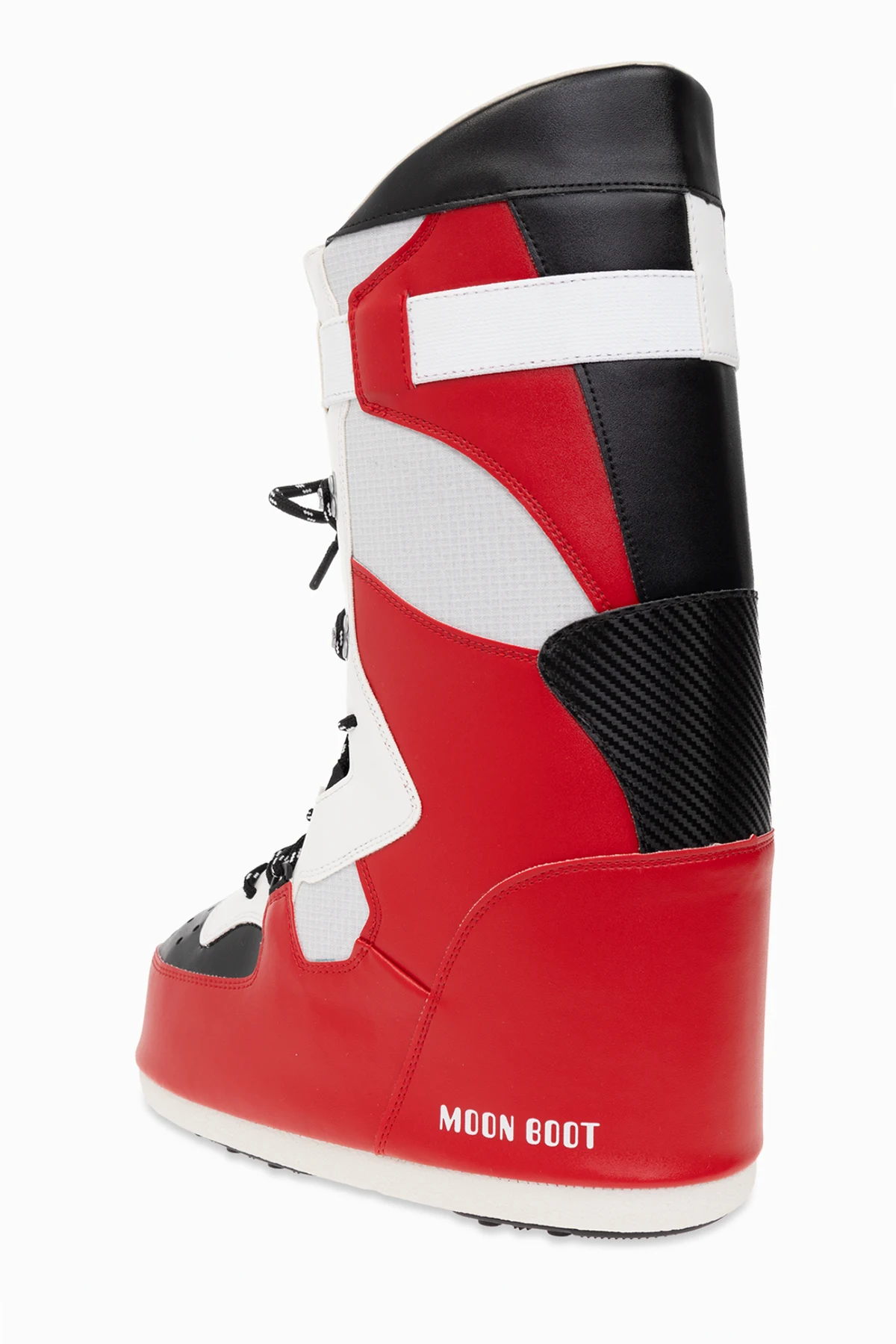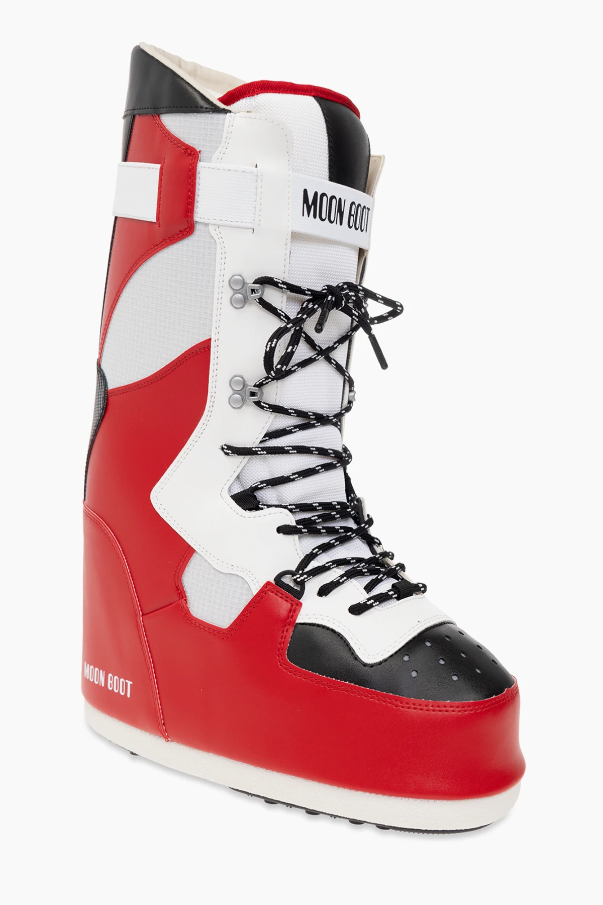 Red, white and black ‘Sneaker Hi’ snow boots from Moon Boot. Made of waterproof material, this lace-up model sits on a white and black tread rubber sole with suction cups to ensure superb grip on any surface and showcases a perforated front and logo detailing. This model is inspired by basketball style, while its oversized, insulated silhouette is reminiscent of the original 1969 design.