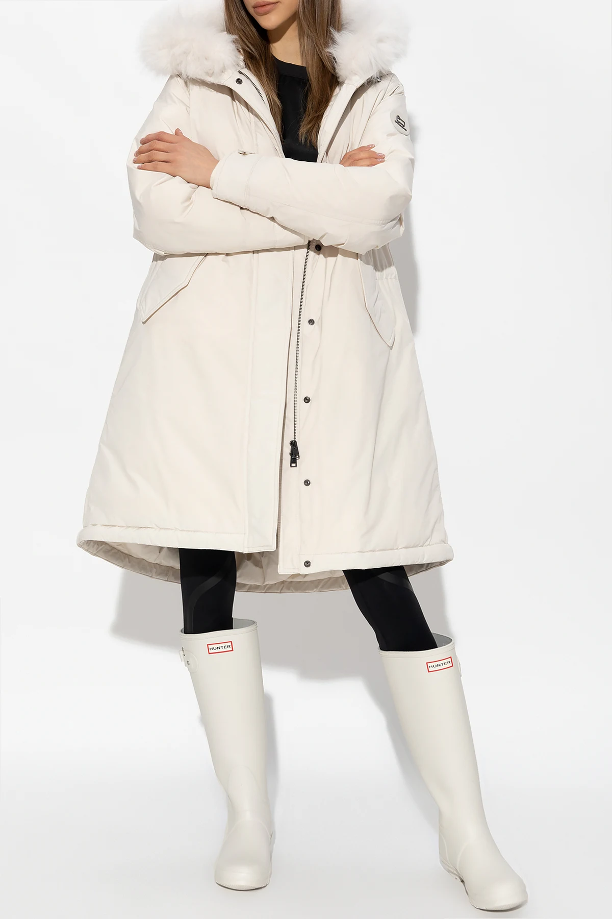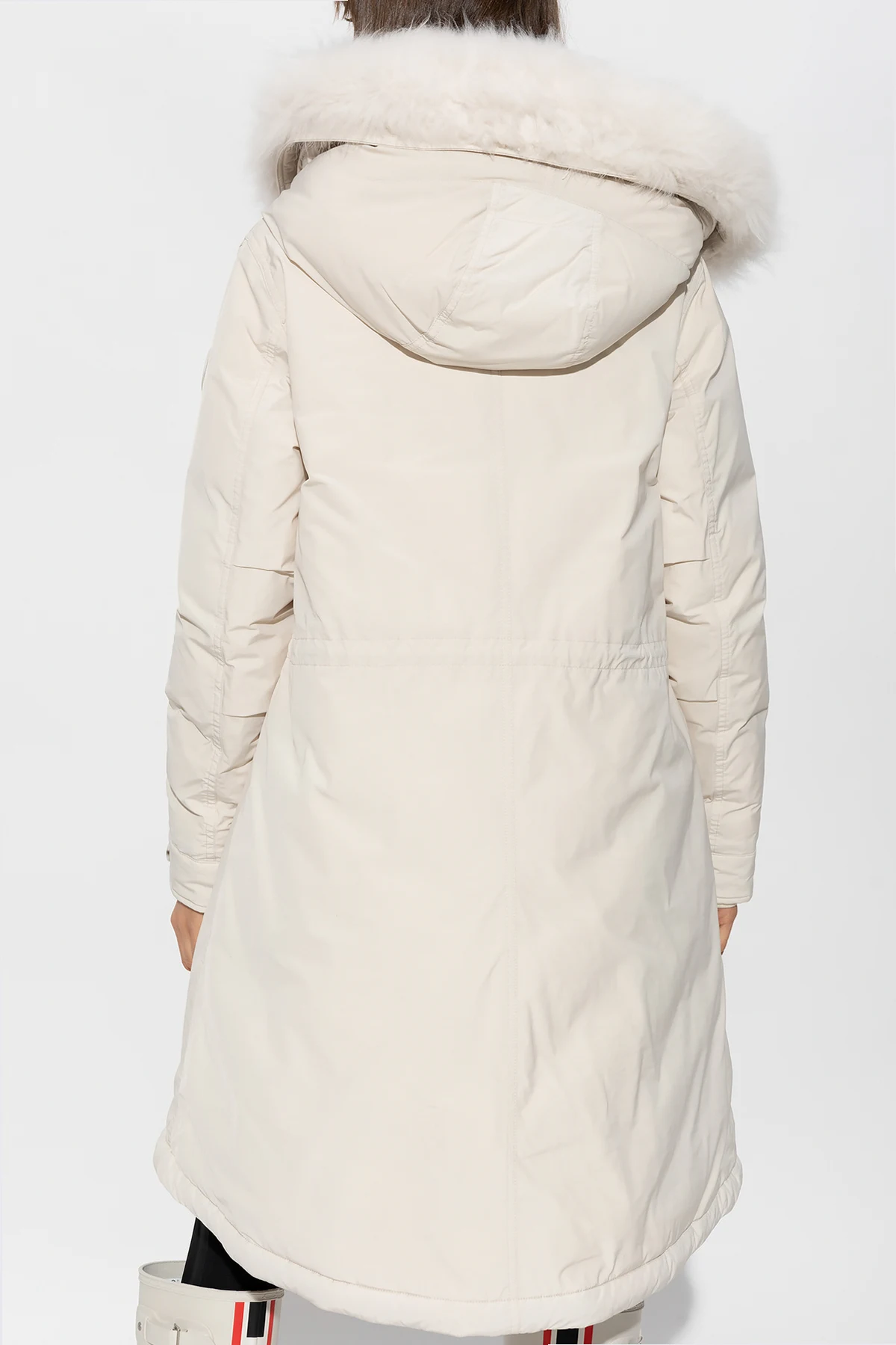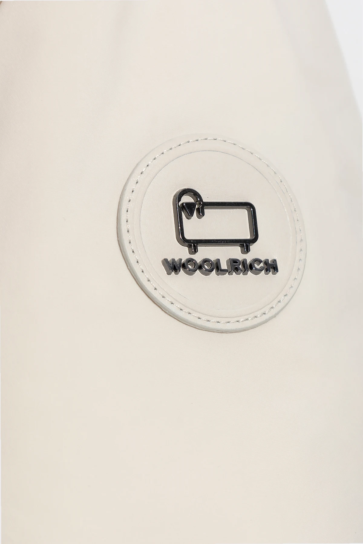 Cream down coat from Woolrich. Emblazoned with a logo patch, this style secures with a zipper and snaps and features a detachable hood, two flapped pockets, a drawcord-adjustable hem and long sleeves with elasticated cuffs.