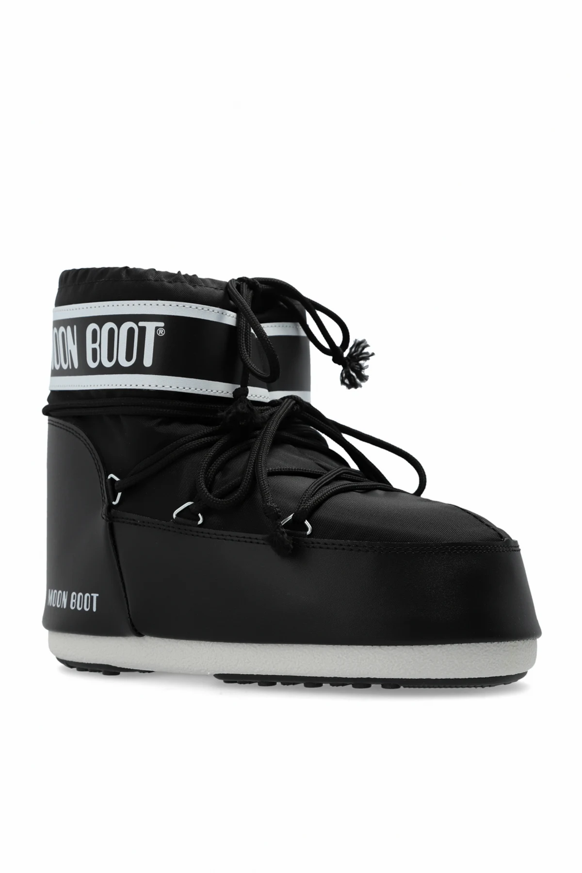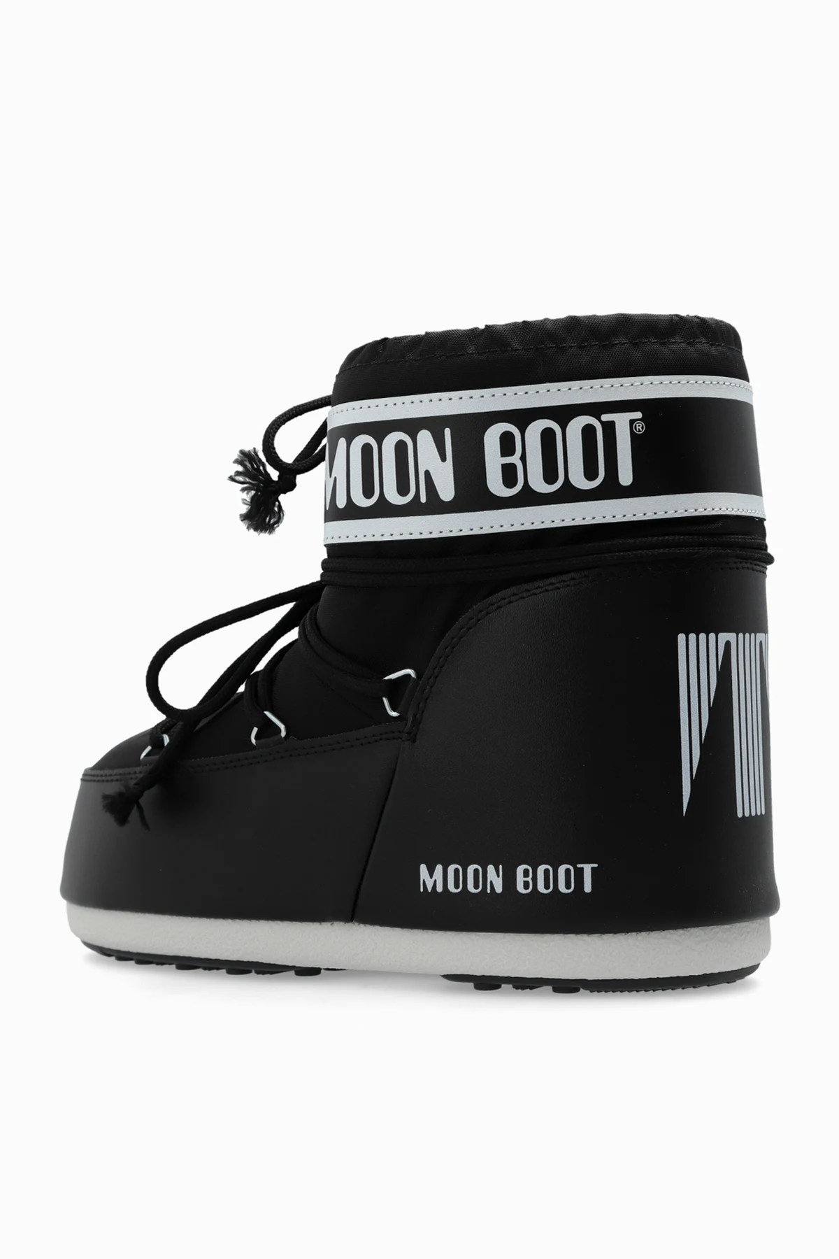 Introducing the Icon Low Nylon Snow Boots by Moon Boot, an epitome of luxurious winter footwear. These boots boast a distinctive design with a broad shape and rounded toe, providing a perfect blend of style and functionality. Crafted for men, they offer robust construction and modern aesthetics that cater to the discerning gentleman. Constructed from durable nylon for the exterior and featuring a soft, white lining for unparalleled warmth and comfort, these boots are designed to withstand harsh winter conditions. The solid, thick soles ensure exceptional traction on snow and ice, making them indispensable for winter escapades. The sleek black color, complemented by white branding and logos, adds a touch of elegance and recognizability. The boots feature a wide strap around the ankle, adorned with the iconic "Moon Boot" inscription, enhancing their unique appeal. Furthermore, the lacing system offers a snug fit and additional support. Why Choose This Product? Durable Nylon Construction: Ensures longevity and resistance to weather conditions. Comfort and Warmth: Soft, insulated lining keeps your feet cozy in the coldest temperatures. Superior Traction: Thick soles provide excellent grip on slippery surfaces. Elegant and Recognizable Design: Black color with white branding for a sophisticated, standout look. Perfect Fit: Lacing system allows for a custom, secure fit.