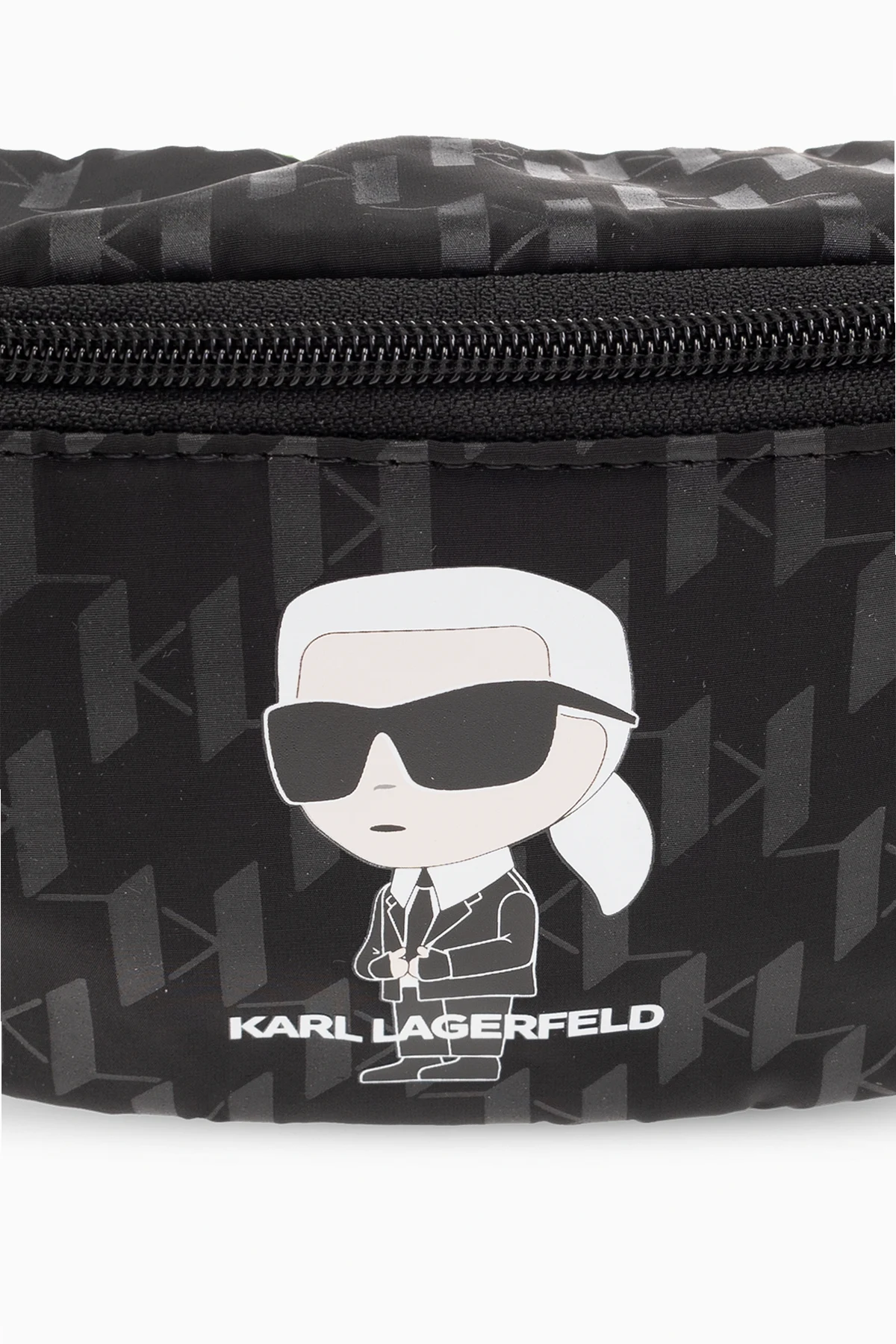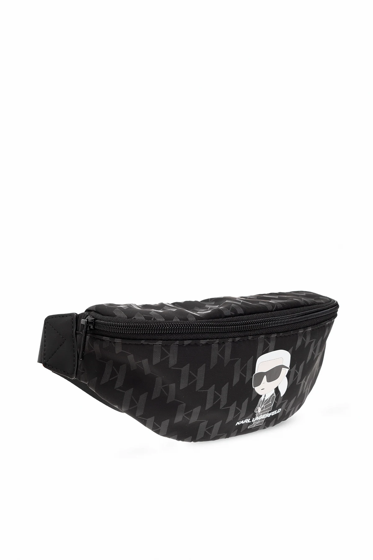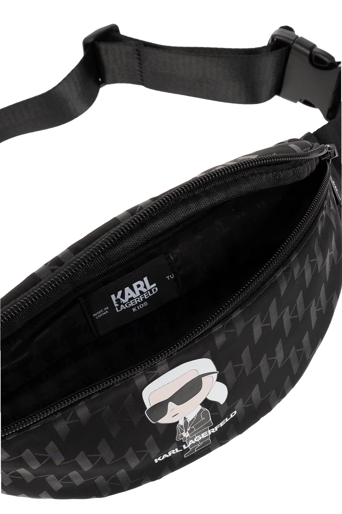 Black belt bag from Karl Lagerfeld Kids. Fastened with a zip, this model features a logo print, adjustable belt, one internal compartment and black metal hardware.