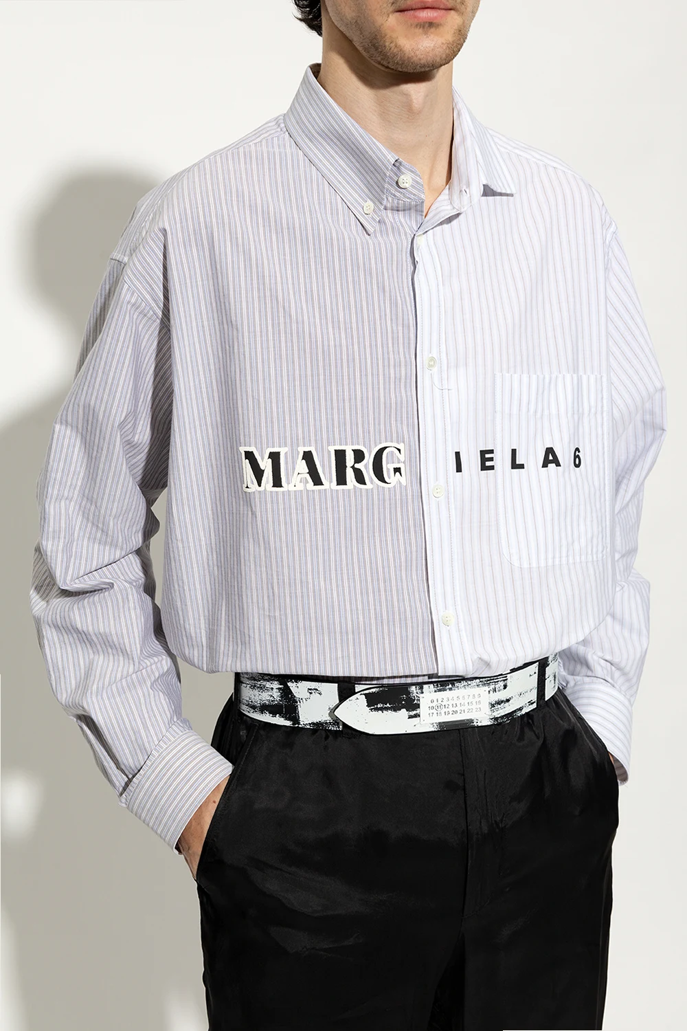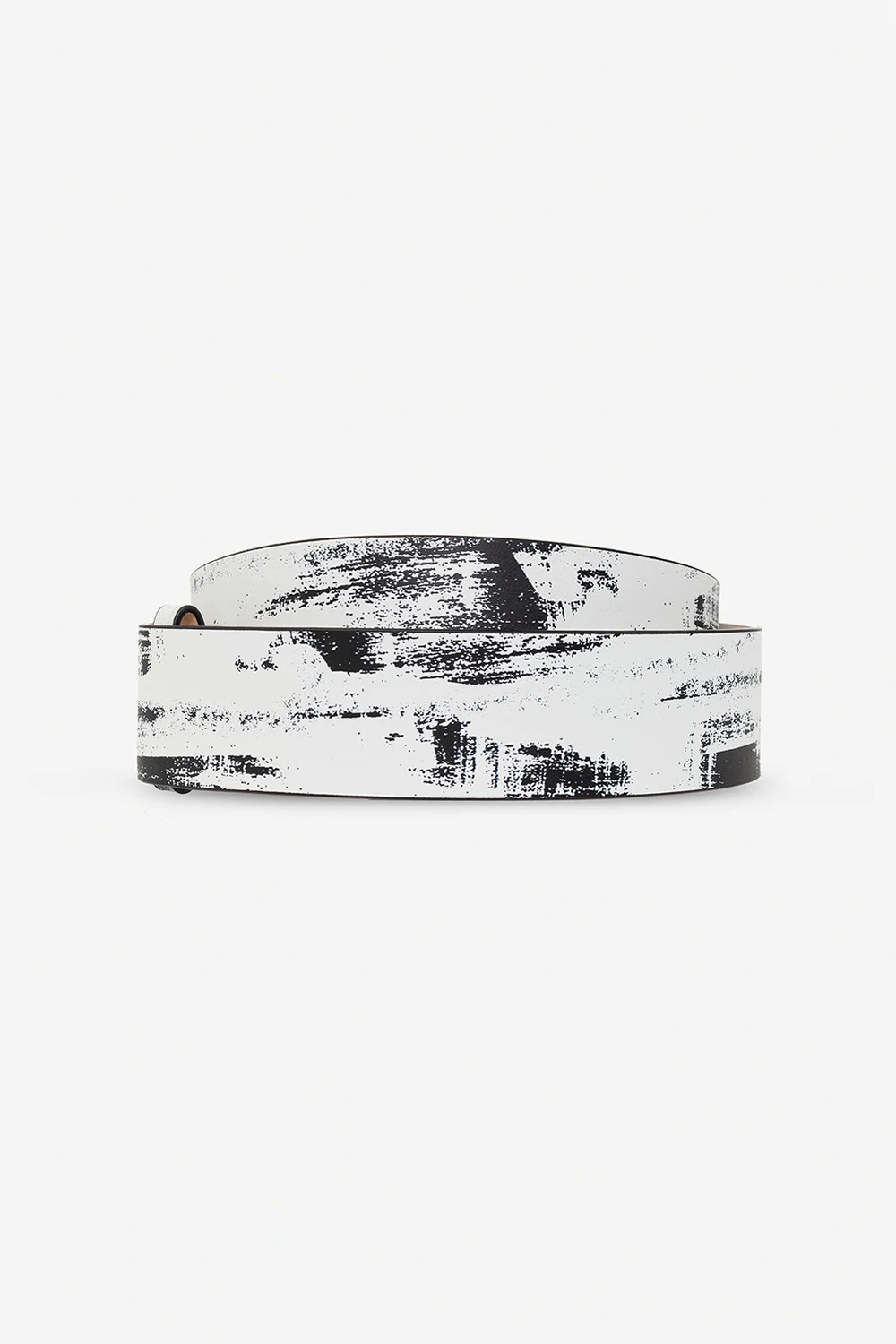 White and black belt from Maison Margiela. Made of leather, this item features a pattern and logo detail.