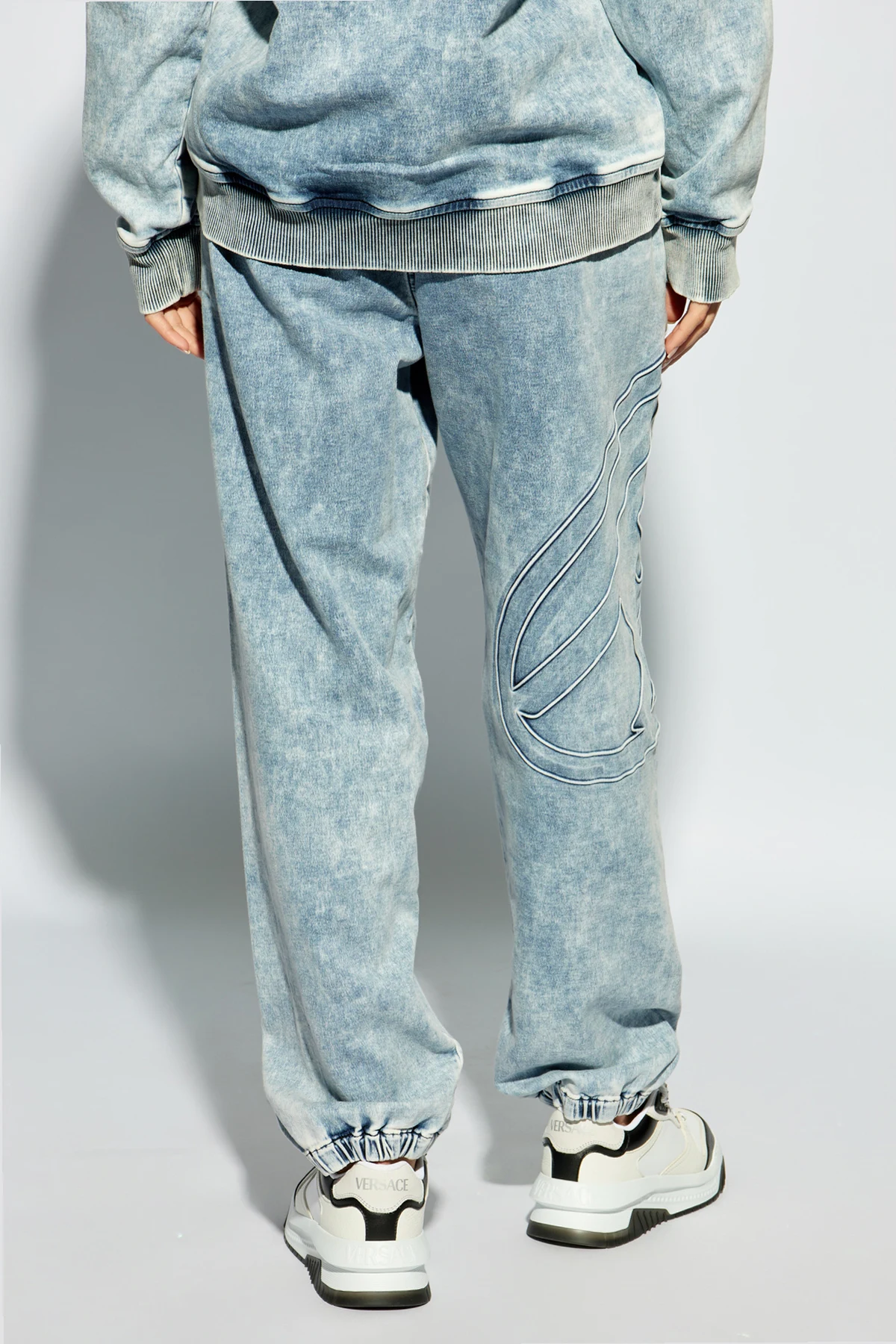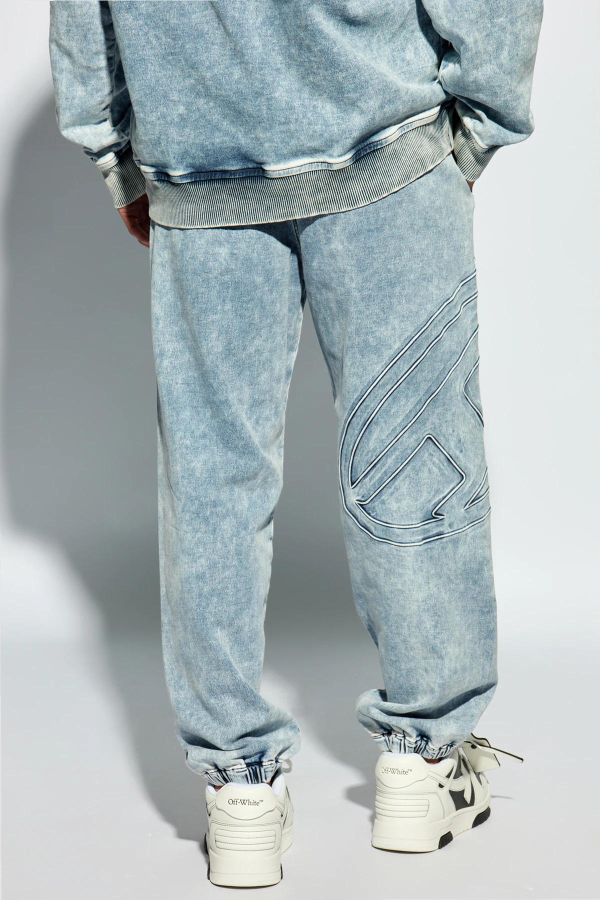 Introducing the Diesel D-LAB-S2 trousers, a sartorial blend of casual sophistication and vintage flair. Crafted from a premium mix of 98% cotton and 2% elastane, these trousers offer both comfort and durability. The dominant light blue denim, treated with an acid wash effect, exudes a fashionable, aged appearance that is both eye-catching and distinctive. The trousers boast a relaxed, slightly tapered fit reminiscent of jogger-style jeans, redefined for a contemporary aesthetic. The elastic waistband, adjustable with drawstrings, ensures a perfect fit while enhancing the garment's casual elegance. A standout feature is the decorative stitching in the shape of a 'D' on the left leg, an emblem of the Diesel brand that adds an exclusive touch to the design. This meticulous detailing not only enhances the trousers' visual appeal but also signifies the high-quality craftsmanship inherent to Diesel products. Why Purchase This Product? Exceptional Quality: Meticulously crafted with a blend of cotton and elastane for comfort and longevity. Unique Design: The acid wash effect and decorative 'D' stitching lend a distinctive, vintage-inspired look. Versatility: Perfect for casual outings yet elegant enough for more sophisticated ensembles. Adjustable Comfort: Equipped with an elastic waistband and drawstrings for a customizable fit.