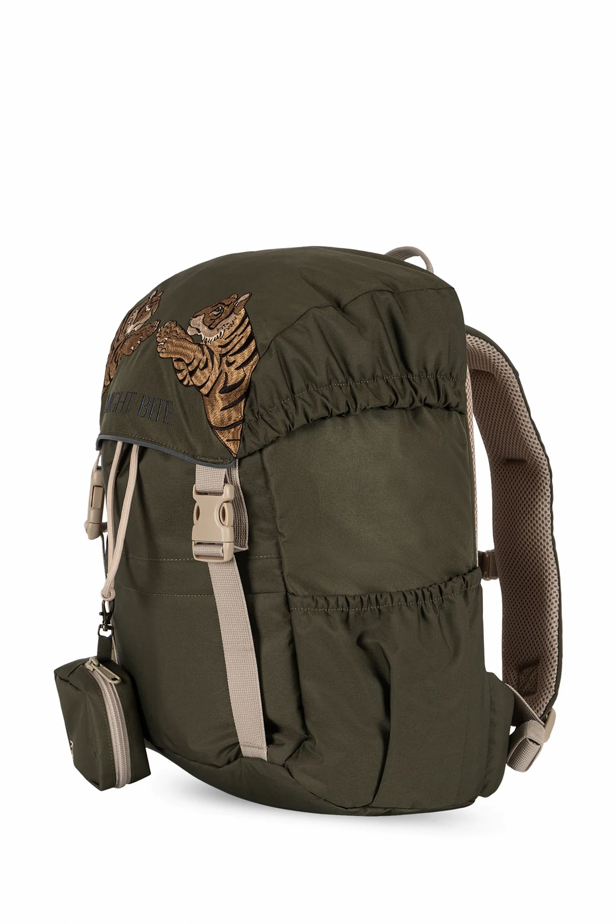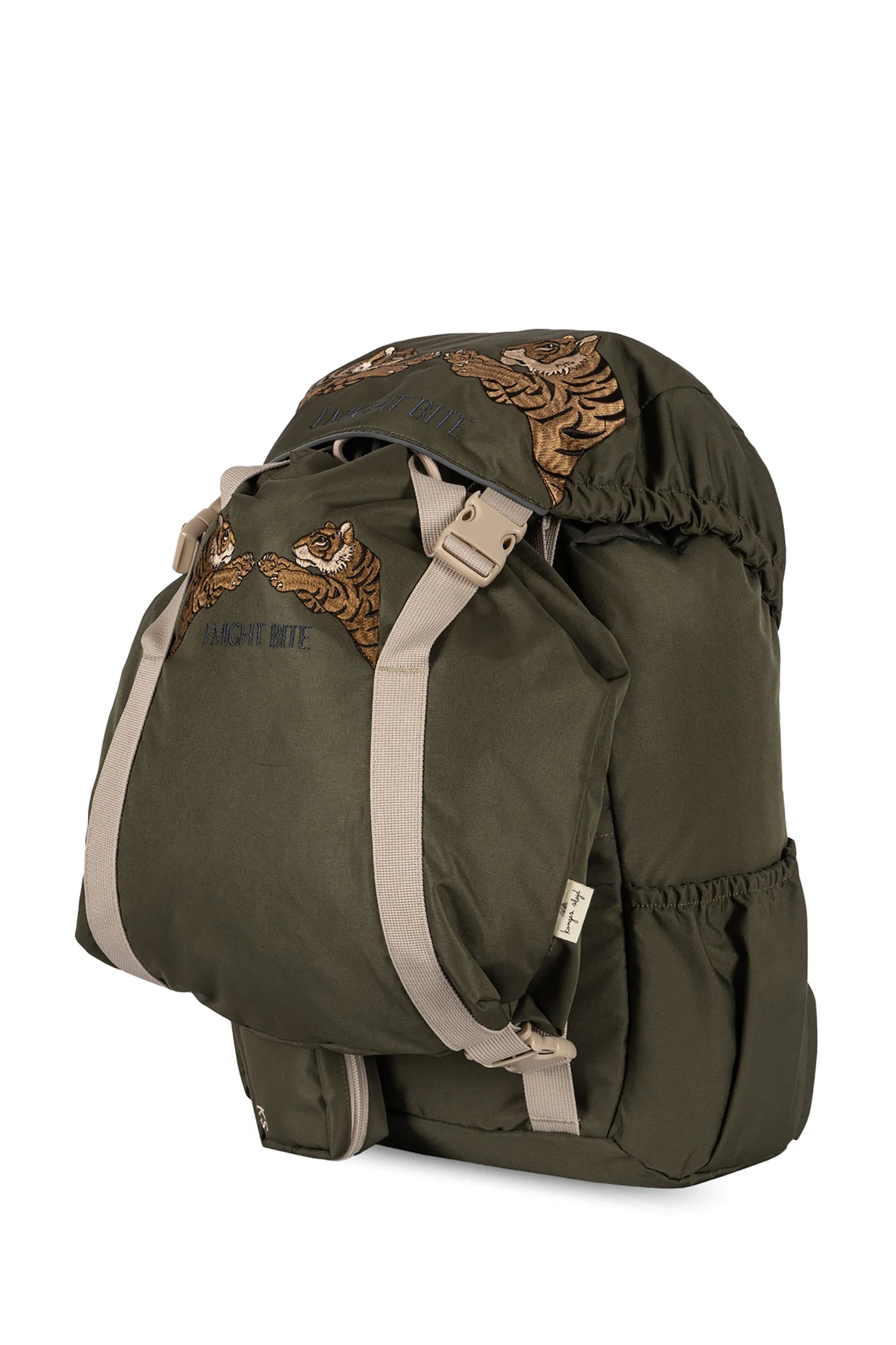 Introducing the 'Clover' backpack from the exclusive collection by Konges Sløjd, where functionality meets avant-garde design. Crafted from a high-quality, smooth textured material that boasts the resilience and sleekness of technical fabric or nylon, this backpack is presented in a dominant green hue, embodying both elegance and practicality. The 'Clover' backpack features a meticulously organized interior with multiple compartments and pockets, including external zippered pockets and side pockets for easy access. The distinctive embroidery of a tiger and the bold "MIGHT BITE" inscription on the upper part elevate the design, adding a layer of uniqueness and fierce style. Adjustable shoulder straps in a contrasting light color ensure a comfortable fit, while the durable buckles and drawstrings allow for volume adjustment and secure storage. Designed with an ergonomic construction, the backpack includes a padded back support and a waist belt for additional support, making it a practical favorite for school and beyond. A special feature is the integrated rain cover in a darker shade, marked with the initials "KS", offering protection against adverse weather conditions. Additionally, the rear carrying system with padded straps, a chest belt, and a mesh back panel enhances air circulation and comfort during wear. Accompanying the backpack are practical accessories, including a gym bag that can be easily attached and a small purse for essentials, further emphasizing the backpack's functionality and thoughtful design. Why Purchase the 'Clover' Backpack? Exclusive design with unique tiger embroidery and "MIGHT BITE" motif. Ergonomic features including adjustable straps, padded back, and waist belt for superior comfort. Functional accessories like a rain cover, gym bag, and purse included. Multiple compartments and pockets for organized storage. Durable material and construction for long-lasting use.