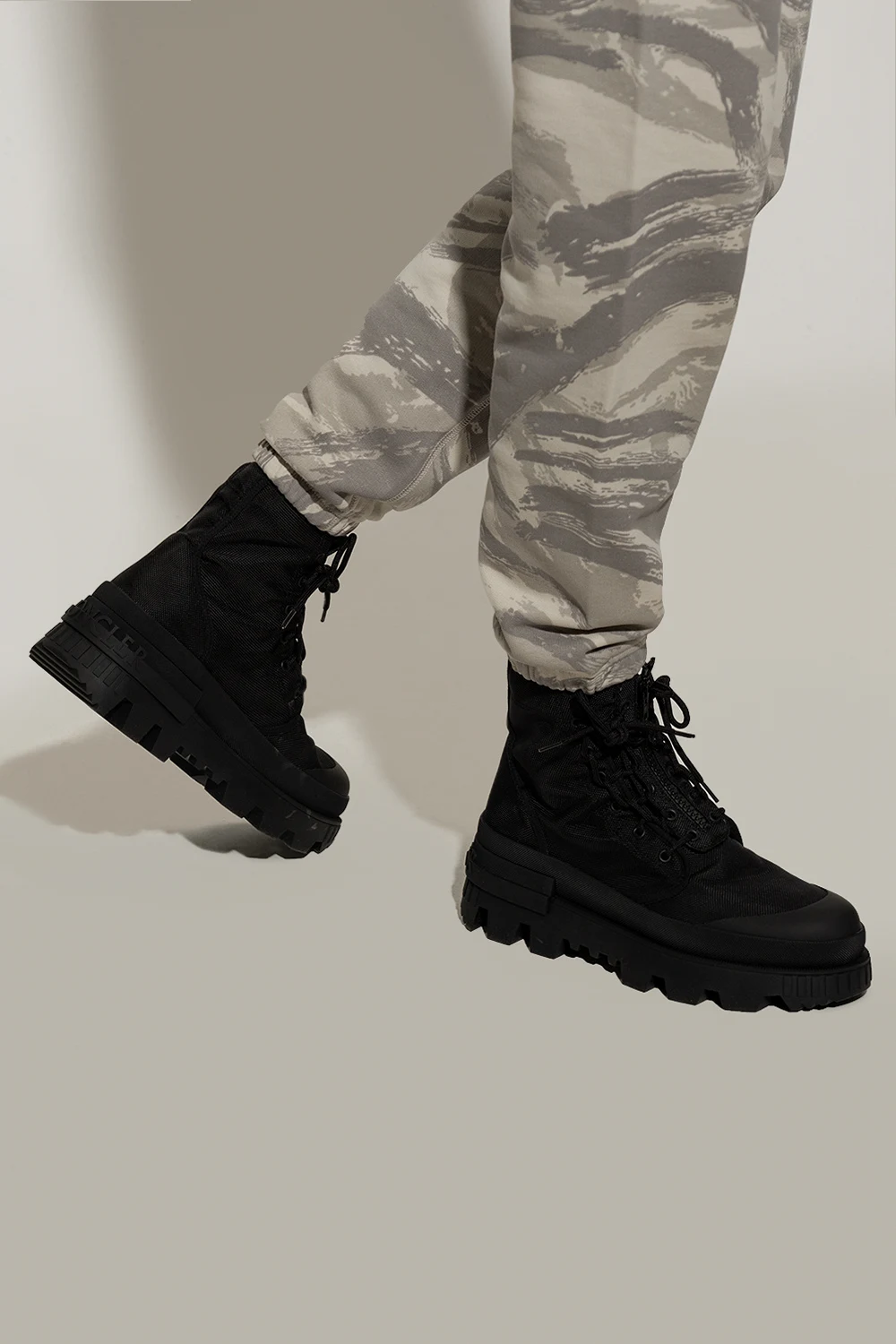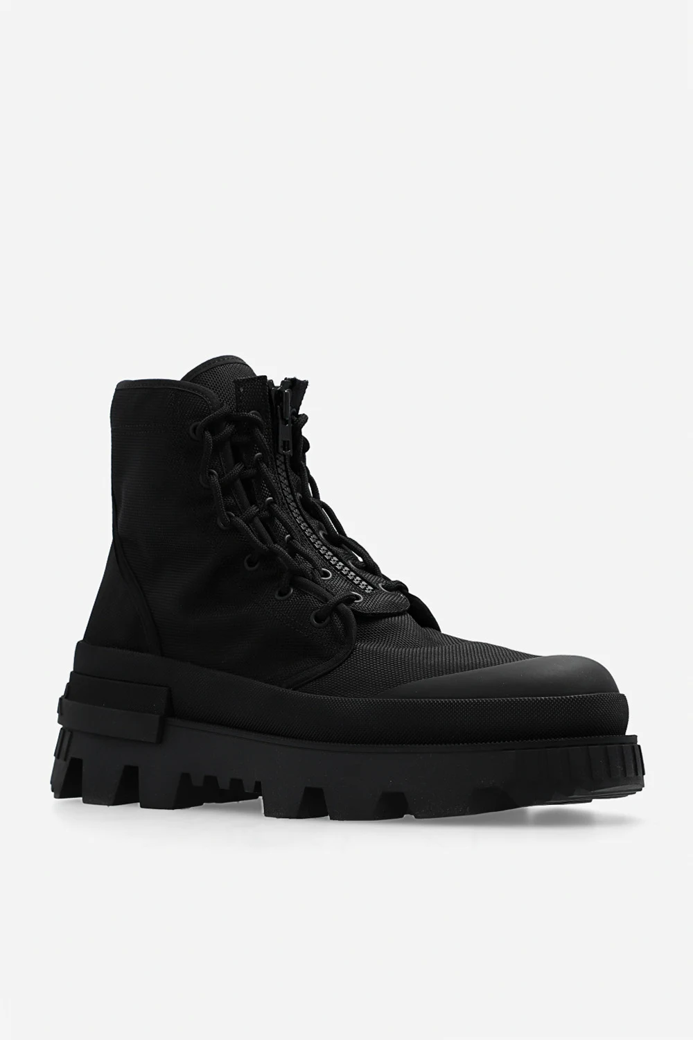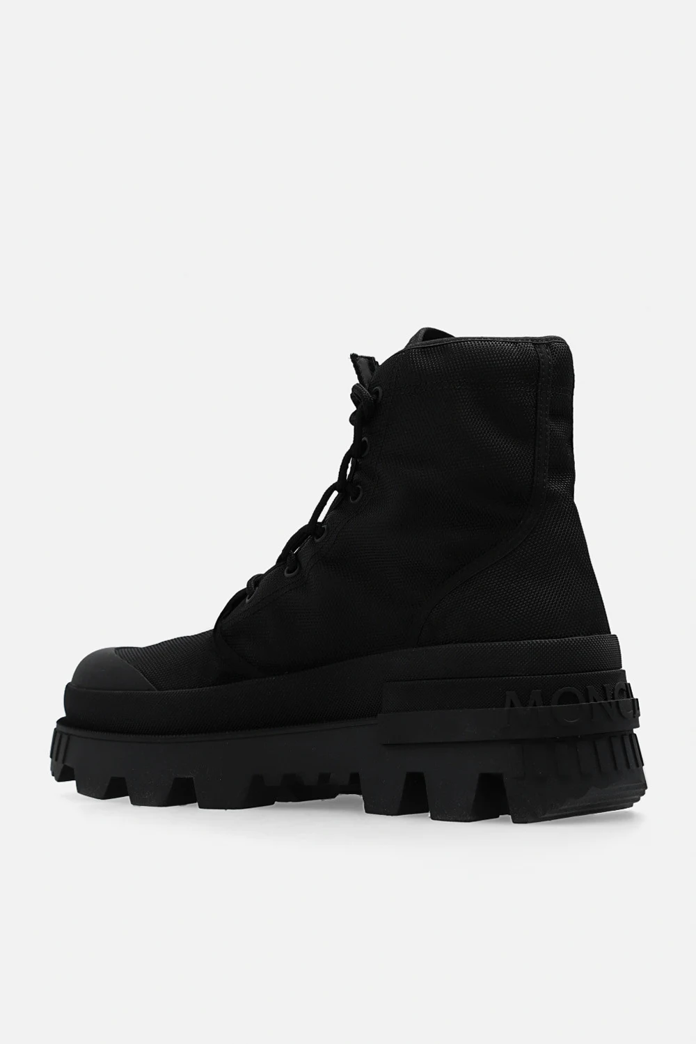 Black ankle boots from Moncler Genius, the ‘4 Moncler Hyke’ collection. Crafted from fabric, this lace-up model sits on a black rubber sole and showcases an embossed logo.