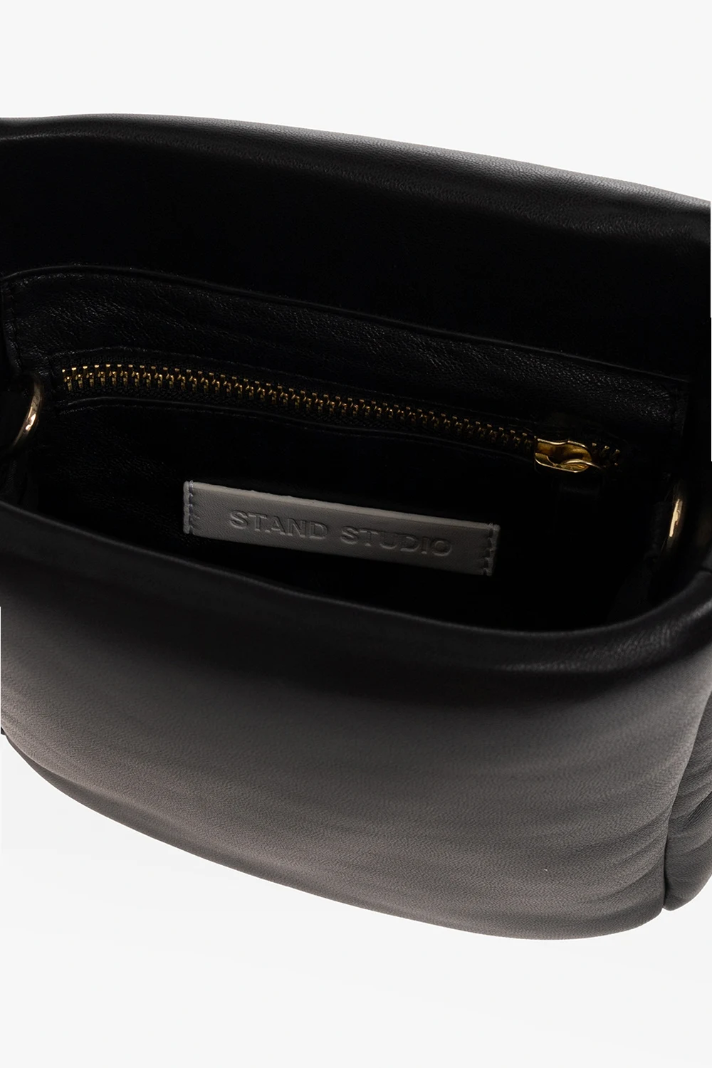 Black ‘Diya’ shoulder bag from Stand Studio. Made of lamb leather, this model is complete with a detachable half-round chain handle, detachable, adjustable shoulder strap, gold-tone metal hardware and one internal compartment with one zip pocket.