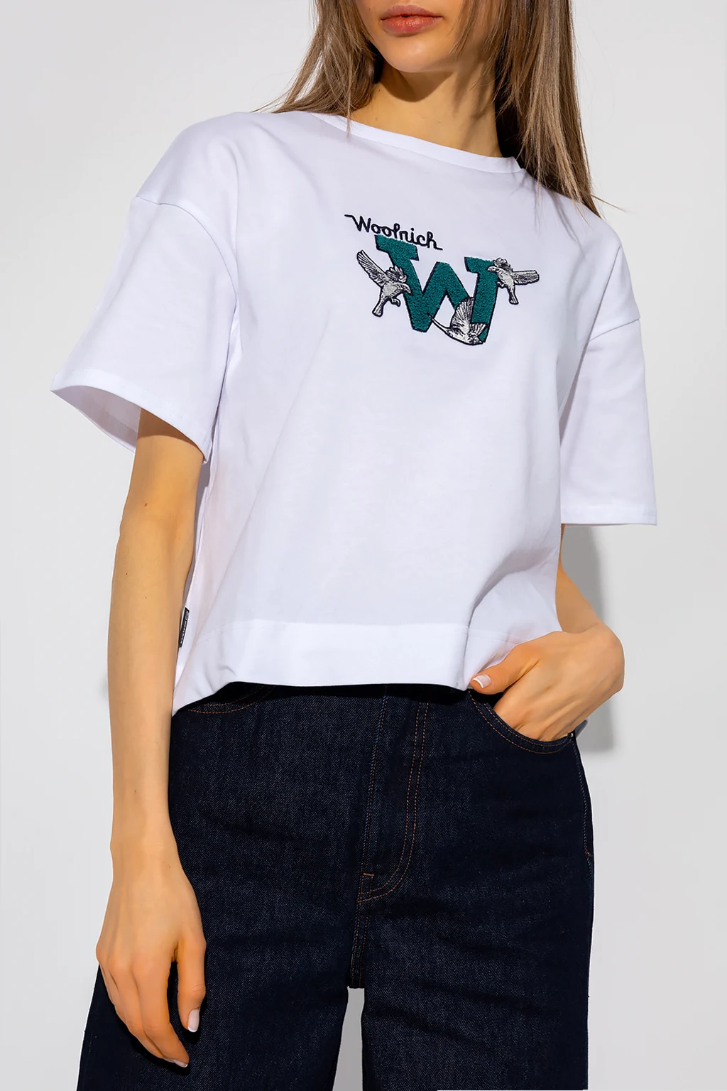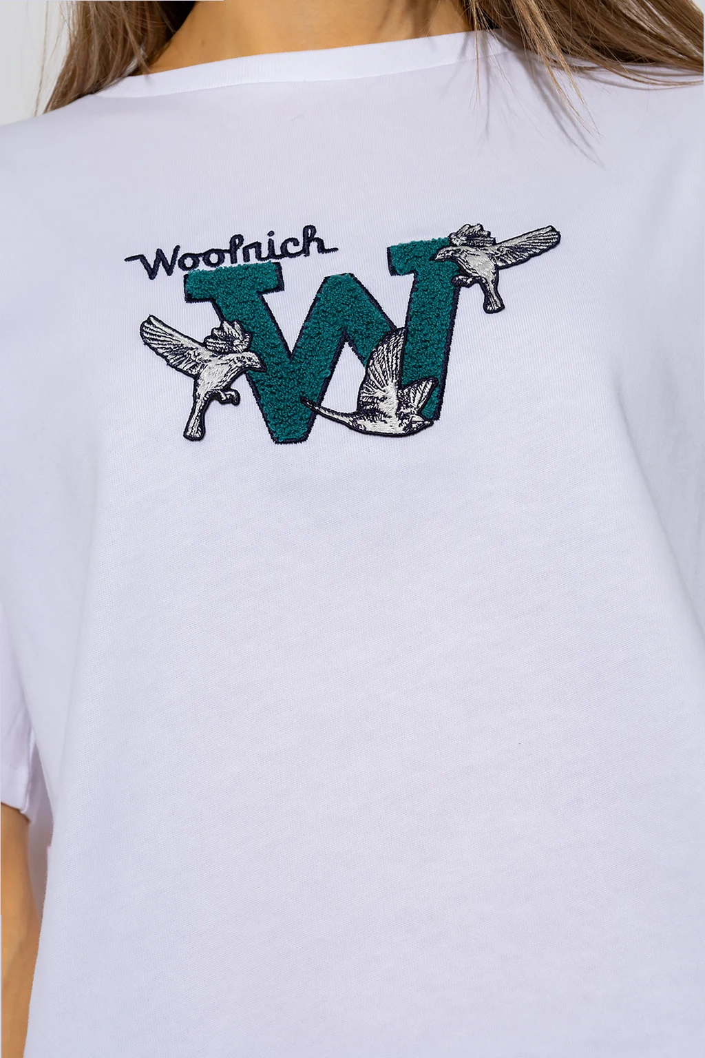White loose-fitting T-shirt from Woolrich. Made of organic cotton from sustainable farms, this short sleeve design features a logo embroidery, green, white and black terrycloth patch with an animal motif and a ribbed crew neck.