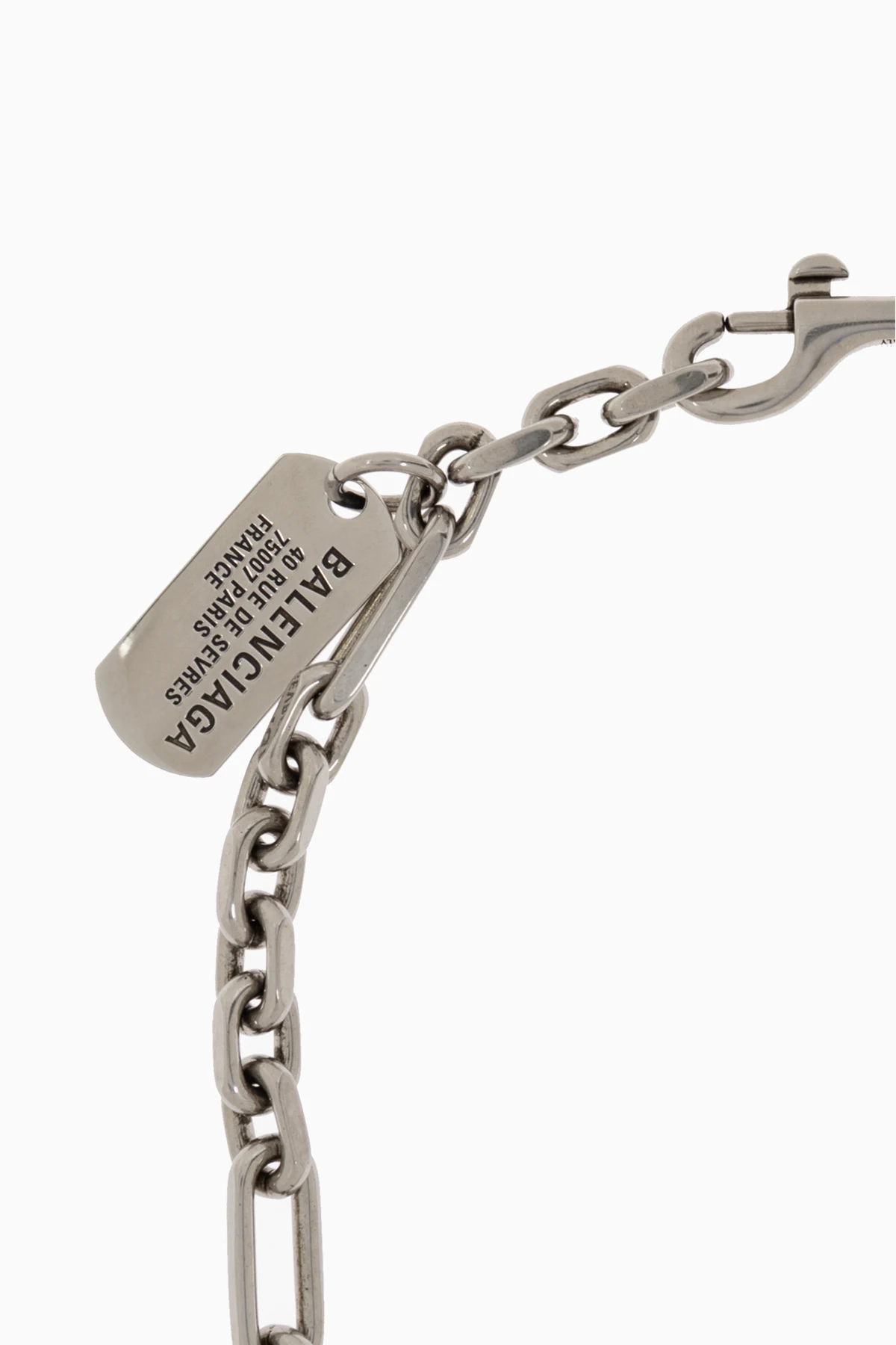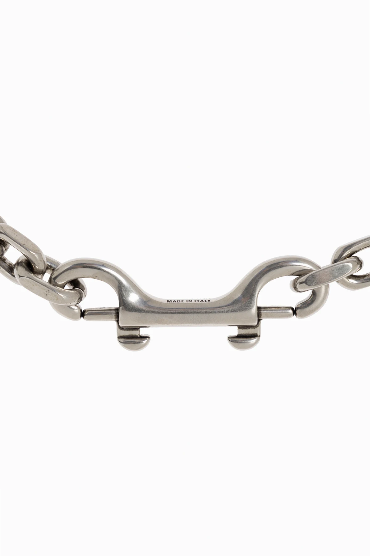 Introducing the epitome of refined elegance, the Balenciaga Silver Brass Necklace. Crafted with meticulous precision, this necklace is a harmonious blend of sophistication and contemporary design. Its unique chain, reminiscent of a sequence of interconnected, flattened links that suggest the aesthetic of sleek tubes, is nothing short of a statement piece. The dominant silver hue ensures versatility, allowing it to complement an array of palettes and patterns seamlessly. The necklace proudly features a metal pendant bearing the engraved logo of Balenciaga, serving not only as a hallmark of authenticity but also as a testament to the wearer's discerning taste. This detail, combined with the ease of a lobster clasp closure, underscores both the aesthetic appeal and functionality of this exquisite accessory. Whether draped elegantly around the neck to elevate casual attire or adding a touch of glamour to evening wear, this necklace is designed to make a statement. Why Purchase This Product? Exclusive Design: Stand out with a piece that blends the heritage of Balenciaga with modern elegance. Versatile Elegance: Its silver color and unique link design make it a perfect match for a wide range of outfits. Brand Authenticity: The engraved Balenciaga logo pendant serves as a bold declaration of style and luxury. Effortless Wearability: Designed with a lobster clasp for ease of use, ensuring a seamless adornment experience.