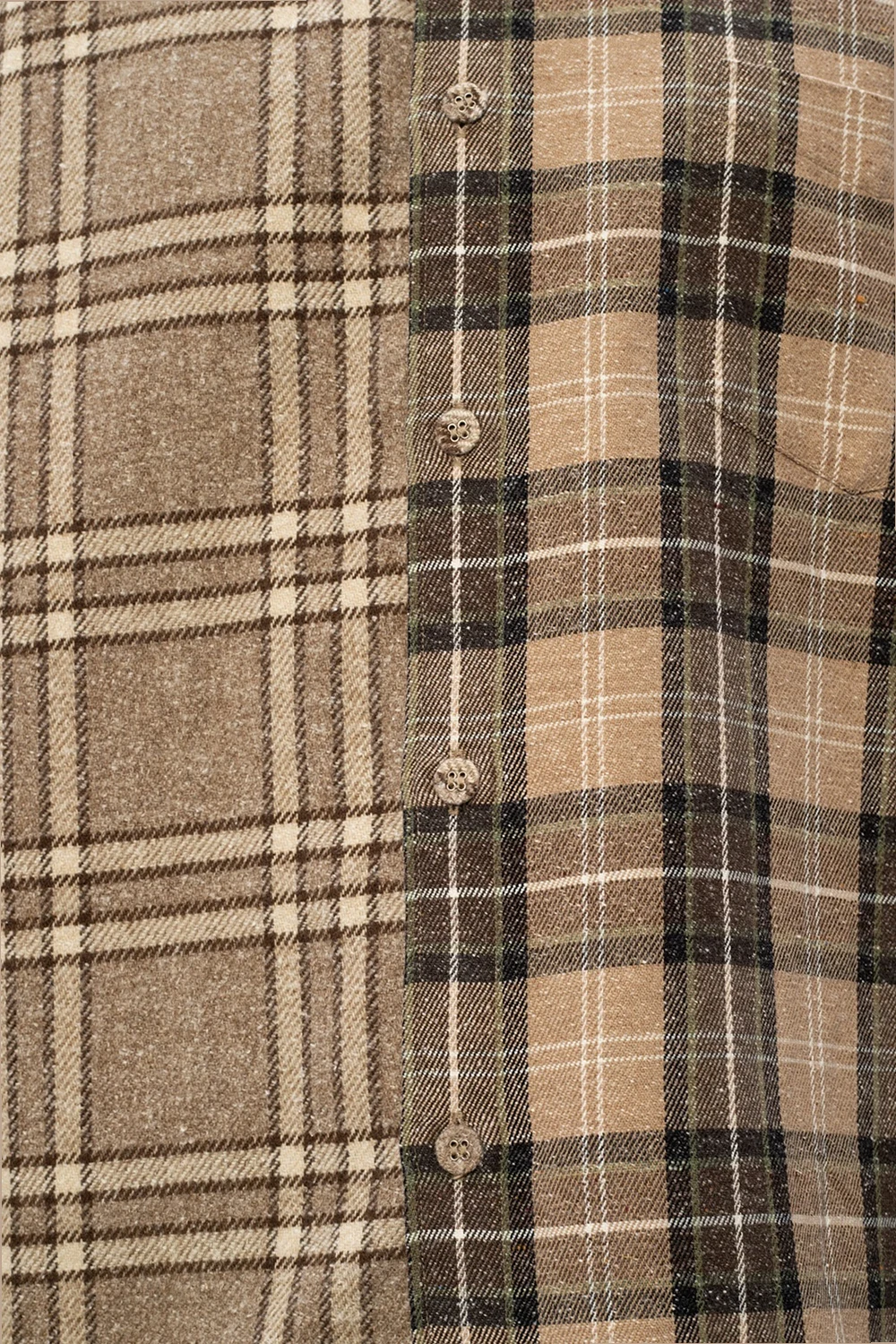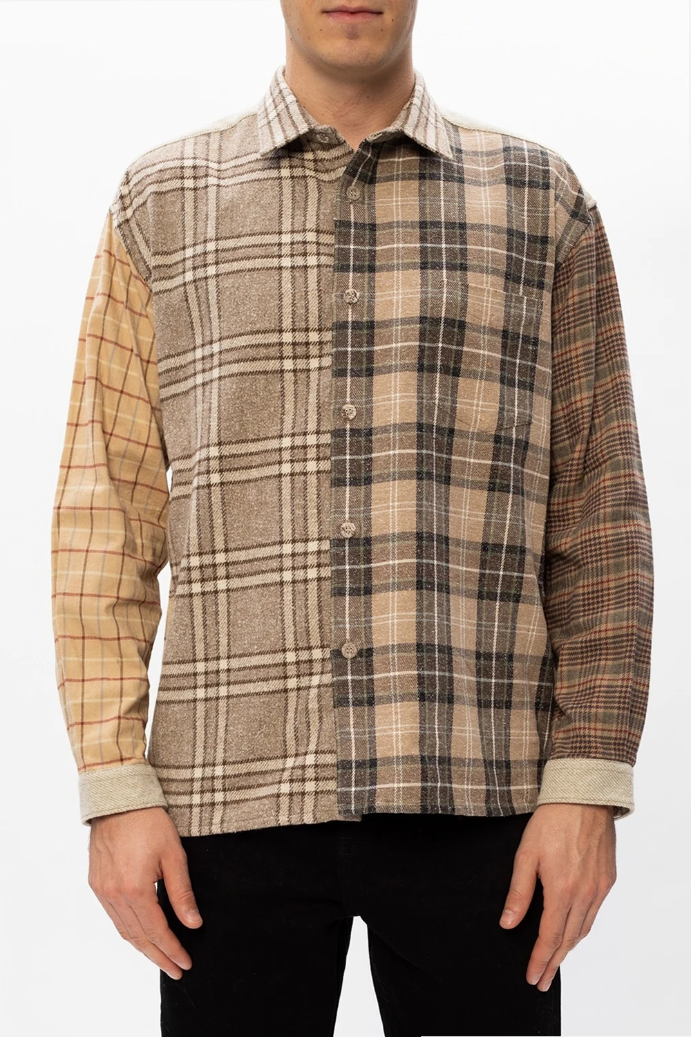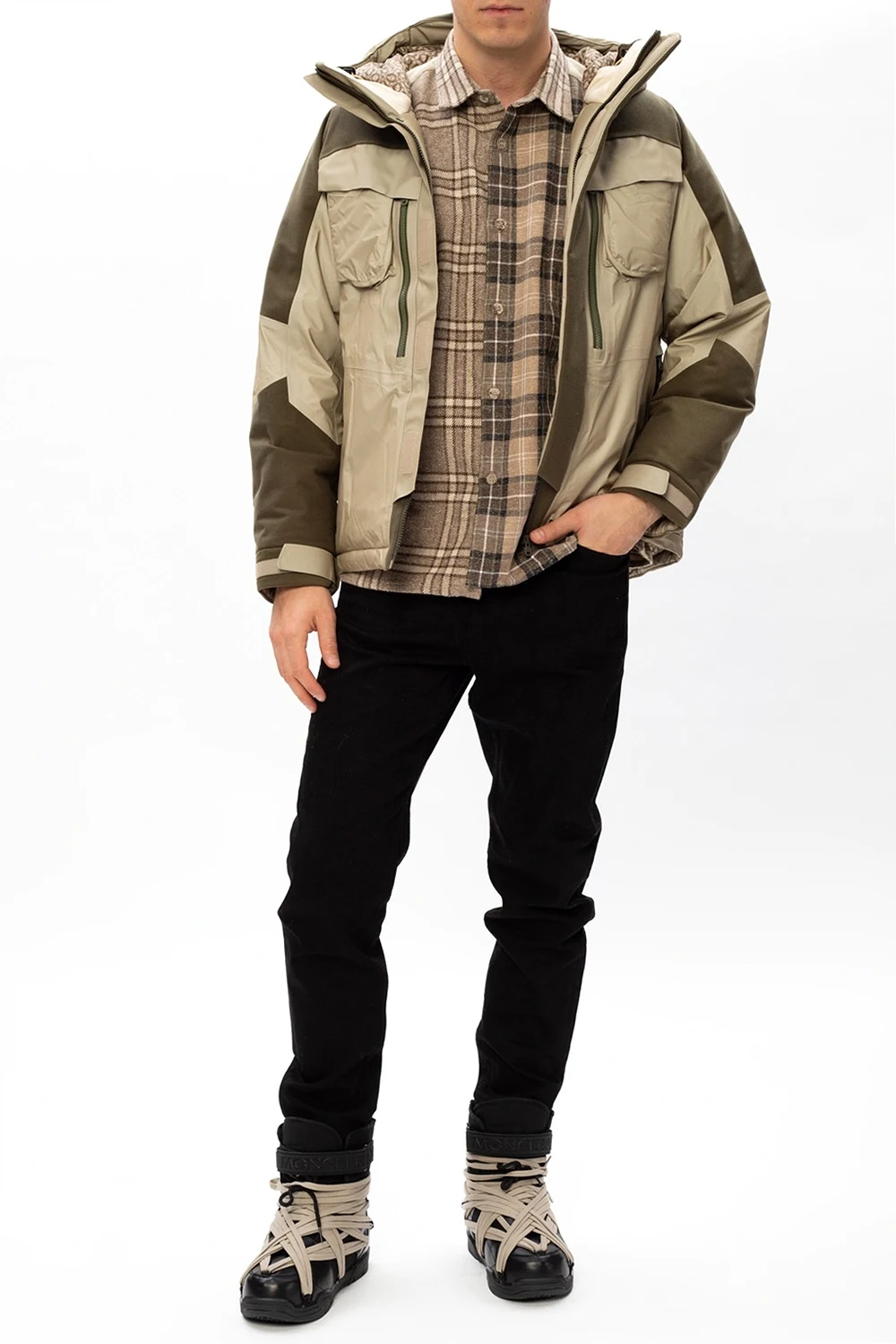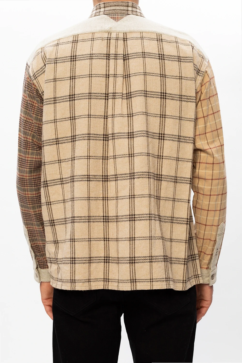 Cream, grey and brown shirt from White Mountaineering. Rendered in checked motif, this casual garment fastens via buttons and is complete with a slip chest pocket.