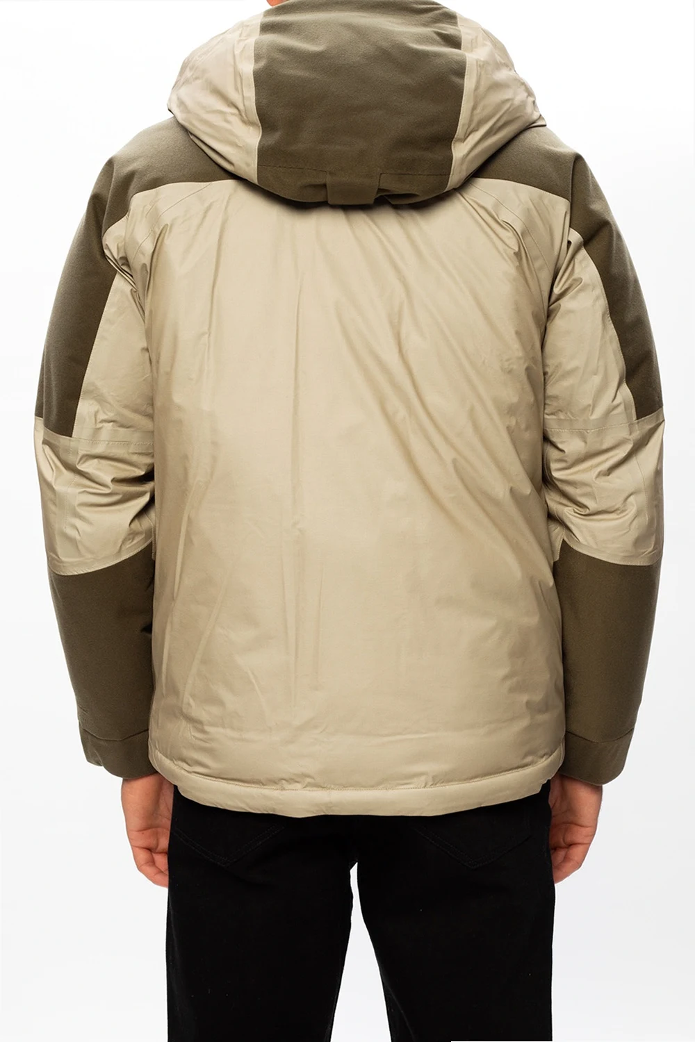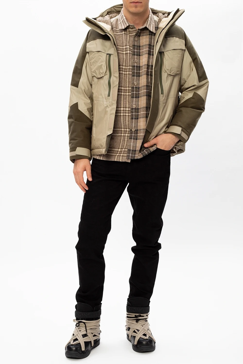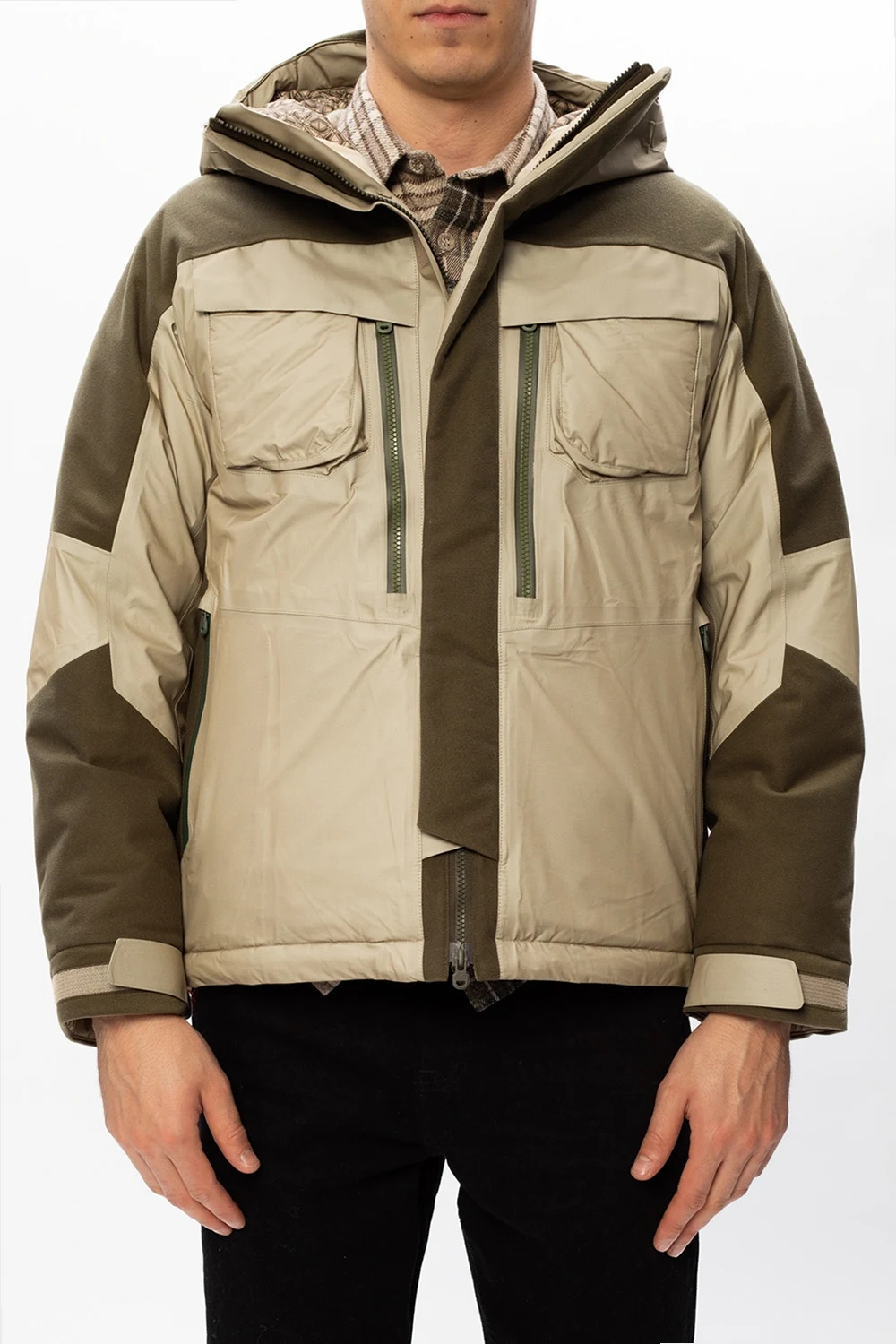 Green down jacket from White Mountaineering. Equipped with a drawcord-adjustable hood, this winter-savvy garment fastens via zip and velcro closures and employs four zipped and two slip pockets on the front and a drawcord channel at the bottom hem.