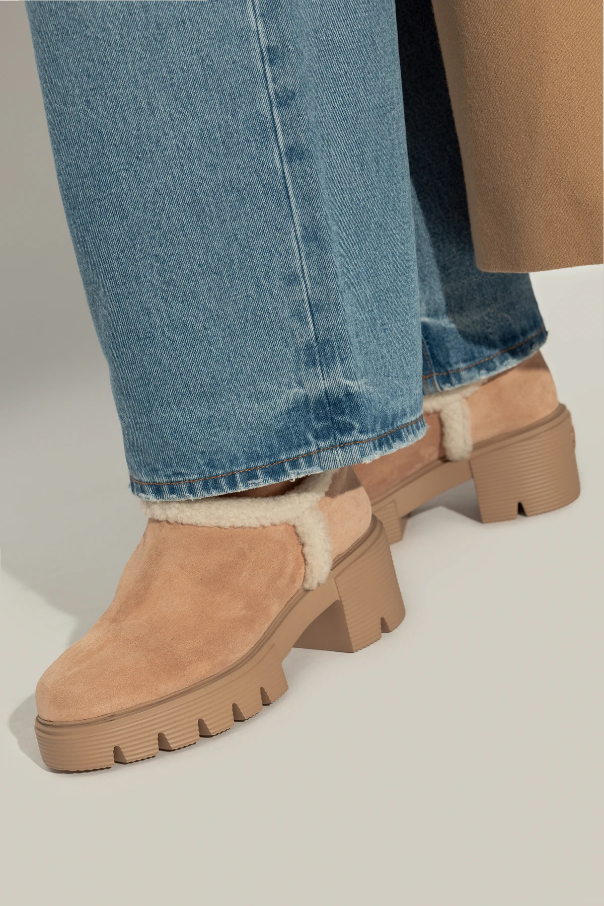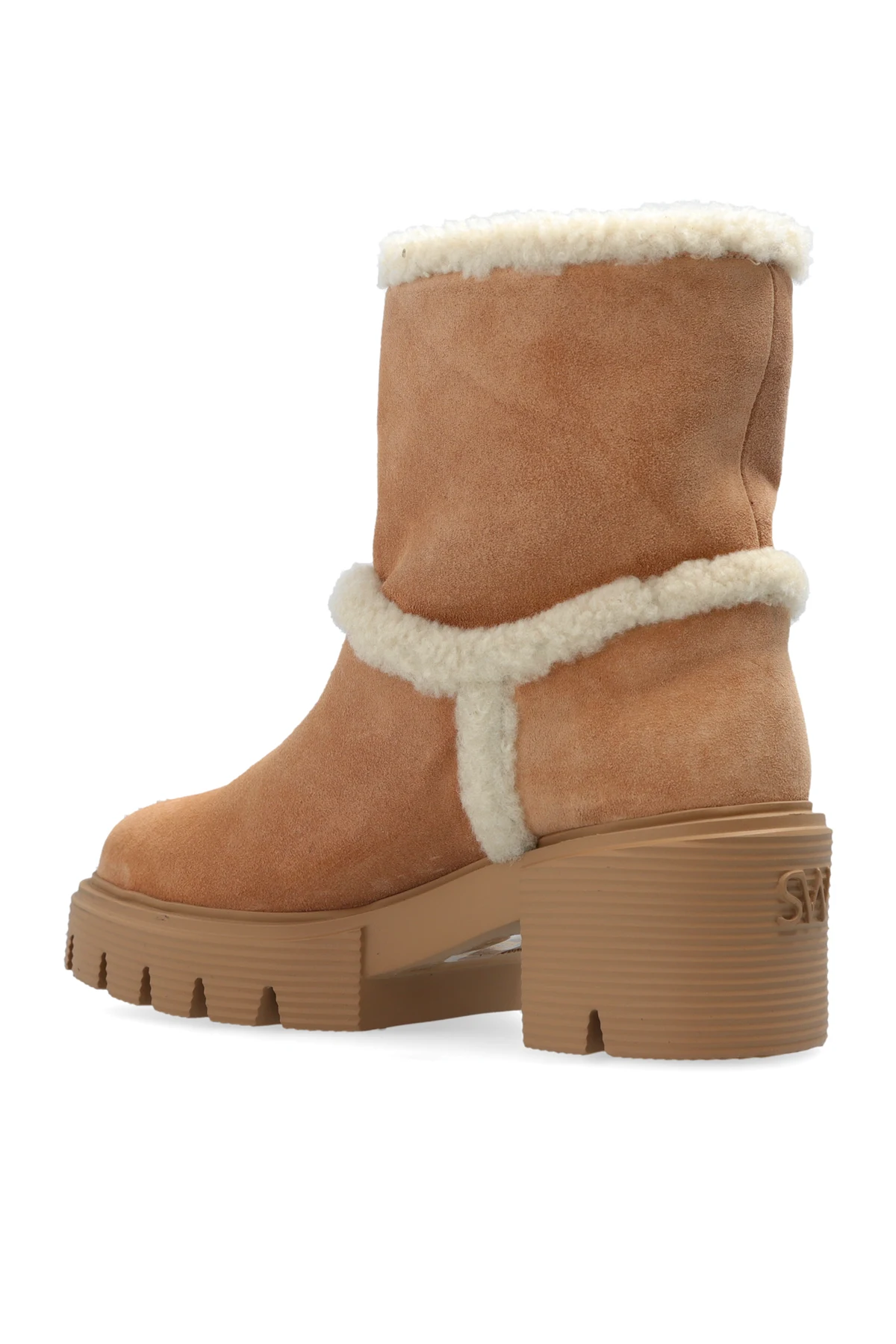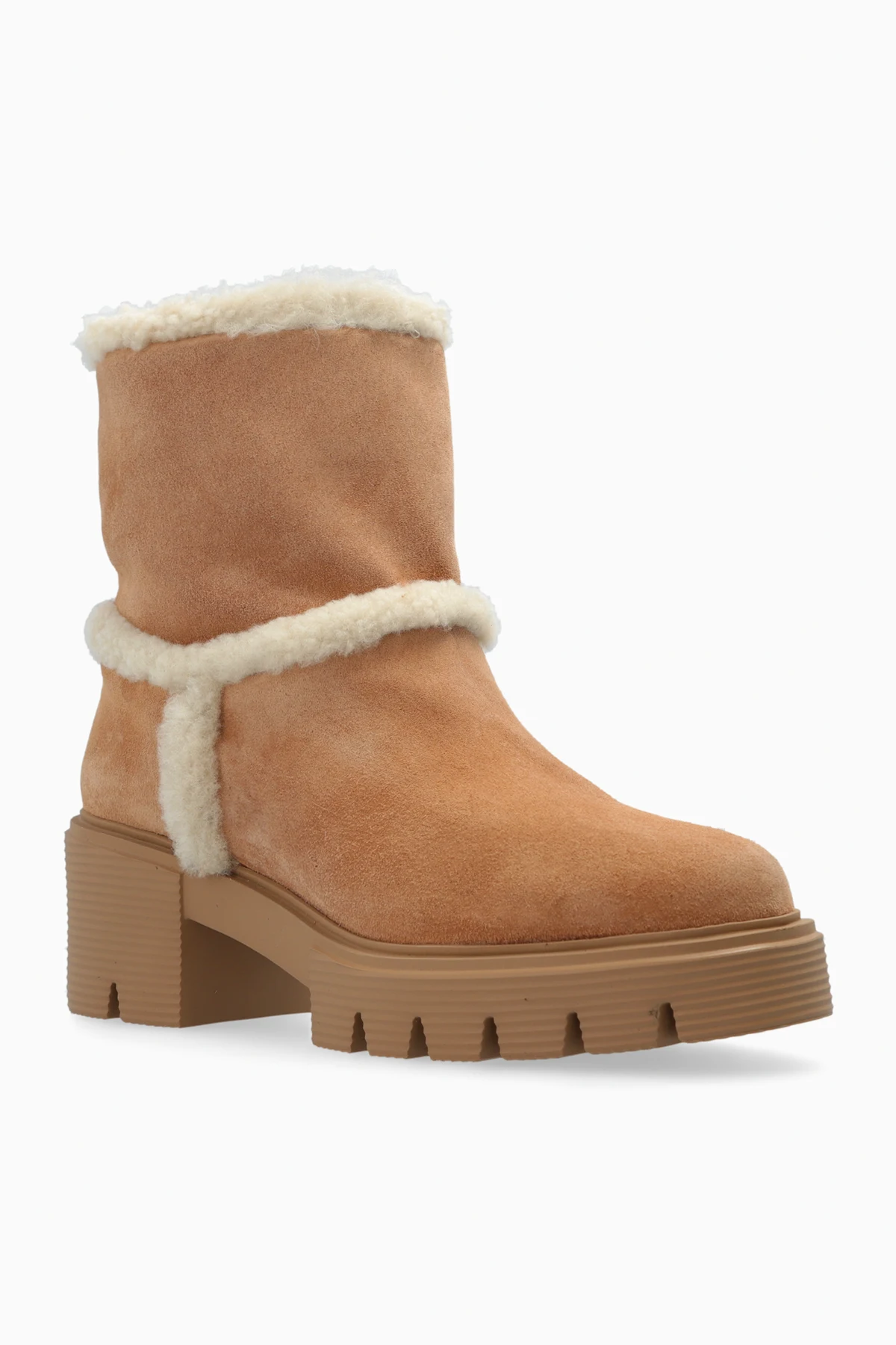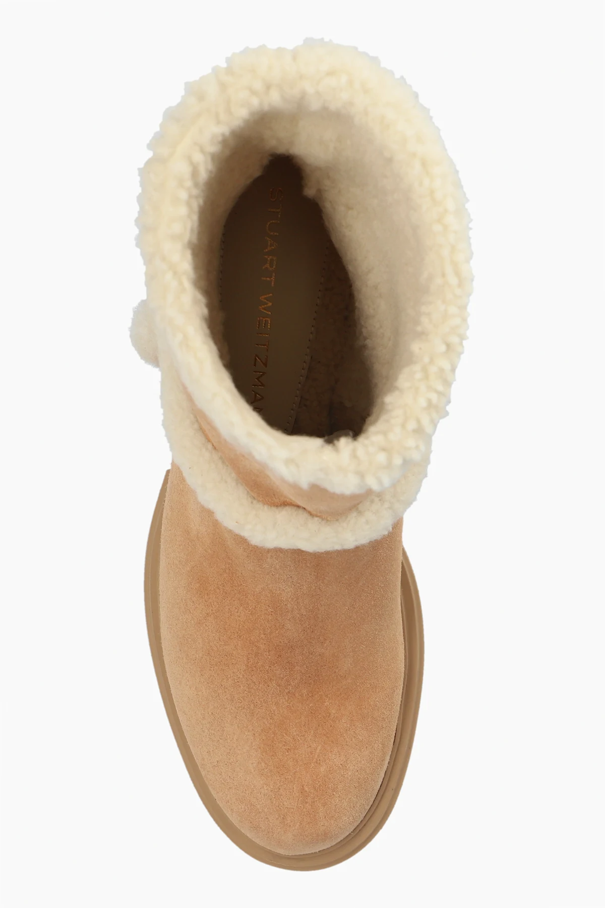 Introducing the Lennox ankle boots from Stuart Weitzman, a paragon of elegance and comfort from our exclusive collection. These beige suede women's boots are a sublime fusion of style and practicality, making them an ideal choice for cooler days. The soft suede exterior, accentuated by the white fur trim around the top and across the boot, exudes an inviting warmth and coziness. The boots feature a chunky, grooved brown rubber sole for enhanced stability and comfort. Inside, they are luxuriously lined with white fur, ensuring your feet remain warm and snug. Design details include the designer’s logo subtly embossed on the heel, adding an extra touch of distinction. The Lennox boots boast a casual yet sophisticated look, ideal for elevating your everyday ensemble. Why Choose This Product? Elegance and Comfort: Crafted from high-quality suede with plush fur lining. Enhanced Stability: Features a thick, grooved rubber sole for superior grip. Designer Appeal: Showcases Stuart Weitzman's renowned craftsmanship and attention to detail. Versatile Style: Perfect for casual and sophisticated looks.