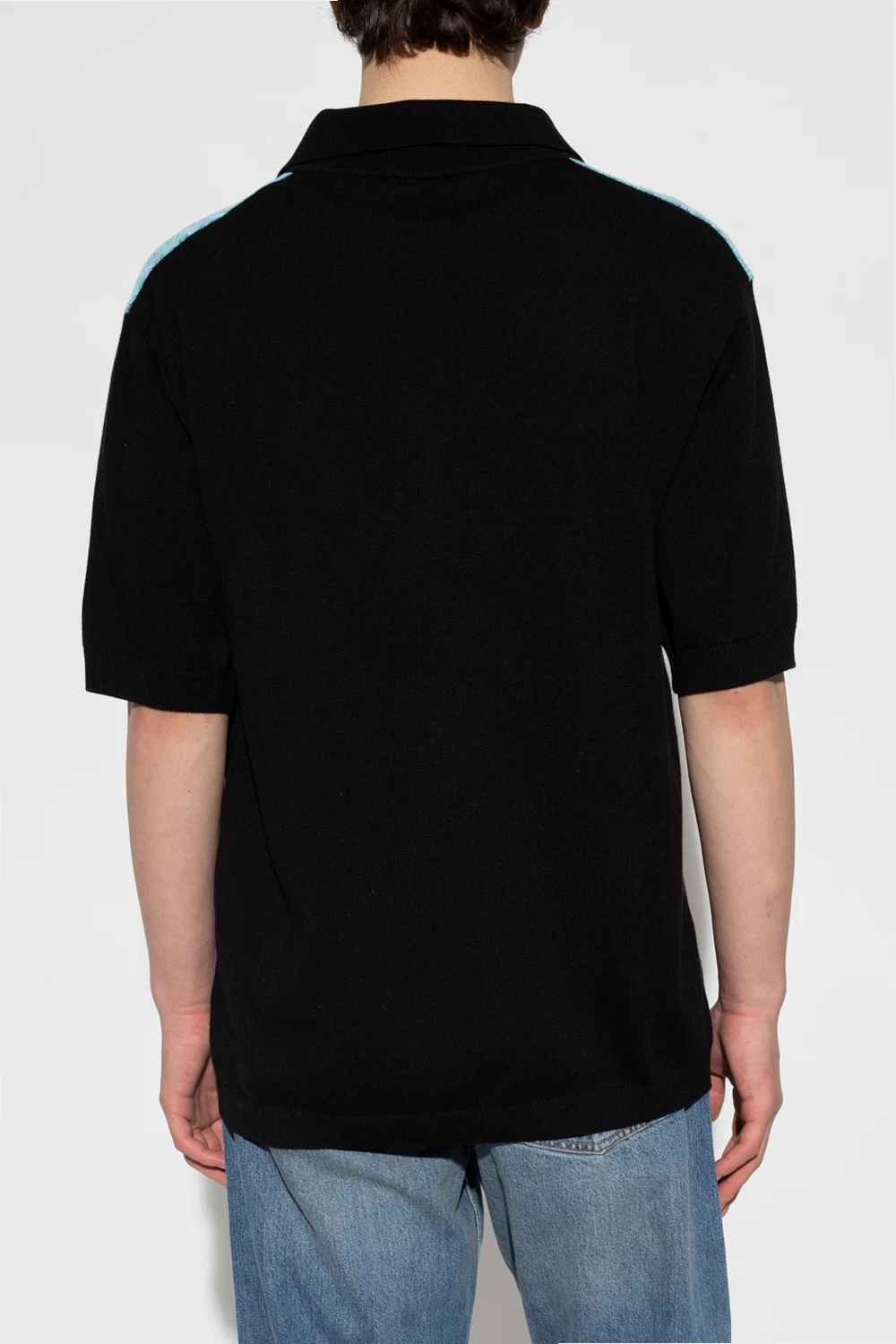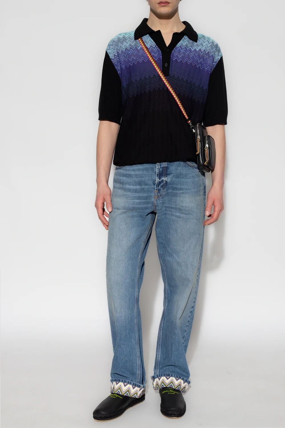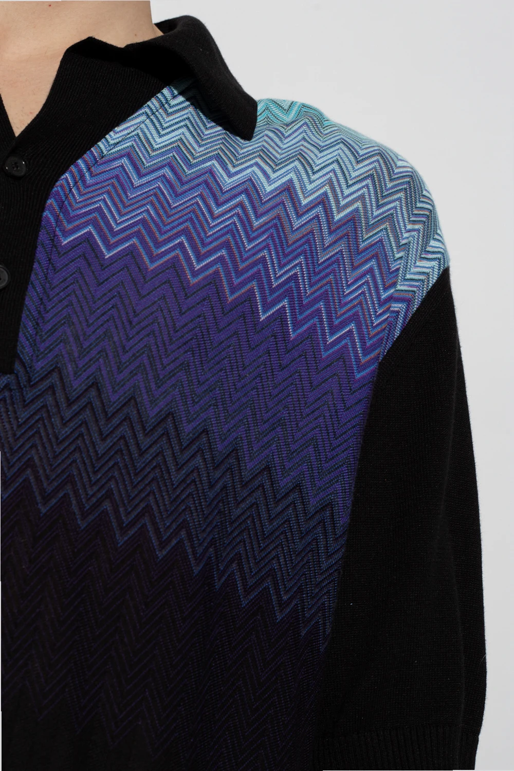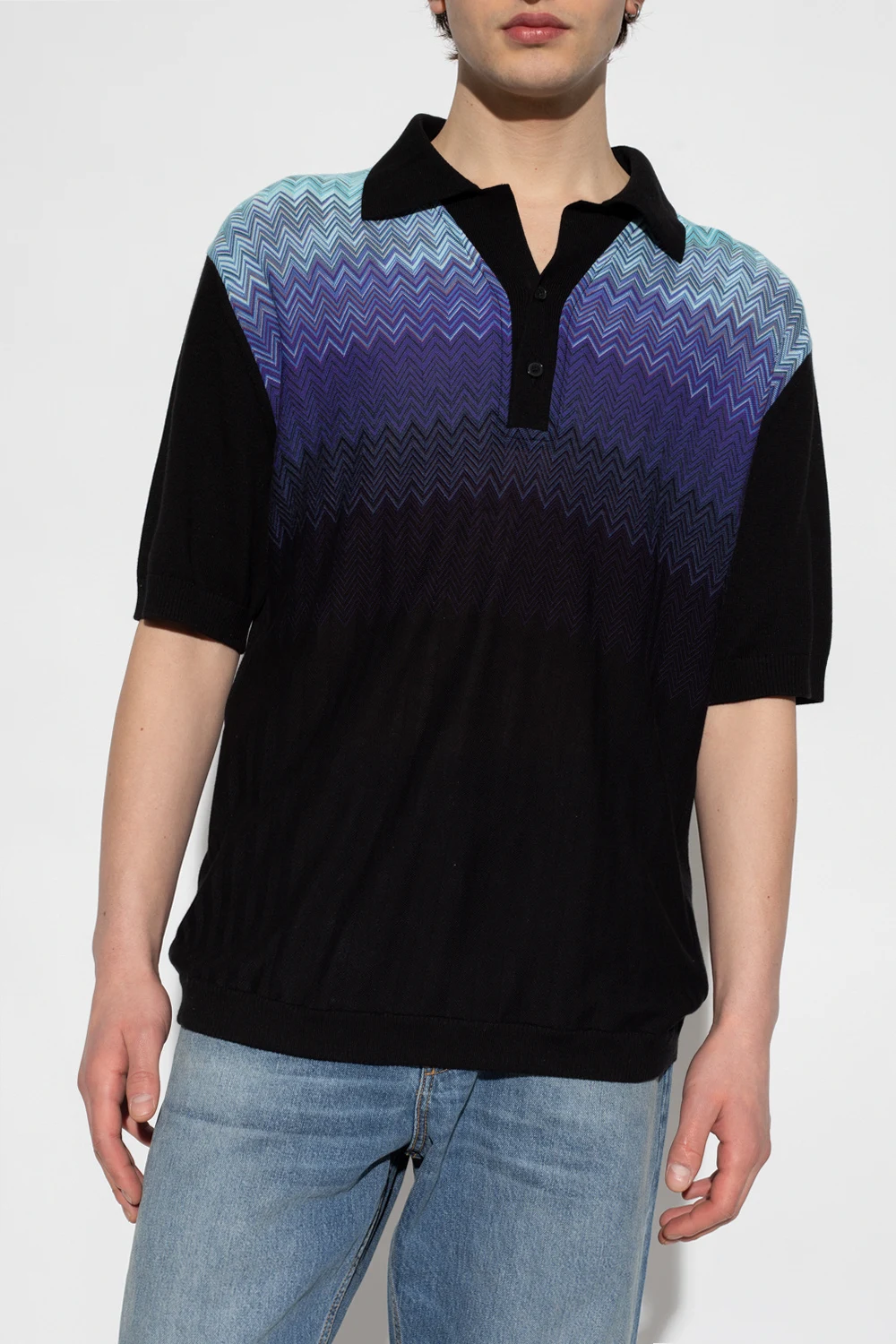 Black polo shirt from Missoni. Crafted from a cotton and silk blend, this style fastens with buttons and showcases the brand's signature zigzag motif in blue, purple and navy blue. It is complete with ribbing on the short sleeves and hem.