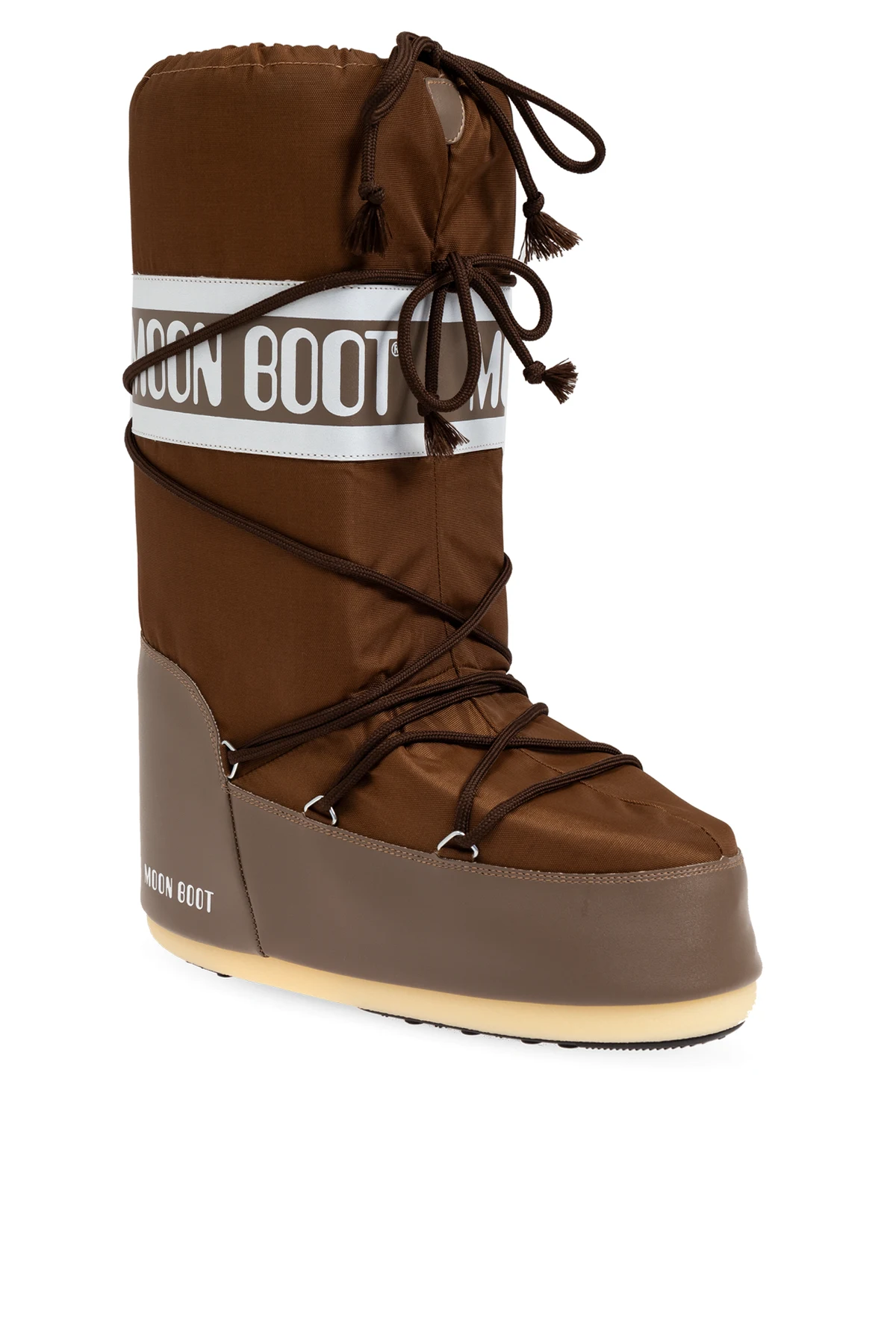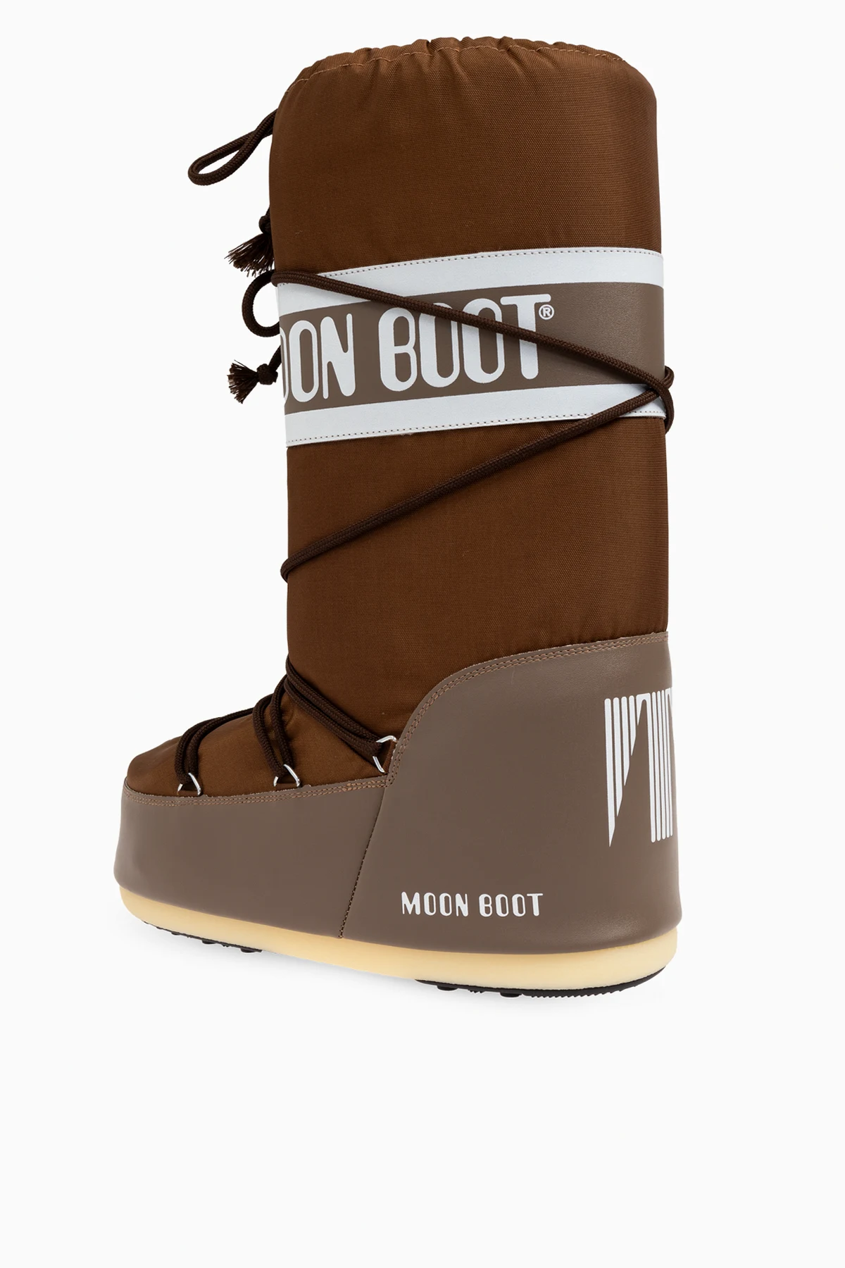 Introducing the exquisite ‘Icon Nylon’ Snow Boots from our exclusive collection. These elegant brown boots are designed to provide exceptional protection and style for the discerning winter enthusiast. Kształt i Konstrukcja: These snow boots feature a classic, high silhouette that extends above the ankle, ensuring comprehensive protection against snow. The robust, slightly rounded sole provides both stability and comfort. Materiał: The upper is crafted from premium nylon, offering lightweight durability and resistance to harsh weather. The lower sections, including the heel and sides, are made from high-quality synthetic material in a matching brown tone, enhancing moisture protection. Wzór i Detale: A wide, white stripe emblazoned with the ‘MOON BOOT’ logo encircles the ankle, creating a distinctive brand mark. The lacing system, featuring long laces that wrap around the boot in multiple locations, ensures a snug fit. Logo: The ‘MOON BOOT’ logo is prominently displayed on both the white ankle stripe and the lower side of the boot, emphasizing the brand's prestigious identity. Dodatkowe Informacje: The boots are equipped with light-colored rubber soles, providing excellent traction on slippery surfaces. Designed for comfort in winter conditions, they are the ideal choice for snowy days. Why Choose These Boots? Elegant and functional design High-quality nylon and synthetic materials Distinctive ‘MOON BOOT’ branding Excellent traction and stability Superior comfort in cold weather