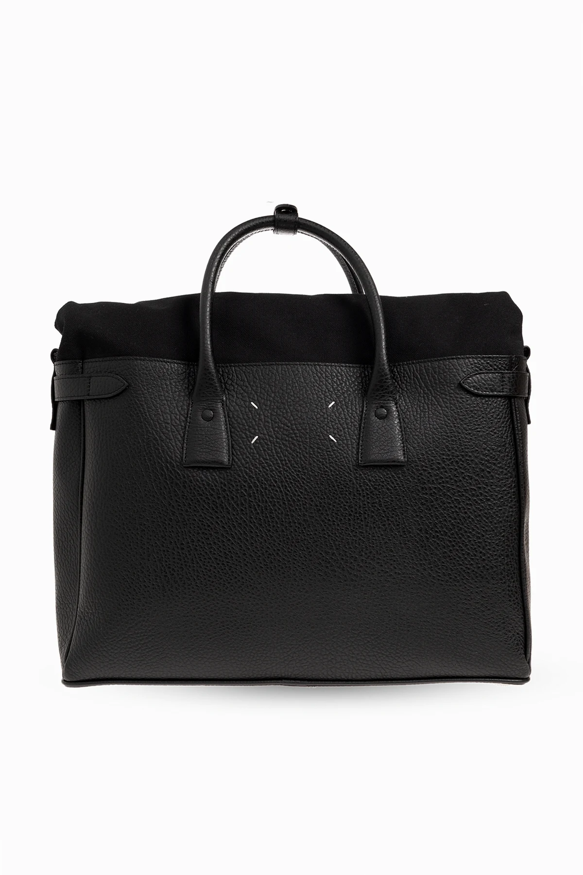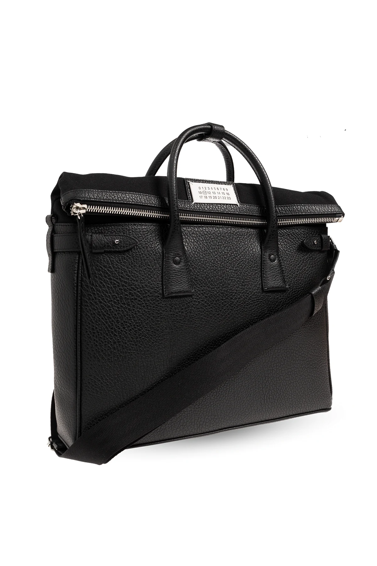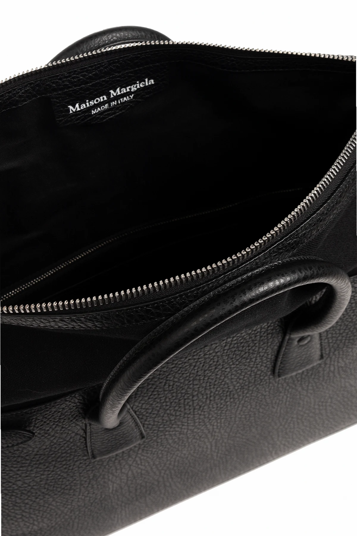 Black ‘5AC’ shoulder bag from Maison Margiela. Made of grained calf leather and trimmed with cotton, this design fastens via a zip and showcases a white logo patch, the brand's signature white stitches on the back, two half-round handles as well as a detachable and adjustable shoulder strap, silver-tone metal hardware and one internal compartment with one slip pocket, one zip pocket and one snap-fastened pocket.
