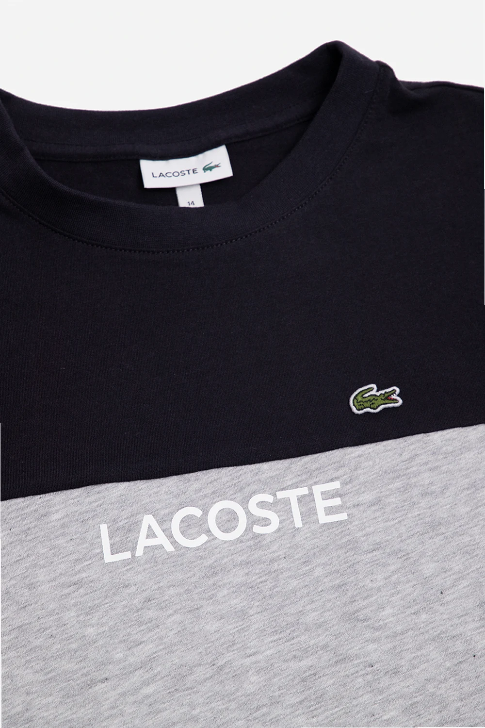 Grey and black T-shirt from Lacoste Kids. Made of cotton, this short sleeve design features a print, logo patch and ribbed crew neck.