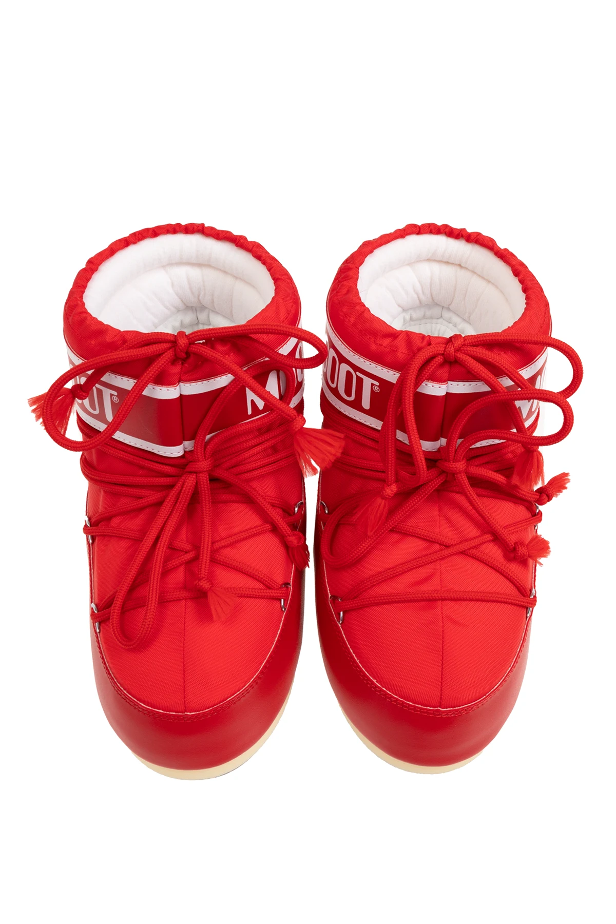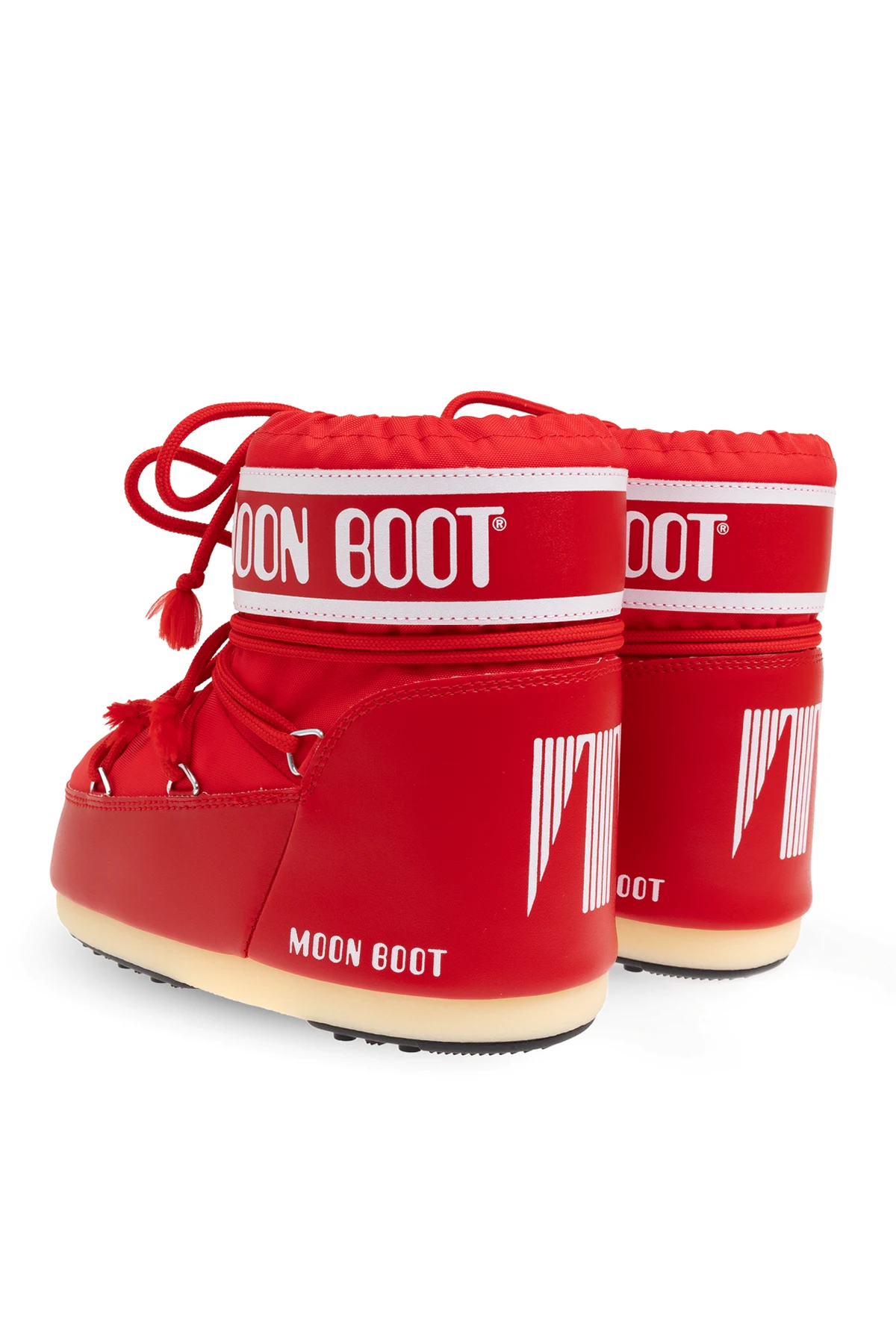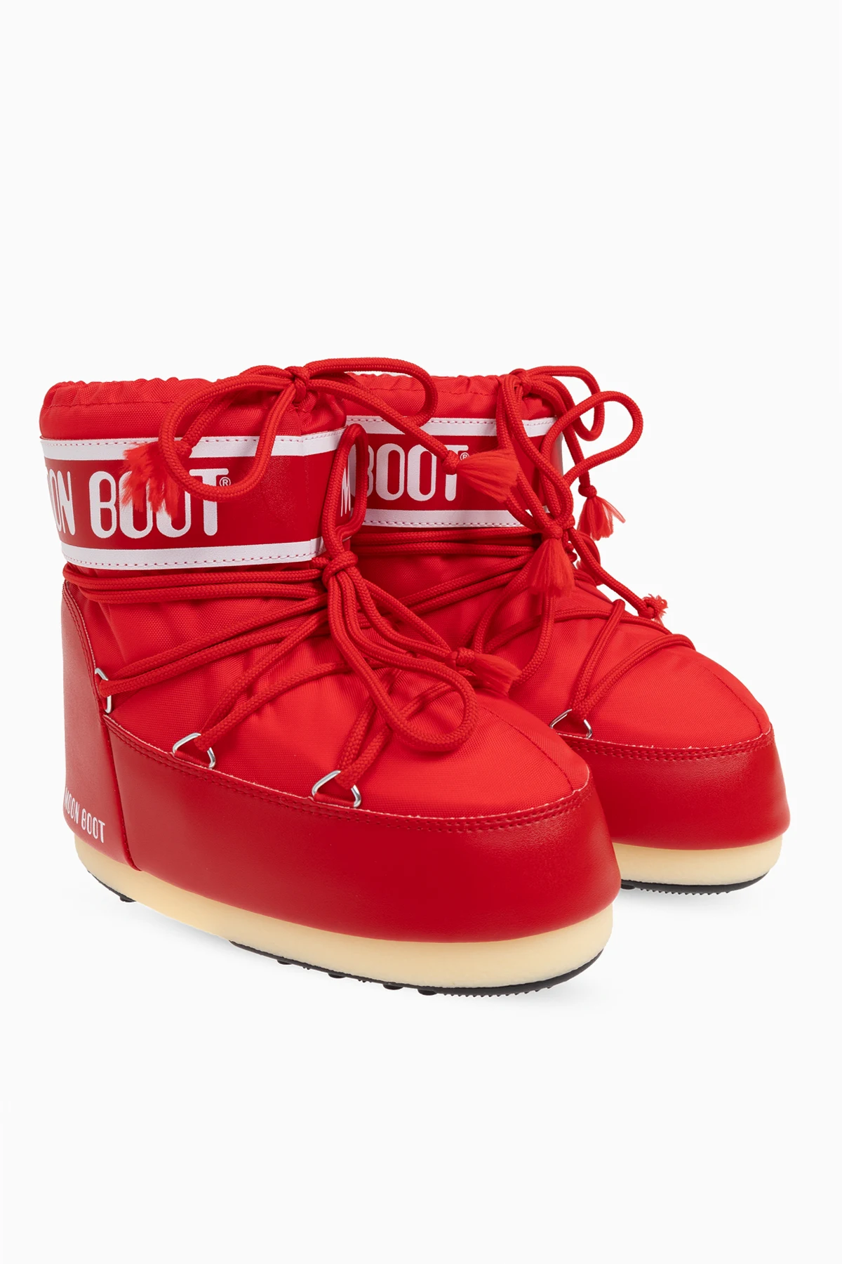 Introducing the exquisite Icon Low Nylon Snow Boots from the prestigious Moon Boot Kids collection. These boots, crafted for the discerning young adventurer, blend robust functionality with a striking aesthetic. Constructed from durable nylon with shimmering synthetic accents, these vibrant red snow boots promise resilience against the harshest of winter conditions. The high-top design, extending above the ankle, ensures enhanced protection and warmth. Notable design elements include metal eyelets with adjustable laces, providing a snug fit, and a distinctive wide strap emblazoned with the iconic white "MOON BOOT" logo against a red backdrop. The white sole and decorative vertical stripes on the back add a touch of elegance and contrast to the overall design. Designed with children in mind, these boots feature an anti-slip sole for safety on icy surfaces, making them an impeccable choice for snowy adventures. Why Choose This Product? Striking red color with bold "MOON BOOT" branding Durable nylon construction for weather resistance High-top design for superior warmth and protection Adjustable laces for a customized fit Anti-slip sole for safe winter activities