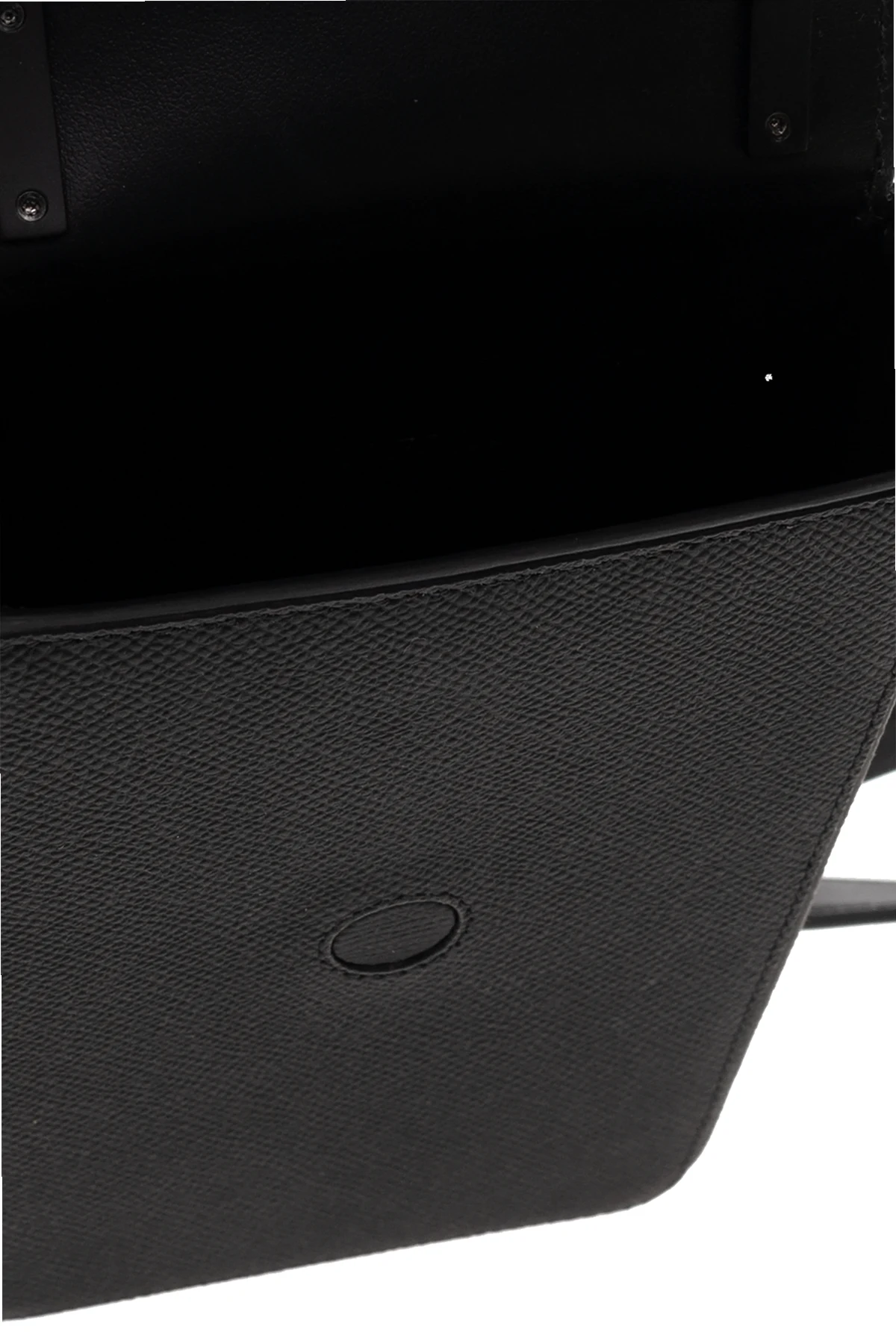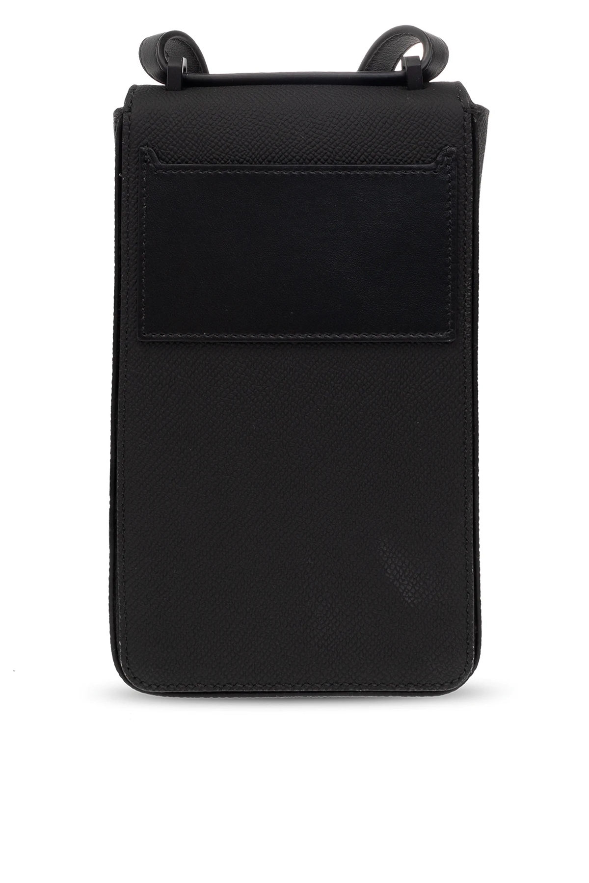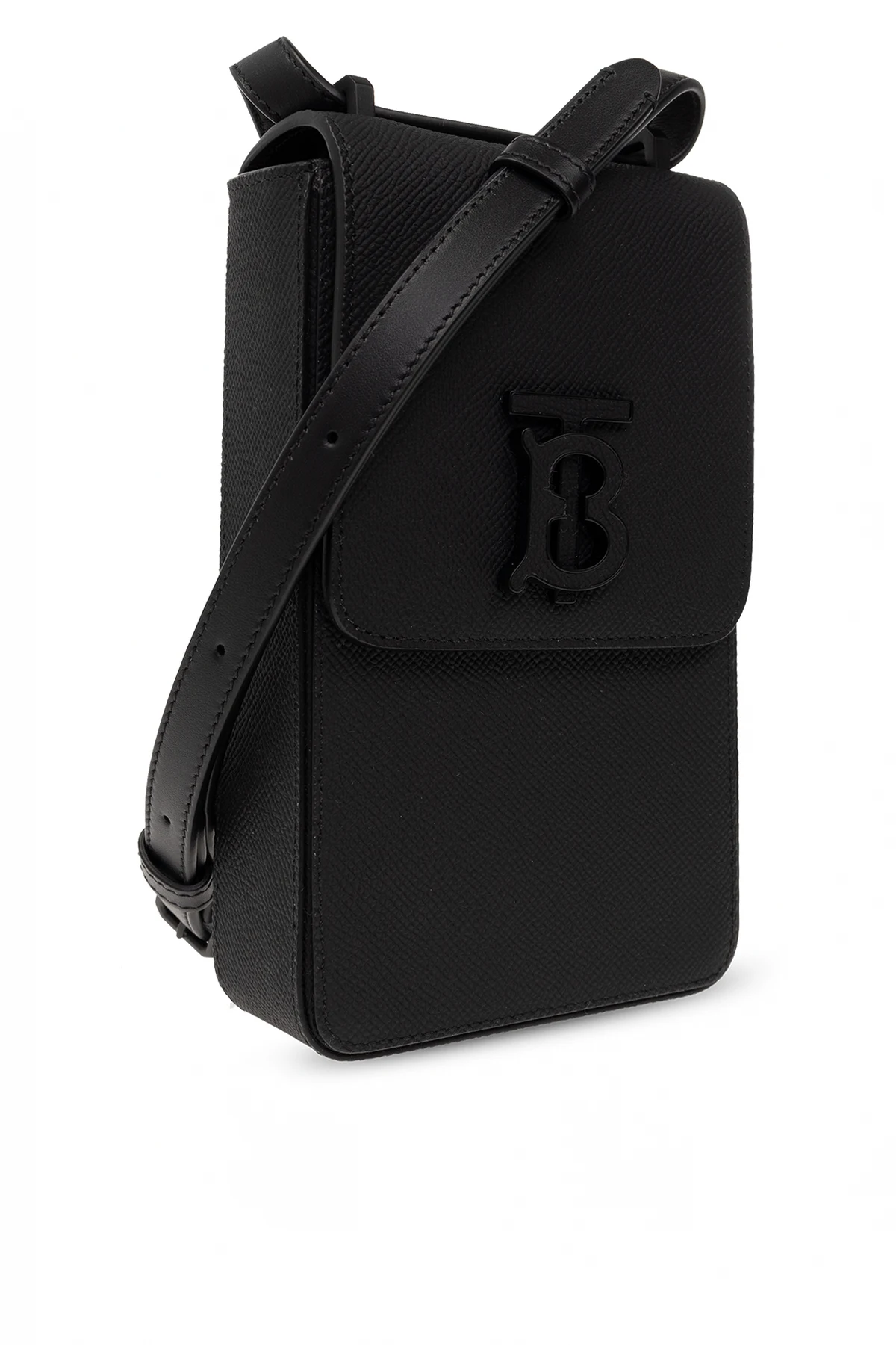 Black phone holder from Burberry. Crafted from grained calf leather, this item secures with a magnetic fastener and features a logo plaque on the front, one back card slots, adjustable shoulder strap and one internal compartment.