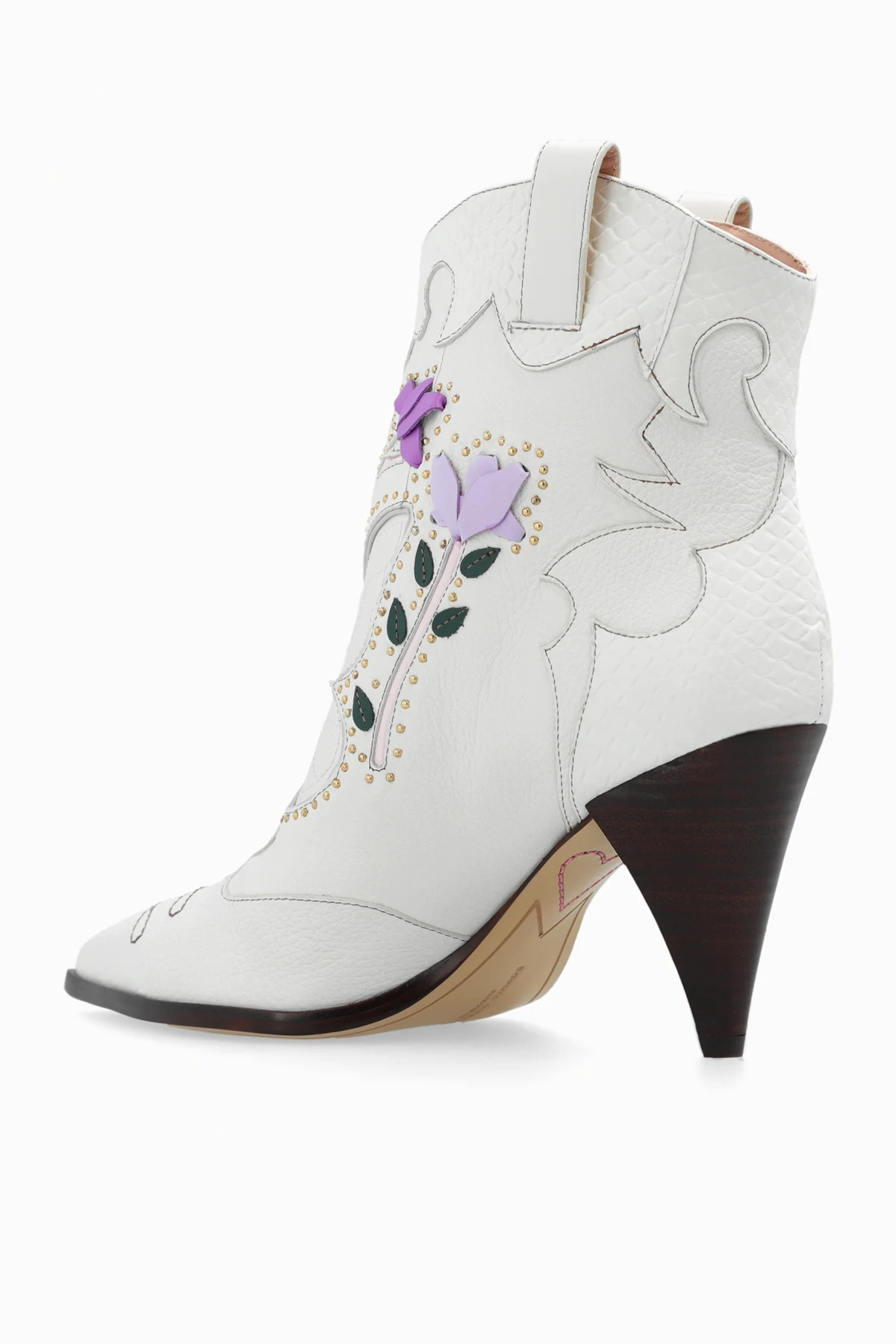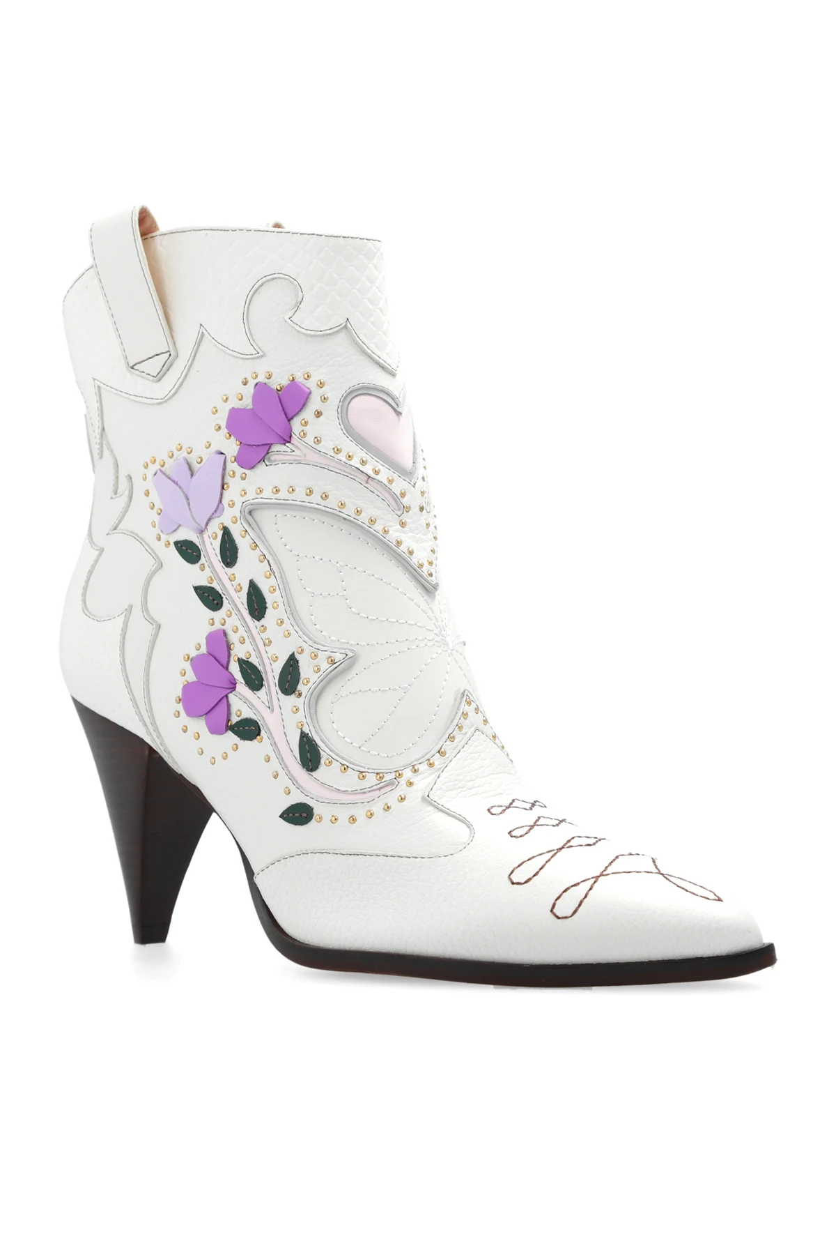 White ‘Shelby’ heeled slip-on cowboy boots from Sophia Webster. Made of leather, this pair features multicolored floral, heart and butterfly pattern, gold-tone studs, pointed toe and beige leather sole embroidered with a heart pattern.