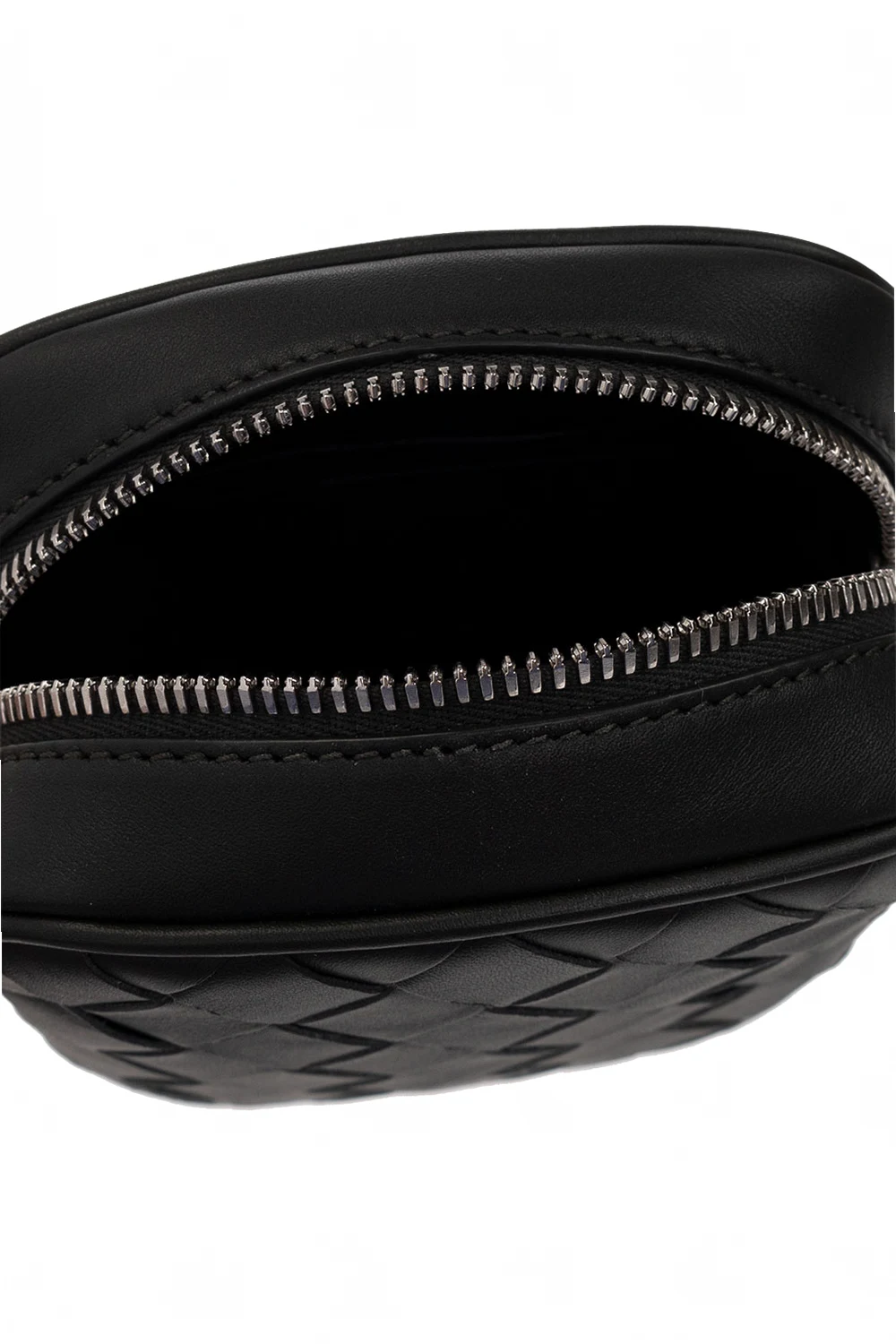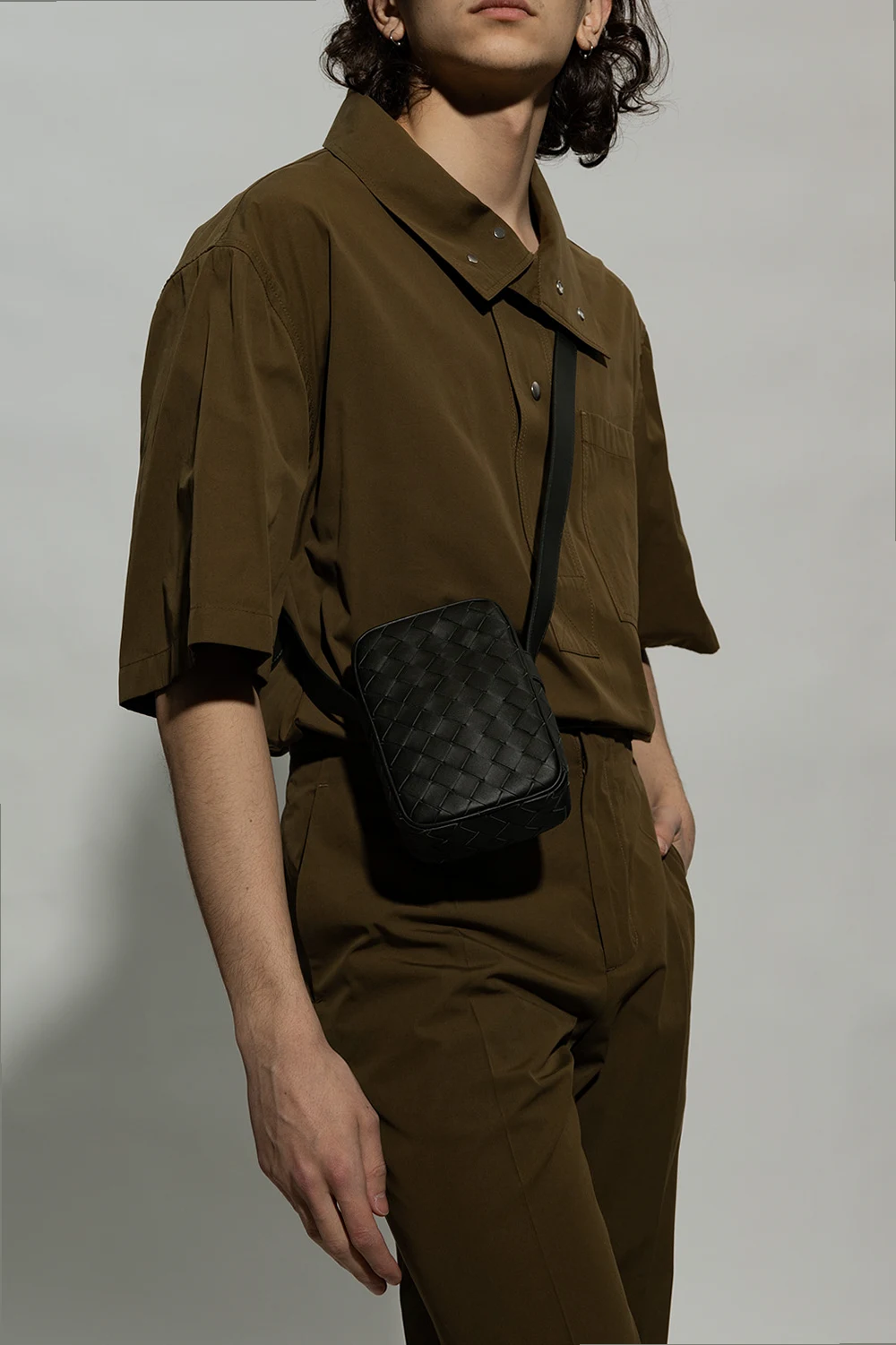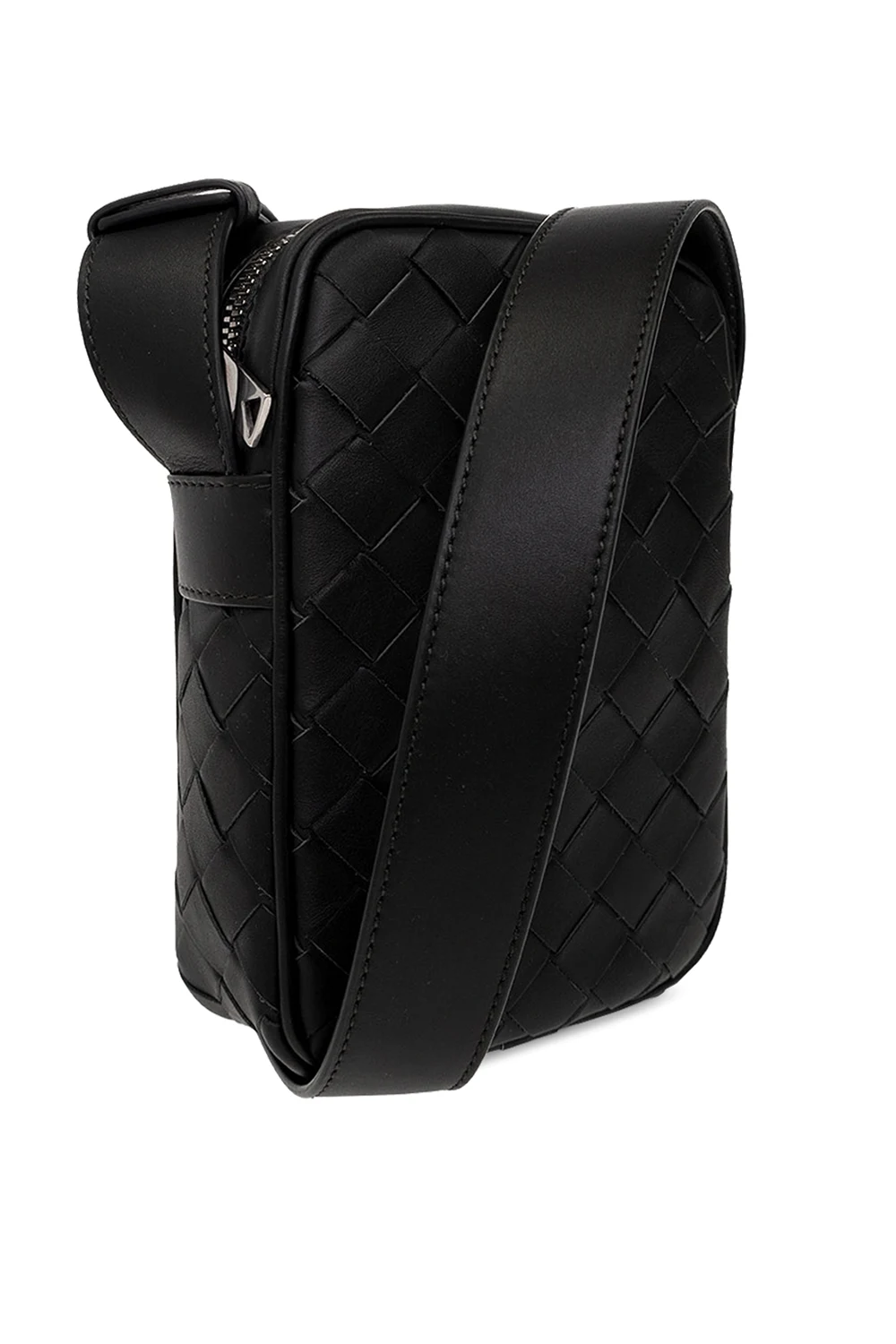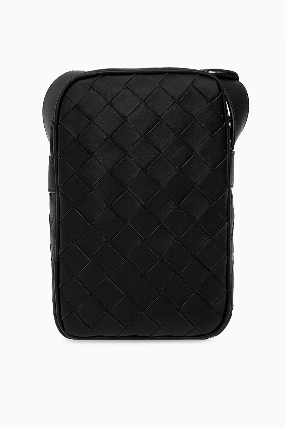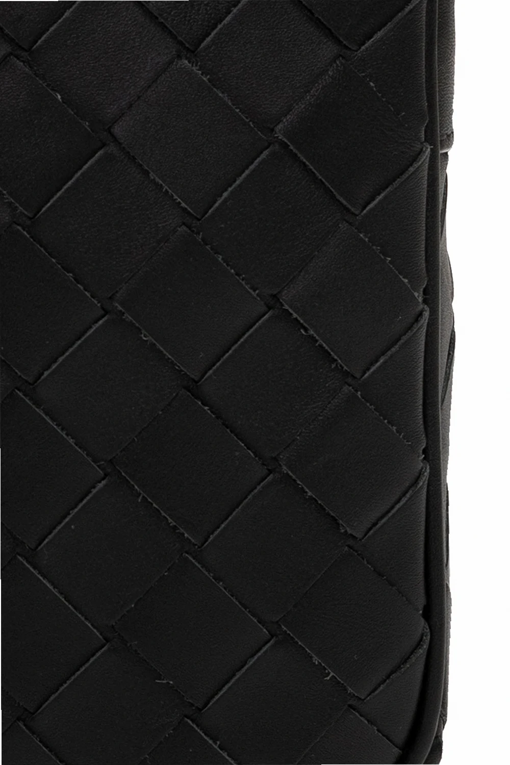 Dark green phone holder from Bottega Veneta. Crafted from calf leather with the brand's signature ‘Intrecciato’ weave, this design fastens with a zip and features an adjustable shoulder strap and three card slots inside.