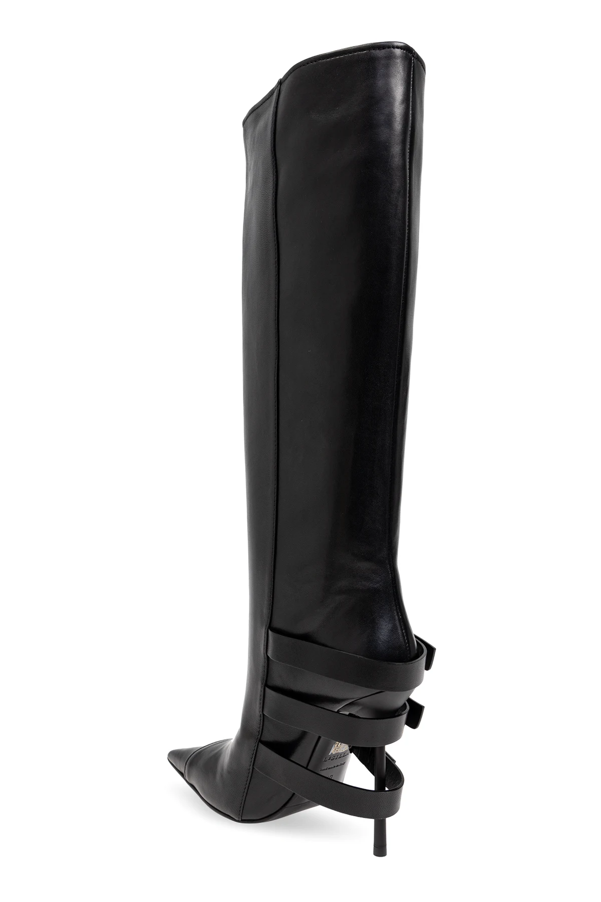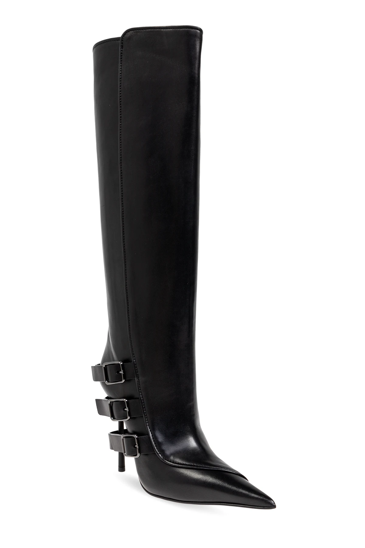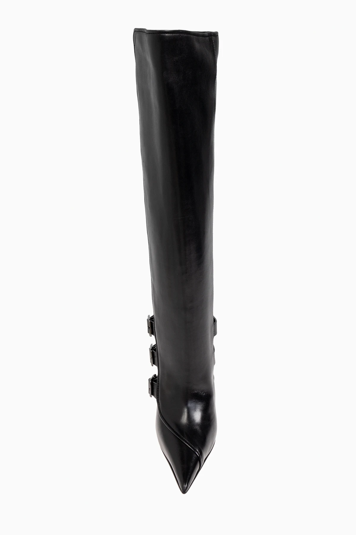 Introducing the exquisite black boots from the esteemed designer Le Silla. These 'Courtney' boots epitomize luxurious elegance and meticulous craftsmanship, making them a standout addition to any discerning wardrobe. The boots boast a high, graceful silhouette that extends nearly to the knee, accentuating the legs with their sleek, form-fitting design. Fashioned from smooth, glossy leather, they exude an aura of sophistication and durability, promising both comfort and longevity. Distinctive details include three straps with metal buckles adorning the lower portion of the shaft, positioned on the outer side for a bold statement. The pointed toe enhances their elegance, while visually elongating the legs. Complemented by a thin, high stiletto heel, these boots offer a sensual and refined appeal, ensuring stability and balance for comfortable wear. Designed to seamlessly blend elegance with practicality, the ‘Courtney’ boots are versatile enough for both formal events and more casual ensembles. Their stylish accents and premium quality set them apart, making them an essential piece for any fashion-forward individual. Why Purchase These Boots? High, elegant silhouette that flatters the legs Luxurious leather construction for a sophisticated look Bold decorative straps with metal buckles Pointed toe for added elegance Stable and balanced stiletto heel Versatile design suitable for various occasions