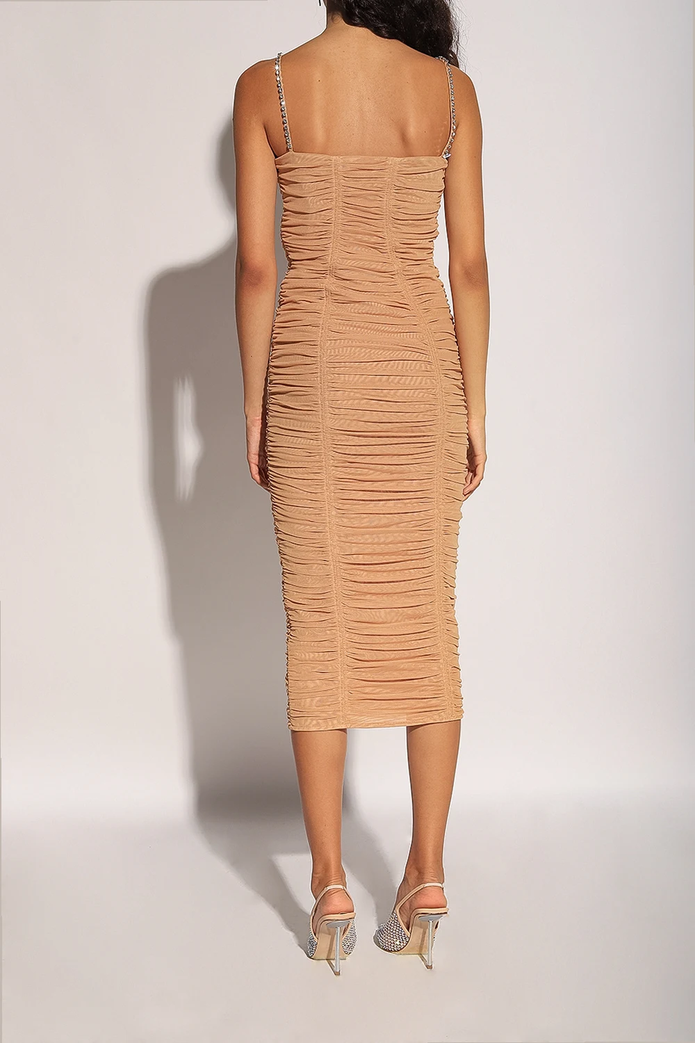 Beige dress from Self-Portrait. Distinguished by gathered details, this style features a hidden zipper on the side and decorative glossy shoulder straps.