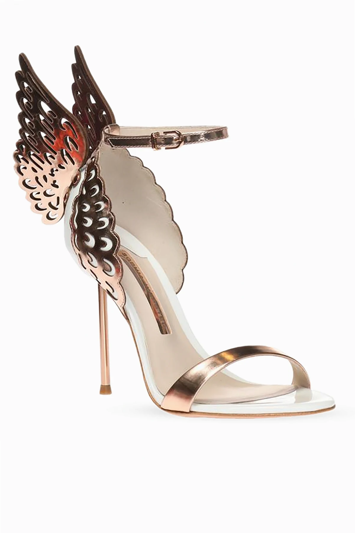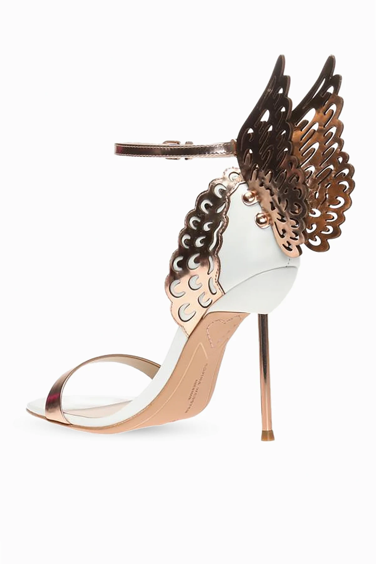 Beige 'Evangeline' stiletto-heel sandals from Sophia Webster. Made of leather. Fastened on the side with a buckled ankle strap. Decorated with inserts featuring the brand's signature angel wing motif in rose gold-tone. Beige leather sole.